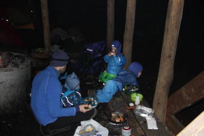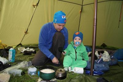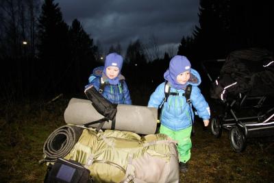 Etter noen forsøk på turer i sommer, lite tid, tidvis trassige unger osv... Fikk jeg endelig til en tur!! Kona hadde tatt på seg en ekstra nattevakt og skulle være hjemme på mandag og kunne da ha minstemann (10mnd) (jeg er i pappaperm). Værvarselet var ikke så ille så da bestemte jeg meg for å ta med tvillingene på tur. Planer var det lite av så vi bare pakket sekken og tok med middagen opp i skogen. Her jeg bor er det ikke så langt, bare noen hundre meter, men vi tok vogna det første stykket opp til der stien begynner. Vi parkerer vogna og gutta bærer egen sekk! Fra vogna er det kanskje 300 meter opp til lokale Grillhytta og kveldens mål. Gutta syntes det var stas med egen hodelykt. Og jammen dukket ikke mamma og Mini opp også for å spise middag. laks stekt i panna på bål med ris og rømme falt i smak. Gutta syntes det var morro med teltet og egene soveposer. Jeg hadde med et par bøker og 2 puslespill som fikk mørketiden til å gå etter at mamma tok med seg mini hjem. Etter masse turning i teltet, rosiner, kjeks og tannpuss fikk jeg de ganske greit til å sove. Det var litt uenigheter om hvem som skulle ligge hvor, helt til jeg to styringen og la meg i midten og latet som jeg sov. Når det var stille i teltet kunne jeg snike meg ut, blåse liv i bålet og nye stillheten en stund før John Blund kallet. Dagen etter kunne vi gå rett ned i barnehagen og fortelle at vi hadde sovet i telt. Jeg og Kona tok med minstemann på klatreverket og fikk kost oss i veggen. Effektivt døgn Etter mange store planer om unger på tur de siste årene, var det godt å få til noe som funket. Det har vært mange drømmer, et par gode turer og mange type dra ut sette opp teltet innse at dette orker jeg ikke vi drar hjem turer, type pakkesekken stå klar i døra ungene hyler pakke ut og bli hjemme turer, type dra med seg 3 hylete småsjuke unger langt opp i Utladalen og sove i lavo turer og type bittesmå unger i lavo tidlig om våren bli usikker på om det er for kaldt og gå hjem midt på natta turer. Satser på noen godt planlagte turer, noen spontanturer og gradvis øke ambisjonene turer fremover.