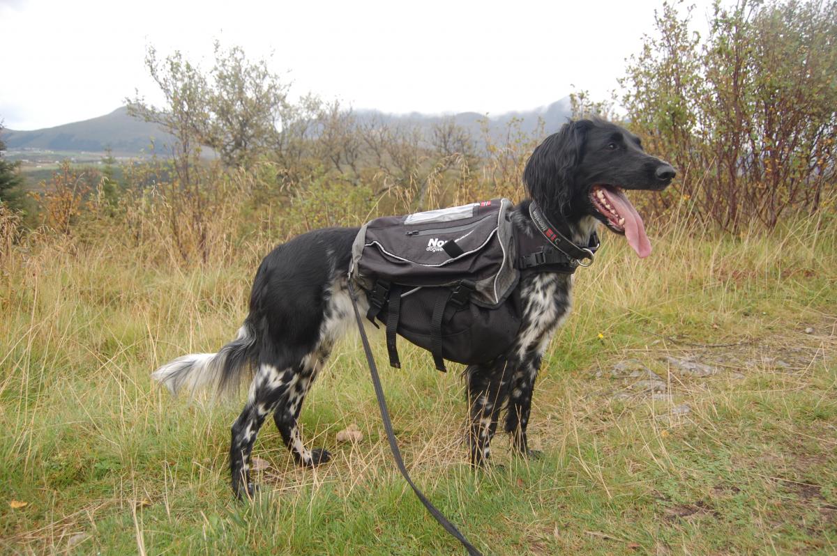 Hunden min med kløven, bare noen brusflasker på hver side, ikke fullpakket. Det ble en Non Stop kløv til fuglehunden min. Kjøpte den i sommer. Har bare brukt den på kortere turer så langt, men den sitter ganske stabilt. Selv om hunden ruller seg med den på, så ligger den tilbake på riktig plass når hun har reist seg igjen. Fungerer sånn passe til å trekke med, men kunne gjerne vært en Y-sele for å forhindre så mye press på luftveiene. Synes det er ganske god plass i veskene, men har ikke sammenlignet med andre kløver. 2 store lommer på sidene, og flere små lommer oppå. Virker solid i stoffet/materialet så langt. Minus: som noen har nevnt før meg, at den må tres over hodet til hunden siden den ikke kan åpnes helt foran. Også at det ikke er Y-sele bryst på den.