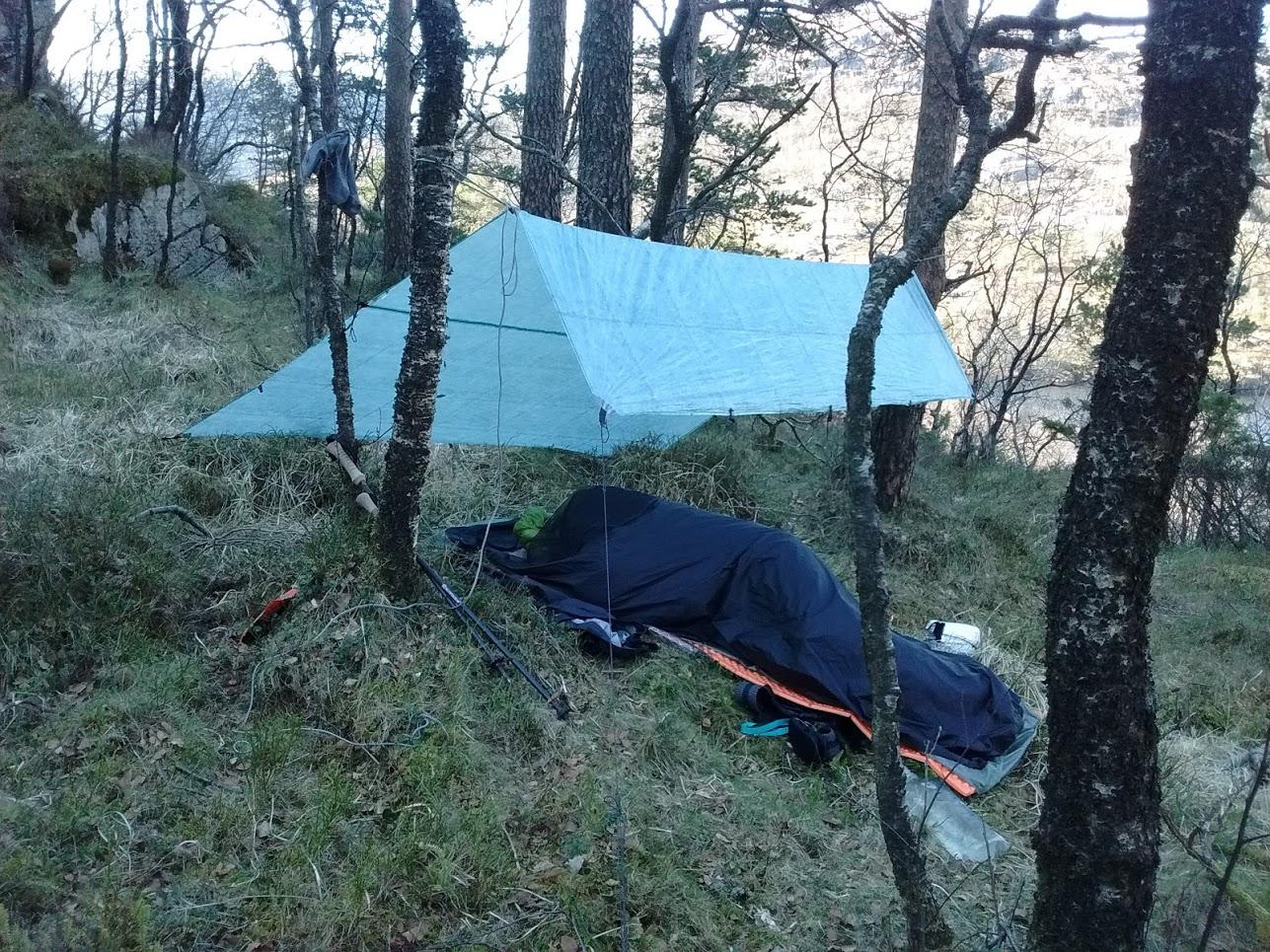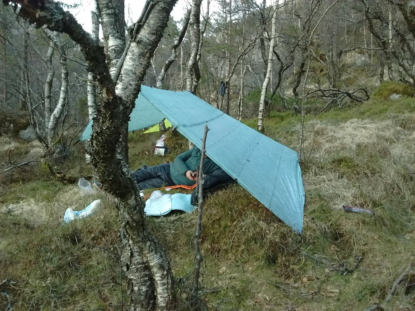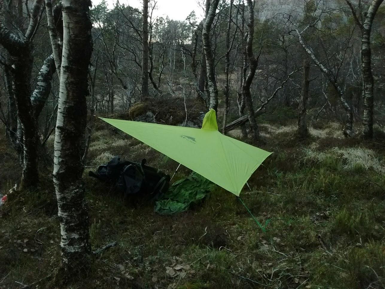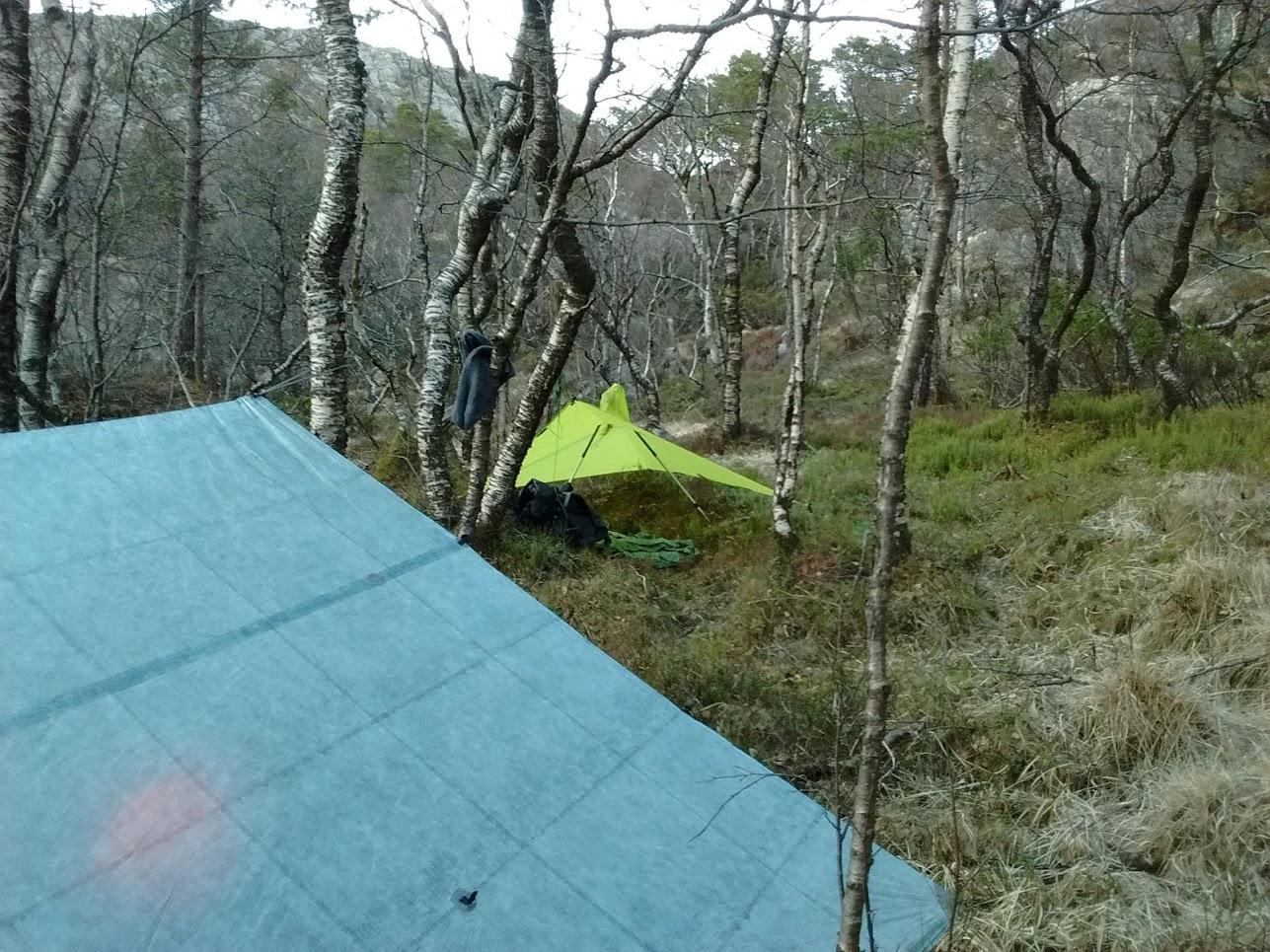 Som det framgår av @ost's oversikt, så er min tarp aller aller best, gitt dine ønsker (e.g. untatt pris). 2.65mx2.65m, 241 gram (men kan kutte noe ved å fjerne i alle fall 6 line-locs). Bombesikker cuben-tarp med 21 bardunfester. Bilder fra tur sist uke: