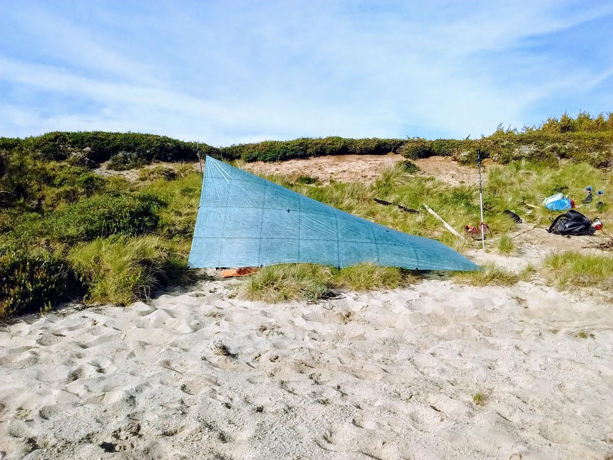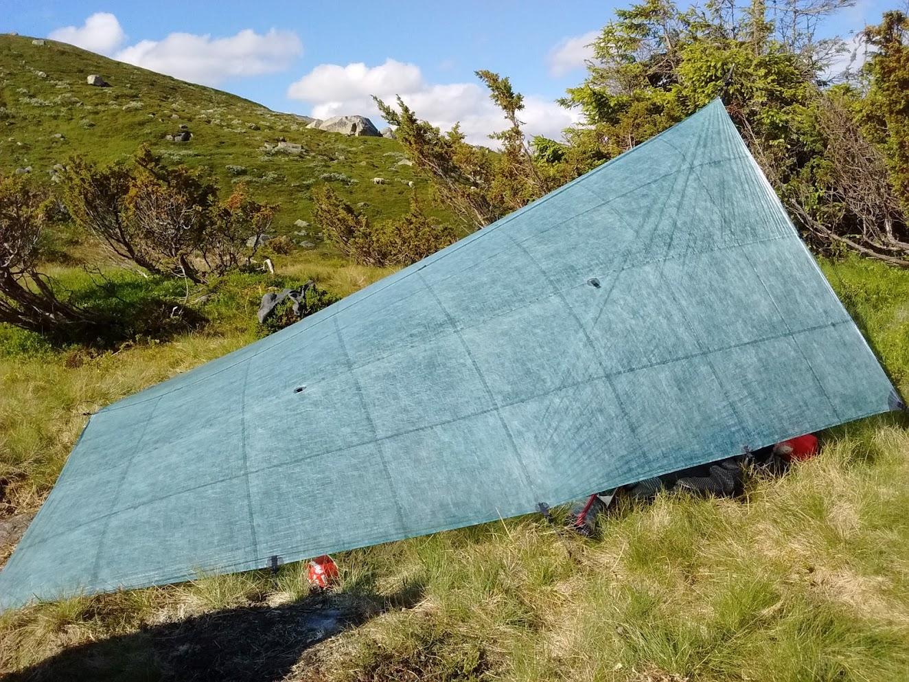 Som proof of concept deler jeg med @hllnd's velsignelse noen av hans bilder fra forrige helgs fisketur i Myrlandsheia: Friske fraspark fra hans side, som stilte hele helga utelukkende med 3F-poncho-tarpen (netto 203g). Undertegnede feiget ut og dro på blytung cuben-tarp (298g inkl. barduner): Dag 1, godt skjermet inni skogen oppi ei li: Åpne tarper som ekstra vindskydd, og sånn bare i tilfelle det skulle dryppe: Dag to, mere utsatt i en vindtunnel mellom to fiskevann, "storm-mode/half-pyramid": Fin tur i strålende vær -- deilig med barmark, og alltid kjekt med tarp i to stjerneklare netter.