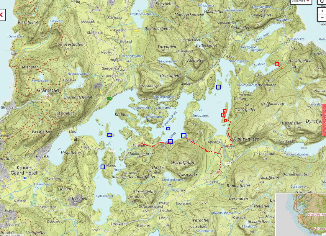 OK da, ad Lutsi: Generelt -- dersom man har kano eller kajak -- er Lutsi et eldorado hvor man egentlig kan finne teltplasser omtrent rundt hvert eneste nes og holme. Til fots er det adskillig vanskeligere, om man ikke er veldig glad i å slåss seg gjennom krattskog.. poenget med Lutsivassdraget er jo at selv om det for hytteeiere er paradis på jord, er det for oss vanlige dødelige litt vanskelig å finne fine plasser: Hele nordsiden av vassdraget er stort sett tett i tett med hytter: Her er det fjell i ryggen mot nordavinden, og åpent mot sol fra sør. Sørsiden av vassdraget er langt mere glissent bebygd, men desto mere vind og skygge, også mye tett skog som skygger for sola. Jeg har mange ganger campet med kano i juli på sørsiden, med kone og barn, med to lag ull og vindtette regnjakker hele dagen, mens vi kan skimte det lovede land på nordsiden, hvor hyttefolket bader og ligger og soler seg... Husk forøvrig at Lutsi knapt er "villmark"; særlig i sommersesongen kan det være mye ungdommer med heftige anlegg som fester til langt på natt i hyttene på nordsiden. Fred og ro får man finne i Femundsmarka. Et lite utvalg av fine/OK teltplasser: Blå områder er (lettest) tilgjengelig med kano, røde områder er OK å gå til. Den lengst øst er nesten rett ved veien, lett tilgjengelig. De tre stedene på langholmen er ca. 30 minutters gange fra veien.