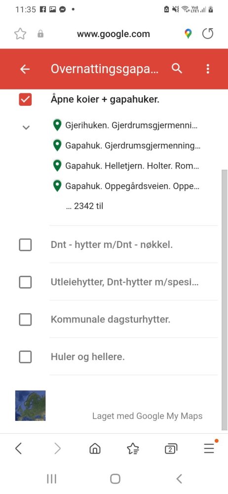 Husk at det nå er 2 lag. Det ene er Dnt sine hytter med nøkkel. Dette laget kan man klikke bort/legge til ved behov. Her er kartet: https://www.google.com/maps/d/edit?mid=1zqVpeAFh371N7jWLG8Gw9YMmAM-7vzPW&usp=sharing- 192 svar