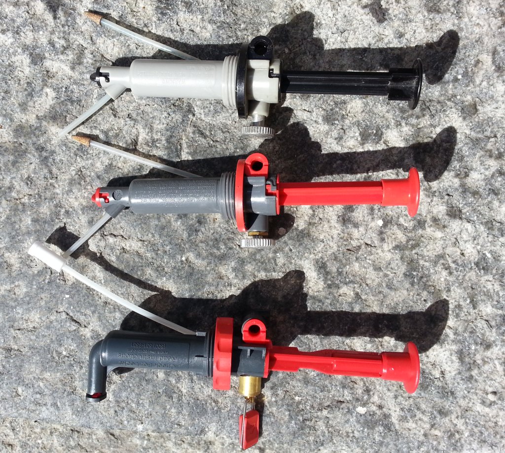 Dette er egentlig en jubileumsgave til en trofast turkompis, så det går ikke på stashbudsjettet mitt. Dvs det egentlig ikke noe jeg har anskaffet meg, så posten er litt OT. Min MSR Whisperlite Internationale er født i juni 1993, og ble adoptert av meg etpar måneder etterpå. Han har en lun og god humor, men er litt sær i kosten til å være multifueletende. F.eks. er ikke parafin noe han liker, da soter han i beste fall og blir direkte grinete om man prøver å servere det på vinteren. Så han har igrunnen stort sett levd på Heptan, og nå i det siste 4-takters miljøbensin fra FK. Og han har holdt vekta si på ca 260 g imponerende konstant. Her er jubilanten, han er jo litt søt når han sover (selv om han begynner å bli litt smårusten)? Dvs. ca nå fyller han 20. Og jeg slår til med en overaskelsespresang: en ny pumpe. Han har hatt mange pumper oppover tidene, men de ditcher ham en etter en. Da blir det innimellom noe grining. Litt avhengig av hvor og hvordan de velger å gjøre det slutt. De tre typene pumpene han har hatt: En grå og svart pumpe var hans første. Han har hatt minst tre av dem. Disse veide ca 50 g. På disse ble justeringshjulet av aluminium skrudd direkte ned i pumpehuset av plast. Når disse gjengene ryker får man fuel overalt og pumpen blir instant ubrukelig. Festet til pumpestangen var to små plastknotter. Disse hadde også en lei tendens til å ryke. Da ble pumpen noe mer krøkkete å bruke, men den fungerte likevel sånn passe. I tillegg var pumpestangen i ett stykke, noe som gjorde at man ofte vridde stangen ut av lås under pumping. Dette kan være en av årsakene til at festene ofte røyk. Warningen er egentlig bare en reklame for MSR fuelflasker. Den neste pumpen var en lekker grå og rød sak. Han har bare hatt en av dem, og de har hengt i hop i åresvis, og den funker helt greit ennå. Mulig det kan bli litt sjau når jeg kommer trekkende med en ny babe til ham. Disse pumpene veier ca 55 g. Forskjellen fra de helt grå er at enden av pumpestangen snurrer fritt. Det gjør at man ikke vrir ut stangen under pumping. De to låseklakkene og de tilsvarende hakkene i pumpehuset er litt feitere enn på de grå. Den beste forbedringen er at justeringshjulet skrus ned i en muffe av metall. Dvs. gjengene blir ikke trashet så fort som på de grå. Denne muffen stopper også åpningen av justeringen (i motsetning til på tidligere pumper, der man maks skulle åpne fire omdreininger, dersom man skrudde mer demonterte man ventilen). Warningen på pumpa har tatt helt av og man trenger ikke lengre ta med noe annet lesestoff på turen. Den er i grøssersjangeren så sarte sjeler bør ikke lese den sent på kvelden. Denne nye pumpa veier rundt 65 g. Jeg sammenlikner med den forrige pumpa, men har en mistanke om at det er en missing link mellom dem. Denne pumpa er en stor endring fra de to forrige, kan vel nesten kalles for en redesign. Jeg har ikke testet den skikkelig, så jeg er litt usikker på hva jeg mener om den, men førsteinntrykket er OK. Pumpestangen og innfestningen av denne har blitt endret. Nå skal det nok mer til for å ødelegge dette festet. Stemplet i enden av pumpestangen er i gummi, mot tidligere lær. Lær funket greit, men kunne tørke ut og krølle seg. Reguleringen har også blitt endret. Fra et tidligere behagelig hjul til en slags flippflopp ståltrådgreie. Denne justerer en ny type ventil (av messing). Messingmuffen som støtter ventilstangen er større og skrus nå på utsiden av pumpehuset. Flaskepakningen har blitt en schvær greie, der man tidligere brukte samme pakning som på flaskekorkene. Lufttilførselen har blitt endret til å være en integrert del av pumpehuset og ventilen for luft har blitt flyttet inn i denne. Det virker som om denne ventilen er lettere å løsne enn før, får håpe at den ikke rister løs av seg selv i flaska under transport. Fuelinntaksledningen har blitt noe lengre og har fått et fancy kunststoffilter istedetfor det ærverdige messingfilteret. Og så virker det som om MSR har resignert når det gjelder advarsler. Selv om de nå skriver på begge sidene av pumpa har de ikke tatt med ordet "warning". Nå er det egentlig bare en trivelig oppfordring. Jubilanten under testkjøring av ny babe: Han rødmer litt, det er sikkert fordi den forrige pumpa ligger og skuler i bakgrunnen: