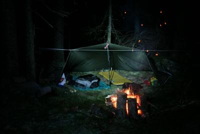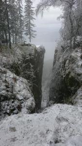 Det dukka opp ei frihelg og lysten til å utforske krokskogen var stor. Planen var å ta bussen til sørkedalen på fredag og ta bussen hjem fra sunnvollen søndag ettermiddag. Målet var å komme seg på tur, fyre bål og se hva krokskogen har å by på. Vi hadde også sett oss ut gyrihaugen og mørkgonga som fine opplevelser underveis. Kart: http://www.norgeskart.no/#10/246938/6667731/l/drawing/http%3A%2F%2Fbeta.norgeskart.no%2Fuser%2Fjson%2F98dfd5824151467ef4073bad54bb19cbb2a7a720.json%0A/32633 Vi prøvde å pakke rett og lett og var godt fornøyde med sekker på rundt 10kg. Men det var før mat, kamera og noe til koppen. Da vi gikk av bussen på skansebakken var det allerede mørkt og vi labba avgårde oppover mot heggelivann. Temperaturen var noe kaldere enn i hovedstaden og værmeldinga for krokskogen med 5- og grått hele helga stemte bra. Vi fant en passende plass for kvelden ved heggelivannet hvor vi spente opp tarpen og fikk igang et bål. Ved var det rimelig enkelt å finne da en storm hadde forsynt seg grovt av tretoppene. Særlig tørr var den ikke så det måtte til mye småkvist for å få fart i det. I et forsøk på å variere turmaten skulle vi prøve noe nytt til middag denne kvelden. Hellstrøms laks i keramikkpotte smakte veldig godt og var en ny smaksopplevelse på tur. Enkelt å lage var det også, satte de i glørne ved bålet i 10-15 min. Ulempen er jo at det er tungt og du må bære med deg keramikken til neste søppelkasse. Så på noen korte turer vil dette fungere utmerket, på andre helt meningsløst. Kosta vel ikke mer enn 70-80kr, men porsjonen kunne gjerne vært større. På lørdag formiddag møtte vi på denne lange pølsa med bein i hver ende som var ganske så nysgjerrig av natur. Beveget seg omtrent som en ilder. Kan det være snømus? Videre gikk turen over løvlia og opp mot gyrihaugen. På veien dit ble det mørkt, men etterhvert fant vi en bra leirplass. Alt trevirke var vått, men ved hjelp av hjemmelagde bålstartere og vifting med liggeunderlag så ble det bra bål denne kvelden også. På søndag formiddag gikk vi opp på gyrihaugen med et bittelite håp om utsikt. Særlig langt kunne vi ikke se, men det var fint det vi så. På veg ned bratta fra gyrihaugen møtte vi et par karer som hadde kommet opp via mørkgonga. De sa det var farlig å gå der pga at alle steinene var glasert med et tynt lag is. Det var ikke vanskelig å tro de på det, der de sto med nyspikka kjepper. Vi hadde uansett ikke tenkt oss ned der, men heller gå på åsryggen sør til sunnvollen. Det var første gangen vi møtte folk på turen så vi slo av en prat. Vi møtte ei dame mellom migartjern og mørkgonga og det var det. Det har sine fordeler å dra på tur senhøst/tidlig vinter. Nede ved migartjern hadde det vært test av tursko, disse nådde ikke helt opp. Da vi nærmet oss mørkgonga kom vi endelig under skydekket og gleden var stor over utsikten, og den mest spektakulære plassen jeg har vært på i nordmarka. På vegen derfra ble brillene borte, jeg skyldte på trolla. Jammen ble det ikke litt mørkegåing på søndag også. Kanskje like greit, så slapp ekstrabatteriene å være ekstra. Siste biten ned mot sundvollen gikk vi noen stier som så ut som snarveier på kartet. Men å gå bratt nedover i mørket på glasert stein sparte vi ikke så mye tid på. Så etter et par snarveier for mye fulgte vi veien ned til bensin.. pølsestasjon.