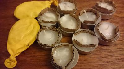 Stapper papiret inn i ballongen, varmer stearin i vannbad før jeg heller den inn i ballongen. Et tips er å lage en liten trakt av et ark for å forhindre søl. Til å forhindre stearin gris i sekken, den er også lett, slitesterk og brenner opp.