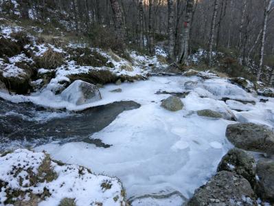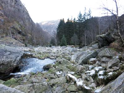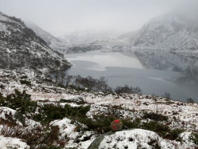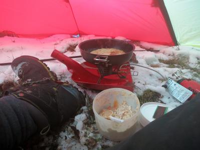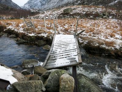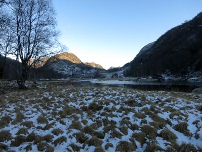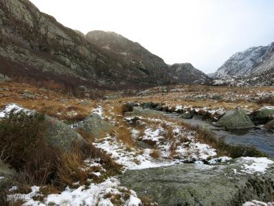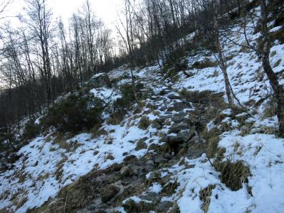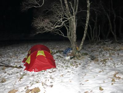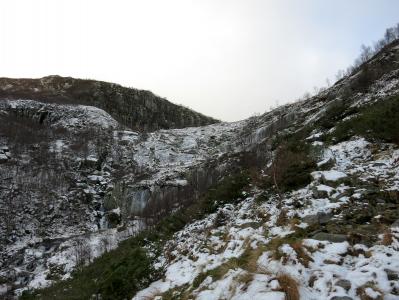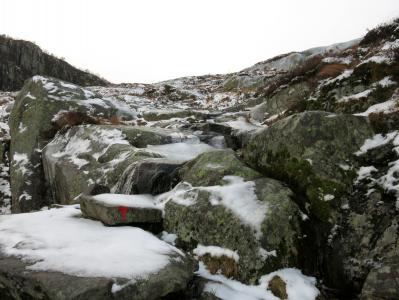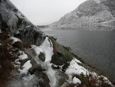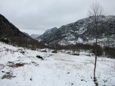 Hadde lyst på en overnattingstur denne helgen, men når yr et par dager i forveien endret værvarselet fra kaldt og fint vintervær til stiv kuling, mildvær og litt nedbør på lørdagskvelden så måtte jeg kikke meg om på kartet etter et litt laverliggende område. Valget falt på Kvitlen og for at det ikke skulle bli altfor kort tur så gikk jeg inn fra veien inn Austdalen. Første del gikk veldig fint, litt snø på marka, men greit og fint å gå på. Ble litt lettet når jeg fant ut at det gikk sti på begge sider av bekken ved broa så jeg slapp å krysse den. Litt lengre opp i dalen ble det brattere og mer is, heldigvis rasket jeg med meg noen brodder på XXL på fredagen til 100 kr, uten disse tror jeg nesten jeg måtte snudd igjen. Var mye is på stien videre. Hadde egentlig sett for meg at det verste var over når jeg kom opp til Laugarvatnet, men innså at jeg hadde studert kartet litt for dårlig. Stien bar oppover fjellsiden til venstre for vannet, og det var stedvis ganske bratt tatt i betraktning den stedvis isbelagte stien. En tydelig rød pil viser at "ja, mann skal forbi her". Med is på fjellsiden ble eneste mulighet å fire sekken ned først og så skli etter selv. Når vannet var passert gikk det imidlertid langt lettere igjen. Ned gjennom skogen var stien fin og ingen flere glatte partier. Men tida gikk og dagslyset var nesten borte når jeg fant meg en fin teltplass. Når teltet var slått opp var det allerede blitt mørkt. Kjøpte nylig en omnilite multifuel brenner og denne har jeg ikke fått prøvd før, så brukte litt av kvelden på å gjøre meg kjent med den. Første tabben var jo at jeg hadde glemt fyrstikkene. Heldigvis har jeg alltid liggende noen fyrstikker i førstehjelpsposen. Men 7 fyrstikker er i minste laget når man skal fyre primus (som selvsagt slokte et par ganger pga nybegynnertabber) og prøve å fyre bål på våt ved. Heldigvis ble det etterhvert gang i sakene og et varmt måltid kan inntas før jeg kryper inn i teltet. Entrecote og fløtegratinerte poteter går Real en god gang... Trøtt etter en god tur kryper jeg tidlig inn i teltet. Litt kos med varm tomatsuppe, smågodt og chips sammen med siste pondus. Utover kvelden begynner det varslete uværet og ta til og vindkastene kjennes ganske kraftig ut til tider. Litt regn kommer det også. Det blåser kraftig helt til godt over midnatt og det er bra å merke at teltet står stødig som fjell. Morgenen etter våkner jeg ikke før kl 9, slik går det når man har det for komfortabelt i teltet. Med både ridgerest, downmat og en god dunpose så sover man jo bedre enn hjemme. Havregrynspannekaker er fint til frokost. Oppover mot hytta på Kvitlen. Siden det var endel isete partier jeg ikke hadde særlig lyst på å måtte forsere motsatt vei som dagen før så bestemte jeg meg for å gå ned den kortere veien til Bjordal. Her var det mye finere og mer markert sti og første delen var veldig fin å gå. Litt mindre vekt i sekken som nok passerte 20 kg på vei inn hjalp også på og i løpet av natta har det frosset på og stien var hard og fin å gå på. Den siste biten ned mot Bjordal hvor det blir brattere var det igjen litt isete og noen halvfrosne bekker som måtte krysses, men ingenting som skapte store problemer. Likevel godt å være nede igjen. Etter å ha gått 2-3 km langs veien kommer det noen østeuropeere som har vært på søndagskjøretur og jeg for haike tilbake til bilen min med dem. Snilt gjort og sparte meg for 6-7 km trasking langs veien. Alt i alt en flott tur, men tipper det ble siste fottur for i år, ihvertfall av noen lengde.