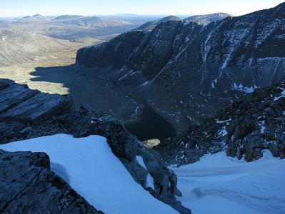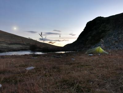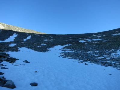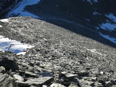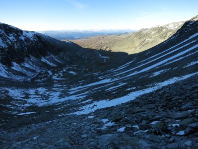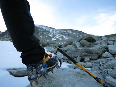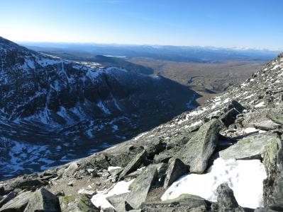 Uken før jeg reiste var det ganske mye mer snø enn det var denne helgen. Regnværet på mandagen og tirsdagen hadde tatt knekken på mesteparten av snøen. Jeg hadde tatt med meg stegjern for sikkerhetsskyld siden jeg ikke visste hvor mye snø som lå igjen. Østryggen av Rondslottet har imidlertid en lang renne og her lå det snø hele veien. Med stegjerna på gikk det lett å komme ned her og jeg sparte både knær og tid ved å slippe å gå i steinura. Kom meg helt ned til 1500 moh før stegjerna ble tatt av. Hadde selvsagt gått ann å gå ned samme veien uten stegjern også, men snøen var rimelig hard og isete flere plasser, så de gjorde ihvertfall turen lettere. Med mye hyggelige folk å prate med og utrolig flott vær på toppen så gikk tida ganske fort og begynte ikke på nedturen før halv fire. Så når jeg kom ned i Langlupdalen begynte allerede sola å forsvinne fra fjelltoppene og det var på tide å finne en teltplass. Tok meg ned til tregrensa og fant en fin teltplass nede med Langlupbekken. Med tidlig mørkt blir det også tidlig kveld. Fordelen er at man kan stå opp tidlig på morgenen og være godt uthvilt. Morgenkaffen smakte spesielt godt denne fantastiske morgenen. På vei mot Bjørnhollia ble det et siste tilbakeblikk mot Rondslottet badet i morgensol. Når jeg ankom Bjørnhollia virket det som de fleste der fremdeles ikke hatt kommet seg opp. Men jeg gikk kjapt videre oppover Illmanndalen. Totalt ble dette den lengste dagsmarsjen selv om lørdagen var litt tyngre med mange flere høydemeter. Med 26 timer på 7 timer var det deilig å se parkeringen igjen ved Spranget. En flott tur var unnagjort. Kjørte hjem igjen samme vei og måtte selvsagt ta litt flere bilder i Hurrungane- 12 svar