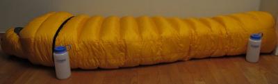 Microlight er tyngre, rimeligere og mer slitesterkt. Quantum tåler uansett mer enn nok for regelmessig bruk. Nettsidene til Pertex kan være noe forvirrende hva "Endurance" angår. Det var tidligere en egen variant som var forholdsvis tykt og solid. Nå er det også tilgjengelig som Quantum med Endurance coating - Quantum Endurance. Roberts hadde tidligere både Endurance og Quantum Endurance lagerført. Jeg ville ikke brukt klassisk Endurance da det veier for mye. Eventuelt kanskje kun som bunn i posen. Min pose ser slik ut: (Standard 1L Nalgene flasker) Noe massiv i fotenden grunnet 30g ekstra dun. Mer isolasjon og mindre luft å varme opp rundt føttene. Den svarte stripen er borrelås sydd på av Roberts. Ikke uenig Nimrad i at et ekstra trekk kan være ok, spesielt utenfor telt. Dog har jeg en litt annen løsning. Jeg benytter (dersom ikke telt) en separat bivvy som kan lukkes helt igjen ved møkkavær. Denne har borrelås som korresponderer med hva en kan se på posen. Dette for hindre at fukt fra utpust kan bevege seg lenger ned enn borrelåsen ved lukket bivvy. Min har også noe såpass sært som integrert festemulighet for VBL. En stor del av poenget ved å benytte Roberts er jo nettopp å kunne få tilpasset posen akkurat som en ønsker. Nimrad har en løsning, jeg en annen. Kanskje ender du opp med helt annet? Ikke koster tilpasningene særlig mye ekstra heller.