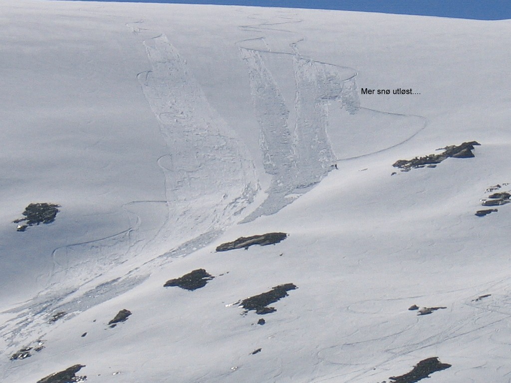 Søndag 11. juni var vi på leting etter et passende fjell å renne på ski, og endet opp med Blåtind i Geiranger. Varmt var det med sol fra blå himmel. Rene luksusen å kunne spenne på seg skiene fra bilvei for å gå de litt over 600 høgdemetrene opp. Det var også rene nordiske forbrødringen med skiturister fra både Finland og Sverige, der vi nordmenn kom i klart mindretal. Kan heller ikke klage på utstyrsnivået til turistene, det var full pakke inkl skredutstyr. Og skredutstyr kunne en saktens trenge.... Nede ser vi 2 personer komme nedover, der den ene detter og utløser et ras som tar han med seg nedover siden. Kameraten renner etter og utløser mer snø som tar den første videre nedover siden. Heldigvis gikk det bra, tap av en skistav var visst den eneste skaden. Samt noen høgdemeter med skirenning... Legger ved noen bilder av raset
