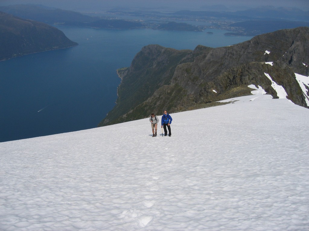 Ble en lang dag ja. For å få raskest retur, så vart det kjørt en bil til Trollstigen, så vi gikk nedatt normalveien ditt. Og der var vi frem mot midnatt... Vi var totalt 6 personer, 2 førere og 4 deltagere. Der var også 2 andre personer foran oss på eggen. De kom nedatt på breen, så de hadde sikkert kommet ned via Lavskar.