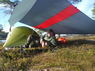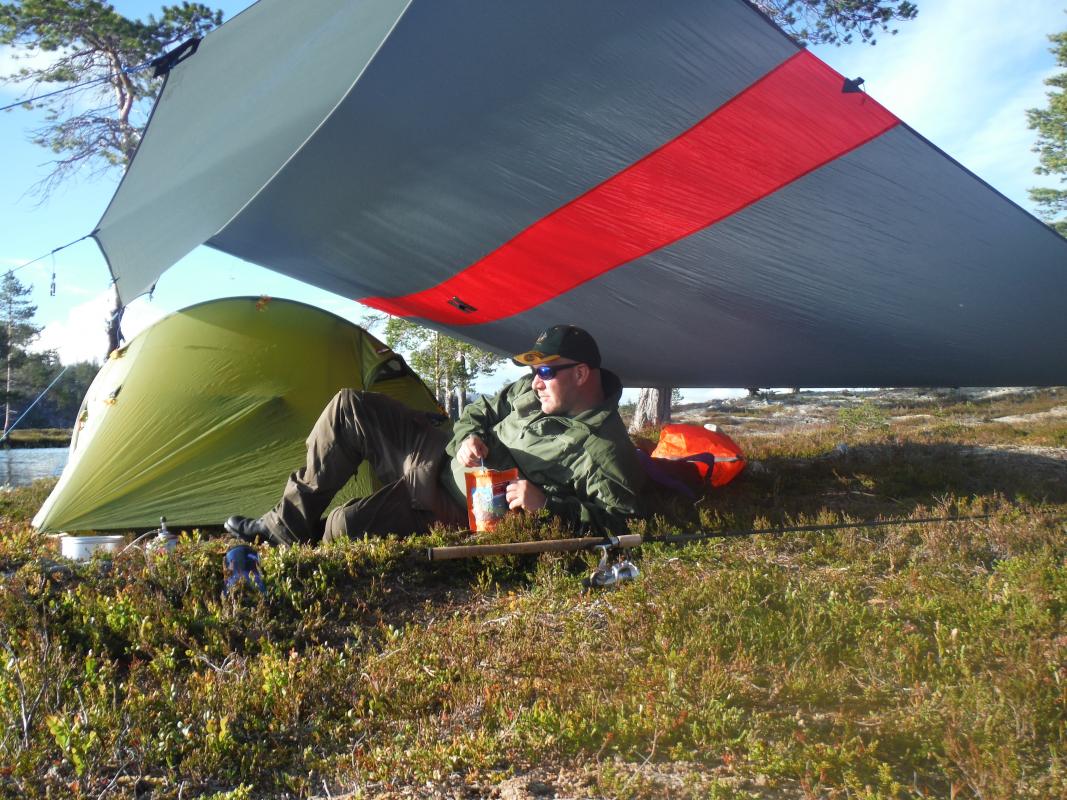 Perfekt og perfekt..... Pleier å ha med en rull flaggstangsnor fra biltema. Binder den mellom 2 trær og henger tarpen min over den slik: Rullen er langt mer enn jeg behøver til det primære formålet så jeg kan helt uten bekymring kutte av noen meter for å lage en ny bardun til teltet eller nye skolisser uten å bli plaget på noen som helst måte..
