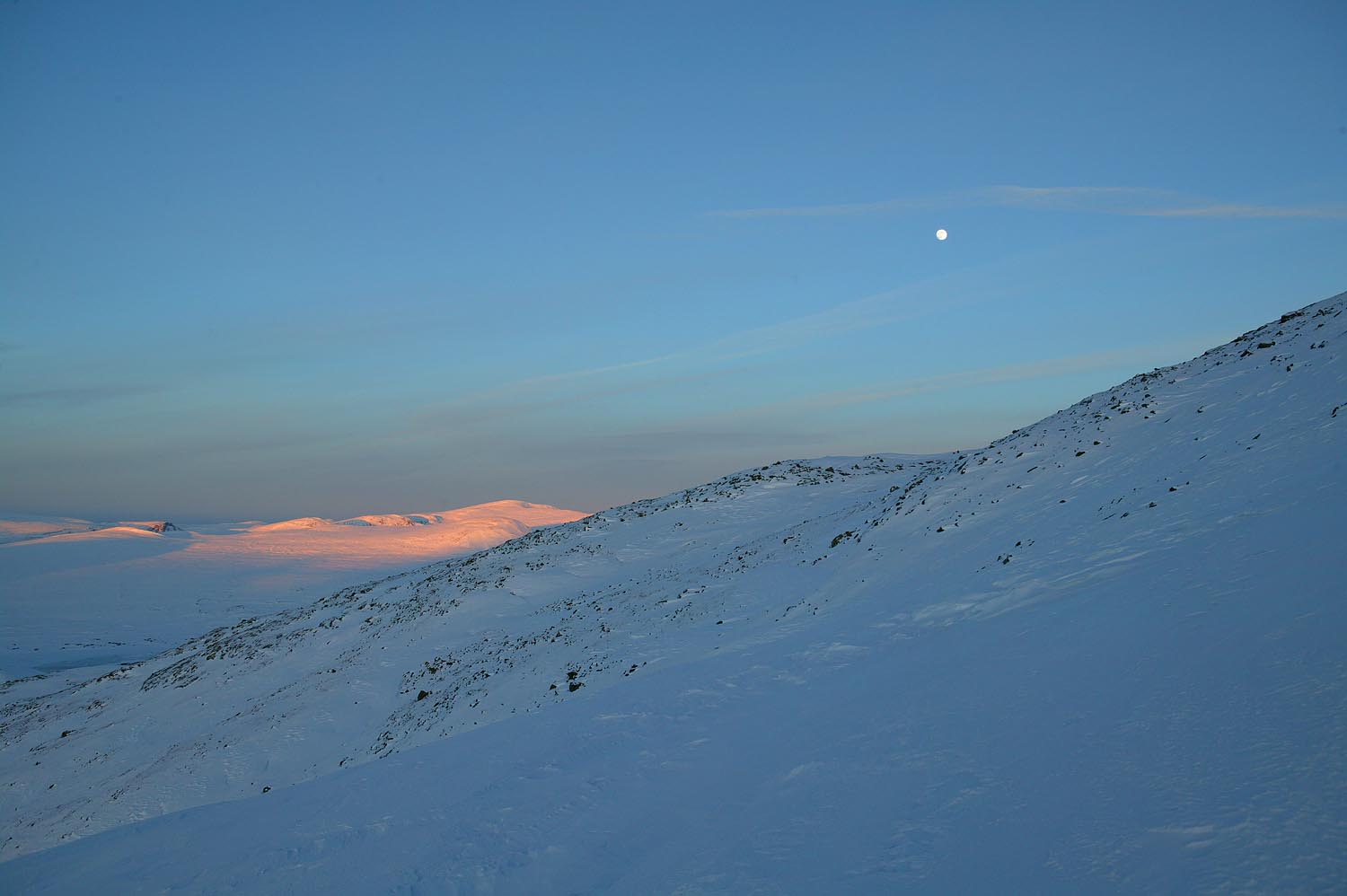10. Her kommer en liten rapport fra Valdres, der det i helga var omtrent like strålende vær som mange andre steder rundt omkring i Sørnorge. Vi kjørte til Garli (der veien er vinterstengt) og begynte vel å gå sånn i halv-ett-tiden i nydelig solskinn og varme - i steinhellingene under Båtskaret dryppet det faktisk allerede i snøen - rene påskestemning . Nedover i Båtskaret var det skyggefullt og surt, og etter at vi rundet inn mot nordsiden av Bitihorn måtte vi konstatere sørgelig lite snø - mye bart og avblåst. Morten ble litt redd for de flunkende nye skiene sine som var helt ripefrie - enn så lenge. Vi hadde ikke med klokke, men var vel på toppen i omtrent en halv time og begynte nedoverturen da kveldslyset begynte å sette inn. Vi jobbet oss nedover ryggen til skiene med kameraet i hånden, og det ble mange korte fotostop. Tilbake i Båtskaret sto fullmånen opp og lyste oss vei nedover tilbake til Garli, hvor vi ankom i syvtiden. Dette var den første fjellskituren vår i år - nå er sesongen åpnet! Vi har en del å ta igjen på skifronten og fortsatte like godt med en fullmånetur til Skardåsen i regi av Valdres tur- og fjellsportlag i kveld. NYDELIG!!! Det rene eventyret med glitrende snøkristaller i månelyset på myrene innover åsen - bare helt herlig. Og det hele 3 min kjøretur hjemmefra! Det er derfor vi bor her, Tom , det kalles livskvalitet av de sjeldne!