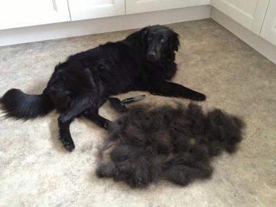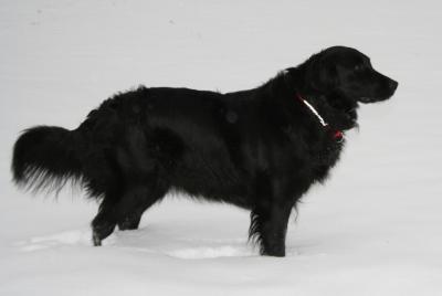 Sheena er en sju år gammel blanding av border collie og flatcoat. Har fått det beste fra begge raser, og ingen av ulempene! Elsker å gå tur, men overlever også helt fint uten, dersom dagliglivet skulle bli sånn. Jada, hun røyter ganske bra, dette er en enkelt børsting etter at røytingen satte i for fullt. Elsker vinteren!