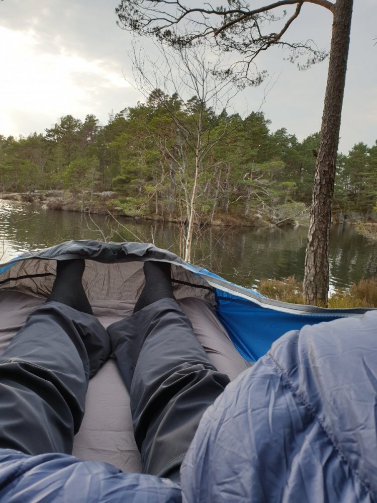 Ble en ny tur i den nye hengekøya i natt. Småkjølig var det utpå natta med -6 grader. Mindre lunt i ei sånn køye enn telt, men behagelig det er det 😊