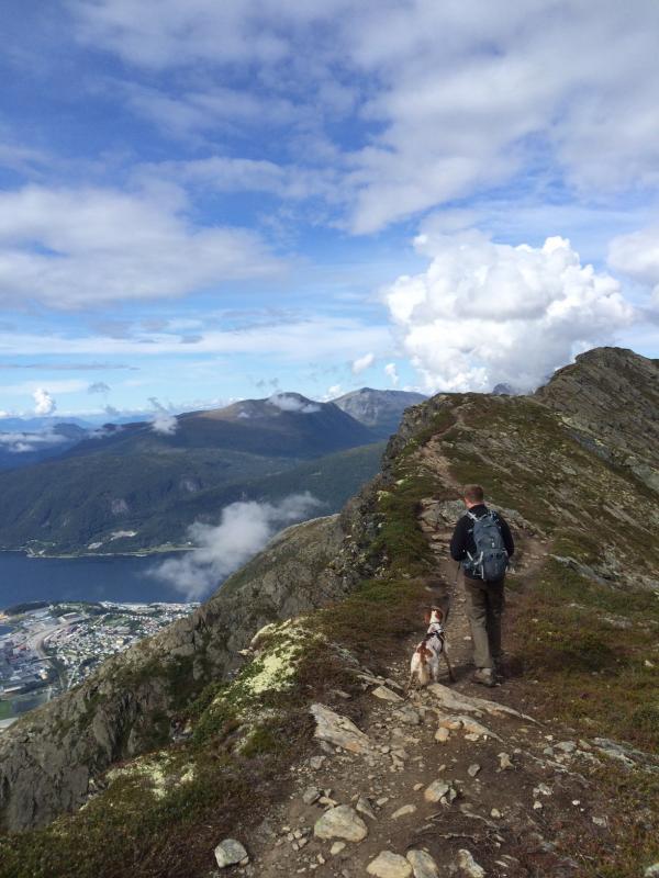Hei! Turen er utført, og det ble en meget vellykket helg! Vi hadde en litt sen avreise på fredag ettermiddag, og fikk kjørt fra Oslo mot Åndalsnes i firetiden. Fant en campplass ca. en halvtime før Åndalsnes og fikk opp teltet før mørket lag seg. Lørdag morgen var det tidlig opp for å bryte camp, og vi var i Åndalsnes ca. en halvtime før bussen gikk fra jernbanestasjonen. Dette er en buss satt opp kun for å frakte folk inn til startpunktet for turen, og billetter kan kjøpes på nettet. Jeg hadde vært i kontakt med turistkontoret i forkant for å forsikre meg om at det ikke var noe problem med hund på busse, og det gikk veldig fint. Selve turen var veldig flott, og vi brukte vel en 5-6 timer med noen pauser. Dersom man går turen med hund vil jeg nok anbefale og gå turen den veien vi gikk, da får man klatring på de bratte partiene (min hun er mer skeptisk til bratte nedstigninger). Det ble noe løfting i de bratteste partiene, så det er absolutt en fordel å være to personer(en som løfter og en som tar imot). Jeg opplevde det litt utfordrende, men absolutt gjennomførbart. Tror hunden hadde en veldig fin tur, og var stort sett glad og fornøyd. I etterkant har vi også gått Besseggen. Det var ganske likt med tanke på vanskelighetsgrad for hunden, kanskje noe enklere. Legger ved noen bilder fra turen.