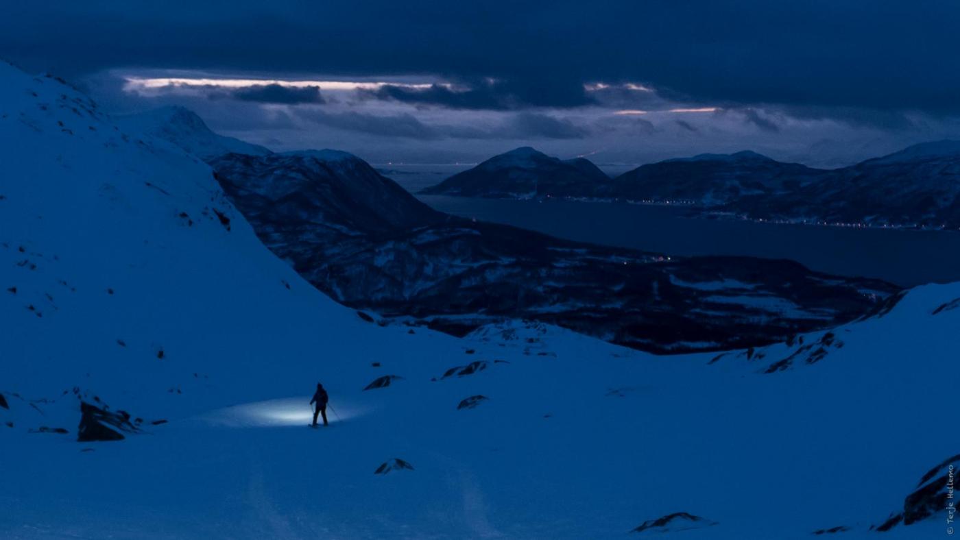 Dyrøy kommune i Troms. Grei tur i sånn passe vær og føre. Nedtur mot Brøstadbotn etter skumring. Fint å kunne kjøre på ski selv om det begynner å bli mørkt.