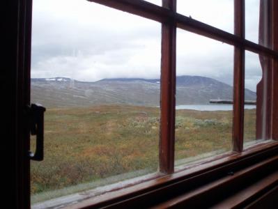 Utsikten fra kjøkkenvinduet i sikringshytta mot søndre Bjøllåvatn