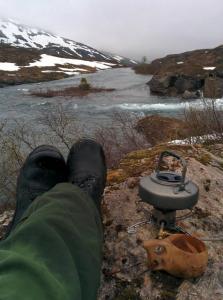 En flott tur opp til Kvannvatnet på Storforshei i Rana i går kvell. Etter en aldeles strålende dag, kom tåka og gråværet sigende utpå kvelden. Syns det er seint i fjellet i år. 7. juni ligger det enda en god del snø i fjellet. Mye og høy vannføring i fjellet her i Nordland Vanlighvis er denne elva for en bekk og regne på sommeren. Om litt er kaffen klar Enda litt is på Kvannvatnet. Kun her ved utløpet at isen nettop har sluppet taket Vannet ligger på knappe 500moh og er enda langt fra isfritt.