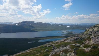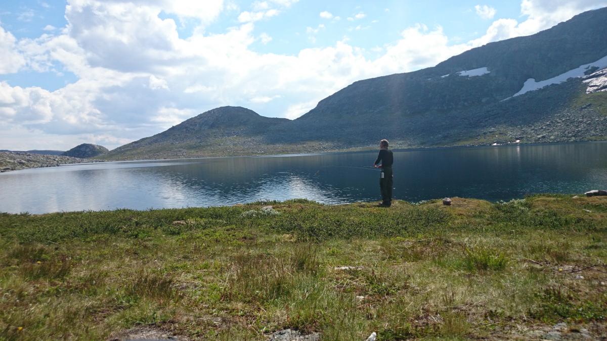 12. Planlegging: Turen var planlagt helt siden juletider. Ettersom dette var min første "ordentlige" tur, så det var ønskelig for min del at det skulle være en relativt kort rute, og samtidig enkelt å komme seg fram. Med kronisk ødelagt skive som ligger å lurker, samt flytebrygger (str. 49+) av noen føtter som ofte lager problemer, så kan fort en lang tur bli til en dårlig tur. Jeg kom da fram til at det å parkere på Synken (øst på hardangervidda), var det beste utgangspunktet for meg. Og med mye research (hovedsaklig på Fjellforum), så ble utstyr, mat, tøy og diverse kjøpt inn. Jeg var også heldig ved å få med meg to gode turkamerater med på turen. Selve Turen: På vei opp til synken, kjørte jeg min ikke helt så trofaste Audi A3 og håpet hele veien fram at den ujevne veien ikke skulle ta kverken på alt av understell. Men litt flaks og godvilje klarte vi til slutt og komme oss fram til parkeringsplassen som vi hadde som utgangspunkt. Da vi parkerte var det regn og tåke som møtte oss. Rett før vi tok på oss sekken veide vi oppakningen for å se hvor mye de veide ferdigpakket. Turkamerat 1: 19kg Turkamerat 2: 25kg Undetegnede: 32kg Jeg skjønte da fort at jeg hadde feilberegnet med ganske god margin! Etter en 2 timers gange kom vi fram til et lite vann som heter Holken. Selve vannet ser ut til å ligge over en vulkan. Været hadde også skiftet totalt retning og det var blitt steikende sol. Etter å ha krabbet oss opp den bratte stigningen fra holken til vestre viktjønn, så ble camp slått opp relativt kjapt. Vi fisket i en times tid, men ingen fikk napp. Vi var også ganske utmattet hele gjengen. og valgte derfor å ta en kjapp middag, for å så krype inn i teltet for å sove. Dagen derpå valgte vi å gå til østre Viktjønn for å se om det var bedre der. Distansen mellom vestre og østre Viktjønn var relativt kort (1,5km) og vi var vel alle ganske fornøyde med det. Vi valgte å sette camp på et litt åpent område for å få mest mulig vind, slik at vi kunne sitte utenfor teltet og slappe av, uten å bli spist opp av mygg. Dette så ut til å fungere relativt bra. Det tok ikke lange tiden etter vi hadde satt opp teltene før vi gikk hver vår vei, for å prøve fiskelykken. Det ble desverre ikke noe fisk denne gangen heller. På kvelden dagen etter, valgte vi å gå litt rundt for å se hvor det vaket, for å prøve fiskelykken. Det beste vannet vi kunne finne var Holken som vi passerte tidligere på vei opp. Men selv om vakene var mange og fisken hoppet i glede, så var det ingen av oss som fikk noenting. Dagen derpå valgte vi derfor å pakke ned og flytte oss ned til holken. Det ble heller ingen fisk denne kvelden, og vi begynte å lure på om murphy virkelig hadde tatt balletak på oss. Vi fisket alle med sluk, spinner ect. og prøvde forskjellig farge og typer etter lover og regler. Neste dag startet vi med en skikkelig frokost av type betasuppe, potetmos og rødvindpølse. Og startet å fiske med en gang, selv om vi viste at vi mest sannsynlig ikke kom til å få fisk pga. den ekstreme varmen i den steikende sola. Men som de evige optimistene som vi er, så kunne vi ikke unngå å prøve et par timer med fiskestanga. Da kvelden kom smygende på så tenkte vi å prøve oss enda en gang for å se om fiskelykken hadde snudd. Og det tok ikke mange kastene før jeg ENDELIG fikk fisk. Liten var den. veide sikkert kun 400gram, men jeg var strålende fornøyd. Fin og rød i var den også. Det ble nok den først og siste fisken som ble tatt på den turen. Vi konkluderte vel med at den ekstreme varmen som har herjet i den siste uken gjorde at fisken ikke helt var lysten på å leke med utstyret vårt. Om dette er realiteten vet jeg ikke, men noe må vi skylde på Neste dag gadd vi ikke å fiske, og vi gikk derfor heller på en liten spasertur langs den høyeste fjellryggen i nærheten. Utsikten var relativt spektakulær. Senere på dagen pakket vi sammen sakene våre og dro hjemover. Som ekte fjellfolk som etterlatte vi oss selvfølgelig ikke noe søppel (fint om folk også får med seg at ølbokser, hermetikkbokser osv. fortsatt ikke er nedbrytbare). Vi etterlot oss et ønske om flere fisk, men tok med oss noen fantastiske minner og opplevelser.