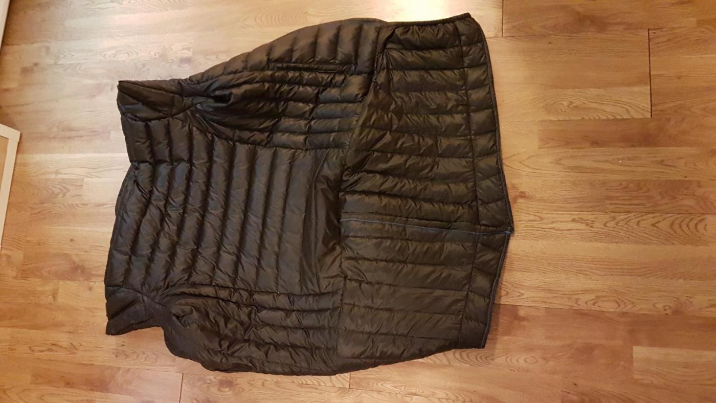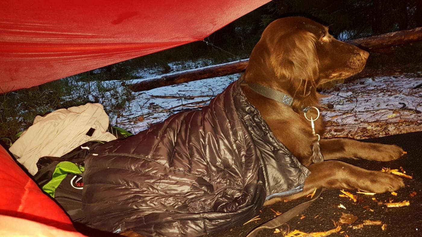 Till nu har min hund fått sova under en fleecepledd eller i en sovepose för barn när nätterna är kalla. Fleecepledd tar stor plats och är inte speciellt varm. Sovepåsen är också stor och ganska tung. Lösningen på detta, att få en varm, lätt sovepose med liten packvolym gick upp för mig när min gamla dunjacka började gå sönder, glidelåsen fungerade inte längre. Då blev det att klippa av ärmarna och huvan på denna, förlänga ryggen med ärmarna och bruka detta som quilt. Samman med en bit liggunderlag, ca 70x50 cm blev det en sovelösning för hunden på 325 g, och mycket kompaktare än tidigare lösningar. På testen där bilderna är tagit upptäckte jag att det blir bättre när jag kan knäppa igen quilten i halsen och ha en resår runt magen så att quilten följer med när hunden beveger sig. Detta är lagt till och är inräknat i vikten.