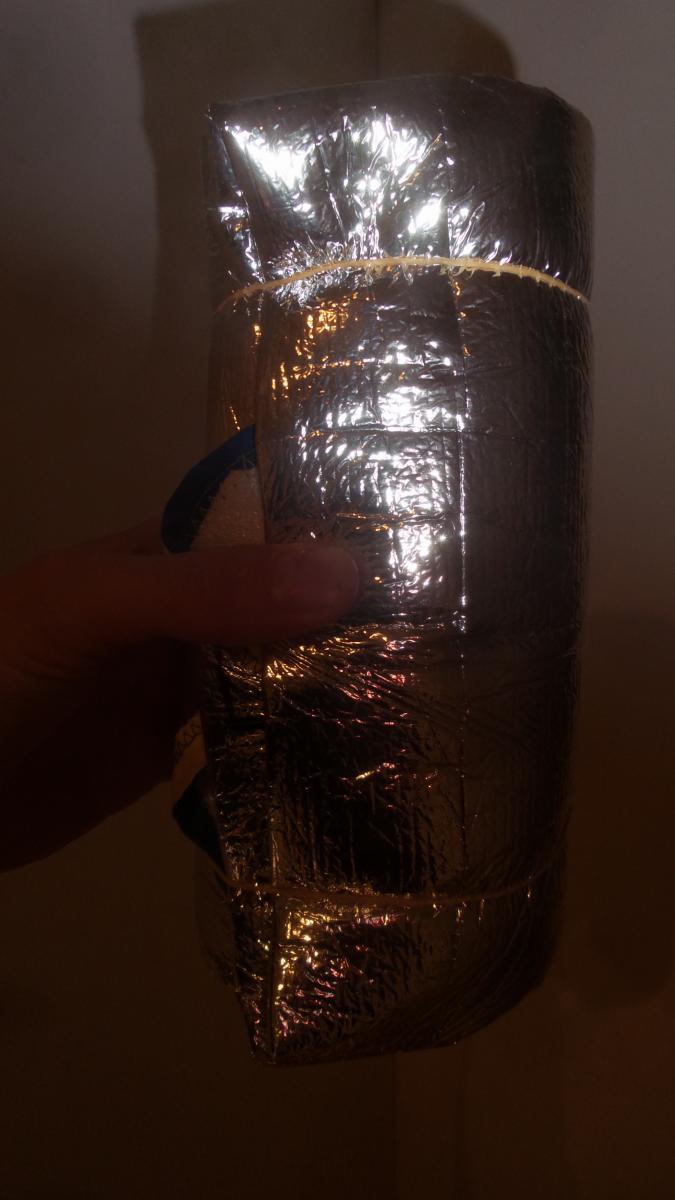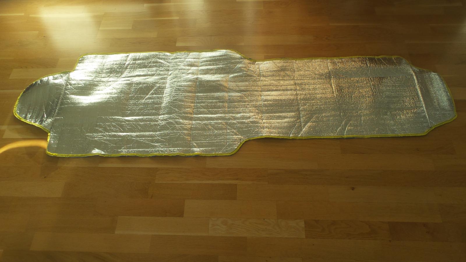 2. Här kommer bilder på mitt hemmagjorda liggunderlag. Det kommer att användas först och främst för att boosta temperaturen på mina existerande liggunderlag när jag riskerar temperaturer som är något kallare än de är avsedda för. Jag kommer också ha detta som en del av ett survivalkit att ta med på turer för bär- och sopp-turer i terräng jag känner dåligt. Risken finns alltid att man tittar för mycket på marken och för lite på terrängen. (Har aldrig hänt mig, men en gång må ju bli den första.) Detta är en enkel fix, jag har formklippt en vindusskydd för lastbilar (köpt på Biltema). Sedan bara sytt på ett polyesterband runt den klippta kanten för att förhindra delaminering mellan alu-filmen och isolermaterialet. Vikt: 75 g. Volym: ca en liter. Brukt en natt och hade då frost. Mitt uppblåsbara liggunderlag fick en läcka, så det blev grundligt testat. Jag fick lägga hundens liggunderlag (6 mm CCF-underlag under bålen och platt uppblåsbart liggunderlag plus denna under hela kroppen. Detta räddade natten, men var lite för kallt och mycket för hårt för att kallas komfortabelt.