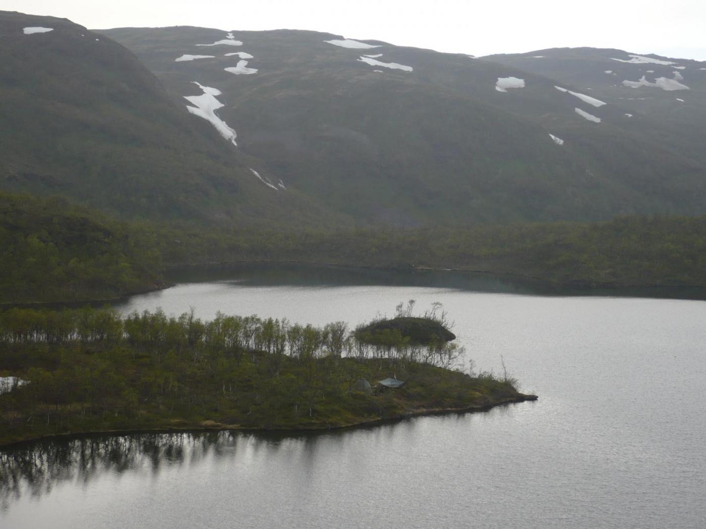 Etter en flott tur på denne øya i fjor var det fristende å dra en tur til, denne gang for å utforske andre deler av øya. Turen ble startet fra Hessfjorden med vandring opp Sørdalen, målet var å gå inn til Holmevatnet som ligger inne i Sørdalen. Turen inn var rimelig grei da vi fulgte en gammel vei et godt stykke inn før stien i skogen begynte, denne var fin et stykke, men så ble den mer eller mindre utvisket i det den krysset elva. Herfra gikk vi på syn mot målet, noe mer tyngre enn om vi hadde sett stien som faktisk fortsatte på andre siden av elva (fulgte den da vi dro hjem, men ikke lett å se fra andre siden på tur inni dalen). Vel fremme ved vannet etter ca 4km i skogen tar vi første pause, her blir vi stående å diskutere litt hvor vi skal slå leir, det er tydelig at stedet vi først kommer til har blitt flittig brukt som teltplass. Siden vi begge foretrekker å "unngå" for mye folk på tur bestemmer vi oss for å ta på sekken å gå rundt vannet i leting etter en annen plass for å slå leir, det ble ca 2km til med vandring før vi fant den perfekte leirplassen (den var perfekt ). Leiren ble satt og dagen gikk til å sanke ved og noen få kast utenfor leiren før vi brukte kvelden rundt bålet til avslapping og kos, det var idyllisk! Dag 2 slo været helt om hvor det kom regn og tåke, heldigvis var det godt med brensel i området og det kom godt med. Bålet brant mer eller mindre 5 dager sammenhengende, hvor vi tørket rå-ved forløpende over/ved bålet. Dagene som kom gikk til å fiske oss rundt vannet, da planen var å fiske på Solvannet utgikk på grunn av isen lå enda. Dette ble en rolig 5 dagers tur med mye bålkos og rolige dager, fisket var ikke helt på topp. Tidvis så vi og hørte større vak på vannet, men det visste seg vanskeligere å få den til å bite en først antatt. Det var ingen fisk på verken sluker, spinnere, flue eller mark, og tåken å regn gjorde til at det nok en kveld ble bålkos og avslapping. Morgen dag 3 går jeg får å se til en av stengene jeg hadde stående med mark over natten, jeg har med meg lettspinnstangen for å ta ett par kjappe kast underveis. Borte ved markstangen er resultatet nedslående, ikke tegn til liv, ikke en mark er blitt rørt....skuffet kaster jeg ut sluken (salamander) nesten i trass i samme området marken lå. Jeg ser sluken kommer fint inn undervann og tenker at det skal bli greit nok å dra tilbake til teltet å ta en kopp kaffe, akkurat da ser jeg en skygge som kommer som en rakett mot sluken...JA, det er fisk!! Rett før sluken er helt i land og løpet er kjørt biter den på, det er fin fisk og med lettspinnstanga blir dette en artig kamp Noen minutter senere er fangsten et faktum, ørret tett på kilo blir tatt med til campen hvor jeg vekker min makker. Snakke rundt morgen bålet er igjen engasjert med god tro på godt fiske, kaffen og frokosten går fort ned i iveren for å komme igang med fiske. Vi fisker aktivt hele dagen, ingen hell, det er helt dødt i vannet foruten regndråpene som faller fra himmelen. Nok en kveld kommer hvor vi igjen sitter rundt bålet og snakker om hva som gjør at vi ikke får fisk, er det tåken, vind retningen, vanntemp, er vi for tidlig på året o.l?? Litt umotivert drar jeg ned for å sjekk marken på den ene stangen som står ute, speider etter duppen på vei bortover, ingen dupp å se... Vel fremme ser jeg at det er liv i stanga, her er fisk roper jeg til kompisen min som kommer springende. Nok en fin fisk rundt kiloen havner på land, denne tatt på bunnmeite. Med ny iver tar vi en ny runde med aktivt fiske, igjen uten hell. Men denne kvelden blir det ørret til kvelds, en herlig kveld med kald pils og stekt ørret Dag 4 får vi nok en ørret, denne rundt 500-600g som vi steker i folie på bålet og spiser med andakt da der ikke ser ut til å bli den store fangsten på denne turen. Det ble den siste fisken for turen, hvor vi på dag 5 fisker oss en siste tur rundt vannet på returen. Vi møter en eldre herre idet vi skal til å forlate vannet, han kan fortelle at det har vært en merkelig dårlig bitt i fisken til nå i sesongen, men at han til vanlig har godt fiske her og vanlig størrelse fra 600g til kilo. Men fra tid til annen tas det fisk godt over kiloen, han selv hadde tatt ørret over 2kg i dette vannet. Flott tur til et lett tilgjengelig vann. Dessverre bærer det negativt preg rundt vannet av aktivitet i form av delvis store områder hvor skogen rundt er full av dopapir og annet søppel. Har troen på at Solvannet kan holde fisk av stor størrelse, men dette vannet går noe sent på sesongen da det ligger i skyggeland mellom fjellveggen og en knaus i forkant. Vil tro at dette er et vann med bra fiske om man treffer på tiden, fisken som jeg tok hadde nydelig kvalitet, god kondisjon og fantastisk på smaken Skitt Fiske