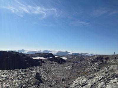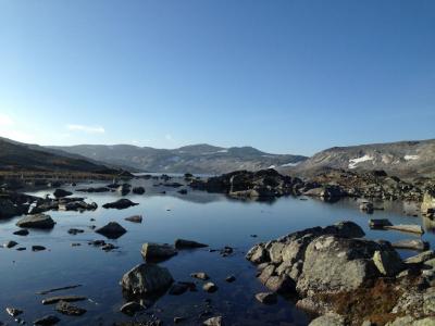 Torsdag ettermiddag ruslet vi fornøyde ned Karl Johan med fjellsko og sekk på ryggen og gledet oss til noen dager på fjellet. Turen gikk fra hytte til hytte i Skarvheimen . Iungdalshytta - Kongshellern- Geiterrygghytta - Finse Etter 4,5 timer med tog og Taxi var det godt å få gått å få begynne på turen. Turen inn til Iungdalshytta tok vel ikke mer enn 1 time, men det var en fin tur langs vannet i strålende sol Det var overaskende få folk på hytta så vi hadde god plass og boltre oss på! Neste morgen begynte bra men etter hvert ble det både tåke og regn i tillegg til en kald vind så det ble ikke mange pauser over . Vi gikk jevnt og trutt oppover, det var ikke mye å se på pga tåken , men lemmen det var det nok å se av. Syntes siste stykket i blokkur er utrolig kjedelig å gå. i hvert fall når det er glatt pga regnet. Da vi kom frem til Kongshellern var det fullt av folk der fra før av og de hadde fyrt opp godt så det var deilig å komme frem til oppvarmet hytte og en god porsjon med boksemat. ( merkelig hvor godt lyslapskaus kan smake på fjellet i forholdt til hvor fælt det smaker hjemme) Siden hytta var full måtte vi sove på madrasser på kjøkkenet, så vi var tidlig oppe neste dag og spiste frokost utenfor i strålende sol og til nydelig utsikt En del av de andre skulle være igjen på hytta så vi slapp også billig unna med å vaske ut ol. Kongshellern ligger utrolig høyt og fint til ved Kongshellervattenet så skjønner godt at man blir igjen her noen dager for det er utrolig fint her! Turen fra Kongshellern og ned til Geiterygghytta er en veldig fin tur i variert terreng og fin utsikt. Vi brukte lang tid ned og satt lenge i sola underveis og koste oss. På Geiterygghytta er det stappfullt av folk og vi er ganske overlykkelige over å få kapret de to siste sengeplassene og feirer fornøyd i sola med kanskje verdens beste vaffel og klapping av en tam reinkalv som går rundt der og tigger vafler og kos Både middag og resten av kvelden er veldig hektisk pga så mange folk + et 60 årslag så vi legger oss ganske tidlig. Etter en langnatt med "sovesalstøy" og telt savn pakker vi raskt sammen , smører matpakke og starter på turen over til Finse. Været er strålende med sol og lite vind . Vi har god tid ned til Finse for toget går ikke før kl 19 så vi tar oss god tid til å gå opp på saint paul for lit panorama utsikt og til to lange pauser i sola. Syntes turen fra Geiterygghytta og ned til Finse er den fineste turen med fin utsikt til fjell, bre og begynnelsen på aurlandsdalen. Vi ankommer Finse kl 18 og går da fortsatt i singlet. Sjelden jeg har opplevd så fint vær og så lite vind i Skarvheimen.