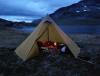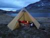 Gratulerer med ny ovn og nytt telt! Den fungerer bra. Den kan plasseres inntil en halv meter fra midtstanga uten at den kommer for nært duken. Har heller ikke fått hull i duken pga glør til tross for mange timer med fyring. Ved å ha døra åpen slik som på bildet over, vil stort sett røyken stige og forsvinne ut av øverste del av døra. Mitt telt er modifisert slik at de grå ventilasjonslukene kan åpnes. Jeg kan da ha døra igjen og fyre slik som i en tradisjonell lavvo, og virkelig få det varmt innendørs. Har den luka som er i mest i le åpen. Det lønner seg å bruke stein på duken for å unngå alt for stor trekk. På den siste turen jeg var på, ble jeg skikkelig våt og kald den første kvelden. Jeg hadde da slått leir så høyt at den eneste veden som var tilgjengelig var fersk dvergbjørk og små vierbusker, fra ca 0,5 cm tjukke og tynnere (Hadde gassapparat med som backup til matlaging). Jeg kuttet opp en haug med dette, med løv og alt, og hadde varme i mange timer. Det ble selvfølgelig mye røyk i perioder, men i ligge- og sittehøyde var det stort sett røykfritt. Harald