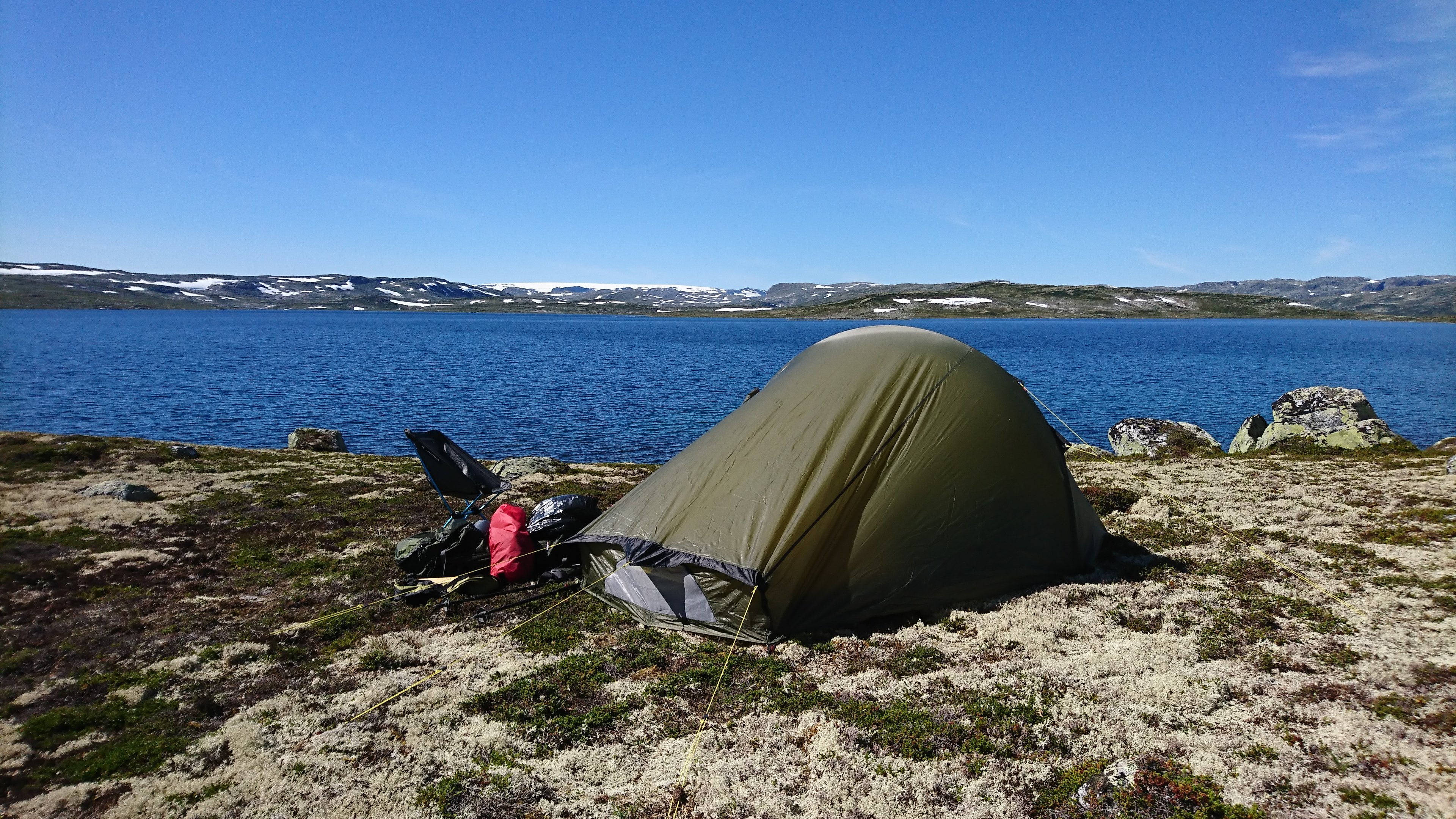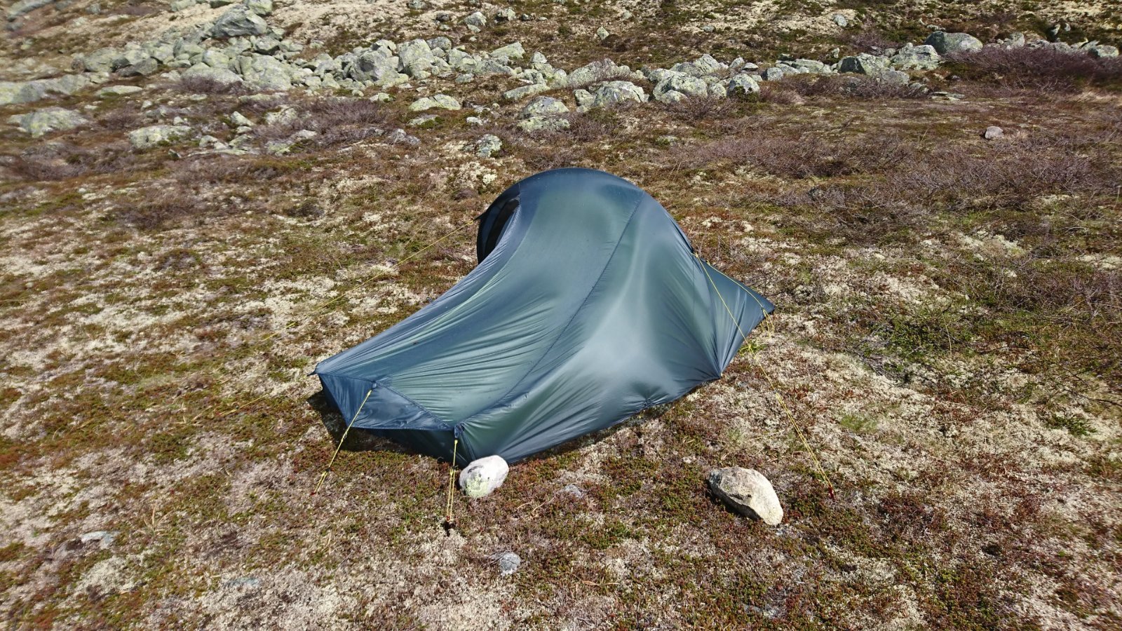 5. Etter en tråd vi hadde her om vindprofilen på Ringstind teltene dro jeg opp til Fagerheim Fjellstugu på Hardangervidda for å prøve teorien min i praksis. Vinden økte på utover kvelden/natta, det var meldt liten kuling. Hva det var i vindkastene vet jeg ikke, teltet var satt opp med hodeenden mot vinden og jeg fikk som du beskriver, etter å ha lagt meg, teltduken i fleisen under vindkastene. Jeg tror at det må bli sånn når Helsport valgte å la teltduken ved hodeenden gå helt ned til bakken Etter denne opplevelsen setter jeg alltid fotenden opp mot vinden slik at teltduken ikke presses ned lavere enn høyden på glassfiber stavene (25-30-25 cm) som er i enden. Nå er jeg godt fornøyd med de tre Ringstind teltene mine (SL1-2, SL-2, Pro 2) som jeg har satset på. Produsentene må gjøre noen valg ved designen av teltene så jeg har ikke funnet noe telt som dekker ønskelisten min 100%, Ringstind teltene er det nærmeste jeg har kommet.