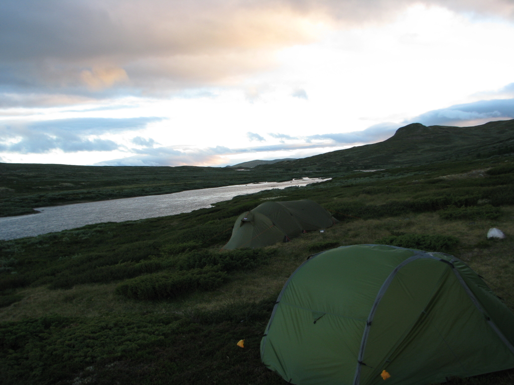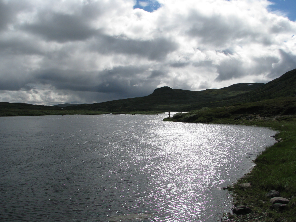 Egentlig skulle jeg gått denne turen med to forskjellige kompiser i fjor sommer og i år, men de ble av diverse grunner avlyst begge gangene. Dermed bestemte jeg meg for å pakke sekken og å ta med bikkja for å gå turen alene. Utgangspunktet var hytta vi har på fjellet i Ål, for så å ta seg gjennom Skarvheimen til Lærdal. Værvarselet for uka var gode. Det var stort sett meldt opphold og bra vær, men som alle vet så kan det fort endre seg til fjells. Onsdagen startet med å finjustere sekken, sjekke at alt utstyret var på plass, for så å få i seg en ålreit frokost. Været var ålreit, og skulle etterhvert vise seg å bli veldig bra. Jeg startet fra hytta kl. 10, og slo opp teltet ved Olsennvatn rundt kl. 17. En sjutimers gåtur i et terreng som startet med skog, for så å ende opp på vidda. Natt til torsdag var det minusgrader, men soveposen holdt varmen. En helt blå himmel dagen før var nå forvandlet til en grå himmel med en god del tåke som lå spesielt over Reinskarvet. Denne dagen var planen å ta seg til Iungsdalshytta, midt i hjertet av Skarvheimen. Jeg gikk til Djup, et stort vann som jeg skulle følge helt til hytta. Å gå grusveien vest for Djup virket kjedelig, men enklest. Tåken forsvant etterhvert, og sola tittet frem i perioder. Jeg kom frem til turisthytta rundt fem, og tilbrakte natta der. Fredag var det meldt litt regn tidlig på dagen, men etterhvert skulle det bli opphold. Dette skulle dog vise seg å ikke stemme. Jeg skulle gå innover Fødalen for så gå over fjellet til Kvevatnet. Dagen startet bra, og Fødalen er en vakker dal med bratte fjell og en fin elv. Etterhvert bestemte jeg meg for å gå inn i en sidedal over fjellet. Her var det ikke annet en stein, stein og stein, og så kom så klart tåka. Jeg kunne ikke se mer enn rundt 100 meter foran meg. Steinura tok aldri slutt, så jeg ble etterhvert litt stressa når det ikke var mulighet for å slå opp teltet noe sted. Etter fire timer med hopping fra stein til stein, kom jeg etterhvert fram, lettet over å ha kommet frem før det ble mørkt. Jeg fikk slått opp teltet, spist litt mat og lagt meg for å sove rundt kl. 20. Lørdag skulle jeg følge grusveien helt ned til Lærdal. Det hele startet bra klokken halv åtte om morran, men jeg klarte på en utrolig måte å trokke over mens jeg gikk på grusveien. Dermed hadde jeg flaks som fikk sitte på med en lastebilsjåfør som kjørte opp matrialer til en hytta som skulle bygges. Uansett var det en fin tur, så her følger noen bilder.