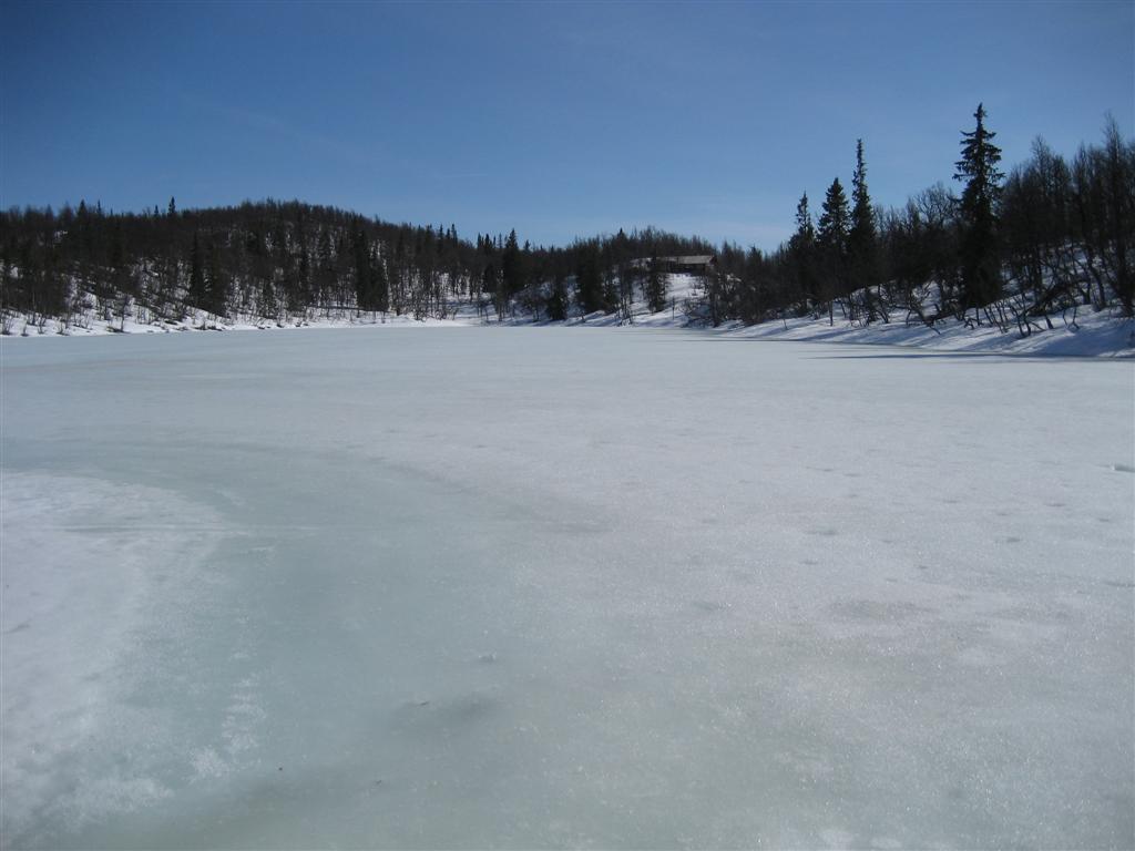 11. Isen var til å gå på på fjellet i Ål, ca. 1000 moh. Dog er den nok ikke trygg de fleste steder enda. Veldig tjukk var den ikke, og det var bare helt nære land jeg gikk. På de større vannene var det åpent vann enda.