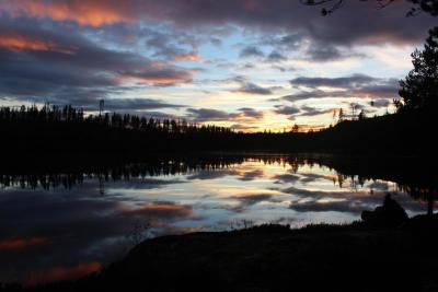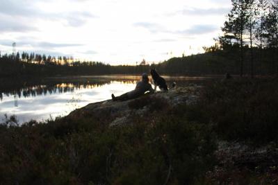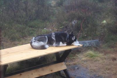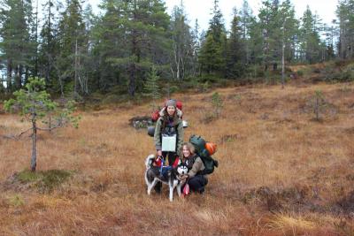 22. Vikerfjell En tur som overhodet ikke gikk som planlagt. Avreise fredag 17 oktober. Dette skulle være en litt mer kosetur, da jeg og min beste venn fra barndommen Thea begge hadde bursdag underveis. Planen var at Thea og min samboer Snorre skulle være med på starten, så skulle jeg fortsette alene. Snorre skulle være med i helgen bare, mens Thea skulle bli til onsdag. Dette medførte en del gnaging på hjernebarken for min del i planleggingsfasen, hvordan disse to skulle komme seg hjem på respektive tidspunkter, samtidig som vi skulle komme oss videre. Det var derfor planlagt å ikke bevege seg for lange distanser de første dagene. Avreisedagen kommer og Snorre viser seg å ha blitt syk. Vi blir derfor enige om at han skal prøve å komme seg i løpet av fredagen og komme etter på lørdag. Thea og jeg drar avgårde fredag morgen. Da ingen av oss har prestert å ta lappen enda, blir det buss til Hønefoss og så lokalbuss videre til Sokna, da det ikke er lov å ha med hund på ekspressbussene. Været er grått og vått, men humøret er på topp. Vi får mye oppmerksomhet i Hønefoss om at det er snø i fjellet nå osv. Det visste vi dog og jeg hadde til og med pakket spade for sikkerhets skyld. Første dagen går superfint, selv om det er litt kjedelig å gå så mye på vei for å komme oss inn i skogen. Slår leir ved Sognevatnet og får tent superbål med en gang. På kvelden får jeg melding av Snorre. Han har blitt mye dårligere og tror det er best å holde senga. Han er lei seg og jeg forstår. Verre er det når jeg innser at jeg har pakket nesten all maten i Snorre sin sekk. Okey, ny plan, vi har mat til tirsdag, så får jeg dra hjem med Thea da, med mindre vi får masse fisk. Lørdag våkner jeg til bursdagsang av Thea. Jeg har foreslått at vi kan feire bursdagene våre på Tjuvenborgkoia som en skikkelig luksus, et forslag som blir tatt imot med stor entusiasme. Vi setter dermed kursen dit. Underveis har jeg prøvd å velge en litt spennende vei, da det fortsatt er mye grusveier i området som jeg syns er kjedelig å gå på. Stien vi følger forsvinner derimot ut i et stort hogstfelt og vi surrer en stund i området. Dog får vi se kong elg på nært hold spankulere over den fossende elva som om det var en sølepytt. Vi kommer oss på kurs igjen før neste utfordring venter. Undervurdering av stigningen opp til hytta! Vi tar altså veien forbi Tjuvenborgen og Hestebrenna. Denne ruta vil jeg ikke kalle gåsti men fjellklatring. På vei opp rekker det å bli bekmørkt og hodelykter må fram. Denne ruta er sikkert fantastisk i dagslys med utsikt og uten sekk, men med tunge sekker, regn/snø, tåke og mørke ble dette en smule skummelt. Enkelte steder må vi løfte opp sekkene og bikkja. Vi kommer oss dog opp, men det er lenger igjen til hytta enn vi tror. Vi må lete etter hvert neste blåmerke med lykta og vi er nå gjennomvåte og iskalde. Jeg begynner faktisk å bli temmelig nedkjølt. Vi kunne ha slått leir. Men, på veien mellom Tjuvenborg og Hestebrenna klarer Lope å miste kløven. Hun har sikkert satt seg fast i noe og har måttet åle seg ut av kløven for å komme seg løs. Greit nok, bedre det enn at bikkja er borte. Vi lyser litt rundt men har ikke sjangs til å finne kløven nå. Derimot blir det nå enda mer kritisk å finne hytta, for kjøkkenent lå nemlig i kløven. Vi vurderer likevel sterkt flere ganger å slå opp teltet, men jeg er fast bestemt på å finne hytta når vi har null mulighet for varme eller matlaging. I slike situasjoner gjelder det å holde hodet kaldt og jeg vil påstå i ettertid at jeg klarte det forholdsvis bra. Vi finner da hytta til slutt, men vi kunne likegodt gått rett forbi den. Vi sto en meter fra hytteveggen uten å se hytta. Thea var nok lettere forvirret etter marsjen, for det første hun utbrøt når vi kom inn var «radio!», mens jeg kun hadde tankene på oppvarming da jeg nå ikke hadde det særlig bra temperaturmessig. Det ble da satt igang fyring både i peisen og i ovnen. Peisen viste seg da og være tett (uansett hvilken vei man stilte spjelet) og hytta ble dermed røyklagt i samklang med den velfungerende brannalarmen. Vi måtte da slukke peisen og fokusere på ovnen. Dette gikk bra helt til vi skulle legge oss. Da fikk vi nemlig pipebrann. Røret inne så ut som det skulle eksplodere og i pipa ute lyste det vakkert. Vi kunne ikke akkurat hoppe i posen nå. Vi anså pipebrannen som mild nok til å vente å se om den roet seg. Det gjorde den. Dog er det her et par ting jeg skal gi videre beskjed om til driverne av hytta, for her må det renses. Alt dette skjedde altså i løpet av min bursdag hehe. Vi sov som gråstein. noen syns det var for vått på bakken... Søndag, Thea sin bursdag. Fortsatt regn og tåke, ut å lete etter kløven. Vi hadde merket stedet hvor den var blitt borte. Dette er Togo-kløven fra seleverkstedet så den sklir jo vakkert i ett med skogens farger. Jeg hadde festa et orange reflekshalsbånd på toppen, men den kunne jo likegodt ligge vendt ned. Hele dagen gikk med til klatring opp og ned i dette bratte terrenget, uten hell. Når mørket igjen kom sivende måtte vi gi oss og jeg aksepterte at kløven var tapt. tid til kos under leting Mandag, bedre vær! Det hadde klarnet opp og solen tittet forsiktig fram. Vi vasket oss ut av hytta og satte kursen mot Nedre Kollsjø. Det fristet lite å ta samme veien ned fjellet. Jeg hadde jo egentlig tenkt meg mye lenger, over høgfjell osv, men dette var jo nå ikke mulig. Dette ble en nydelig tur. Fantastisk utsikt, bedre fordelig av vekta i sekkene og en bikkje som var storfornøyd med å slippe og bære noe mer resten av turen. godt humør er viktig å ha Vi fant en drømmeleirplass ved Nedre Kollsjø og fikk igang et kjempebål. Dette var skogen på sitt beste. Solnedgangen speilte seg i det blikkstille vannet, føtter og støvler tørket rundt bålet og roen senket seg som den skal. Vi fiska litt uten hell før mørket senket seg. Jeg er ikke 