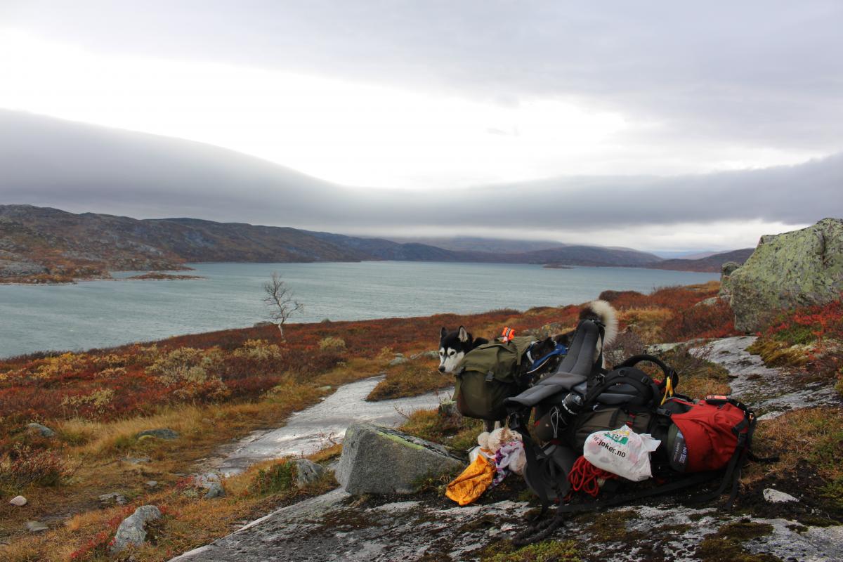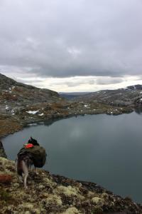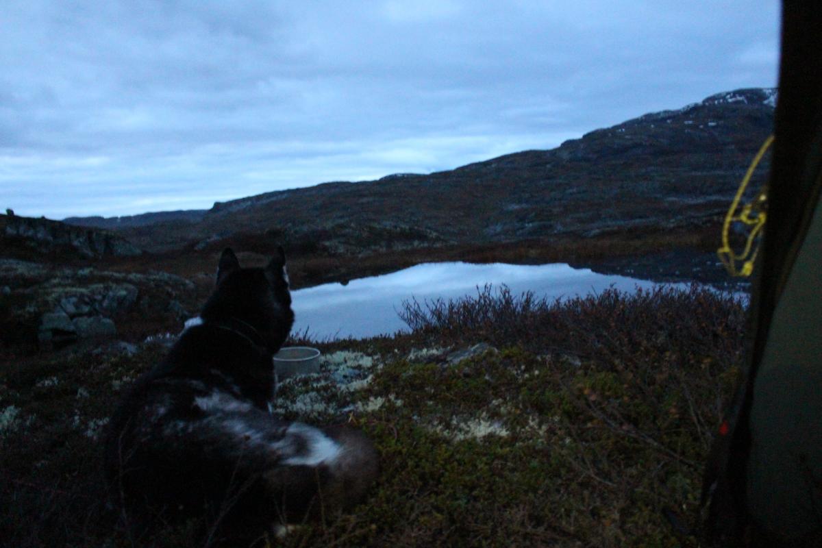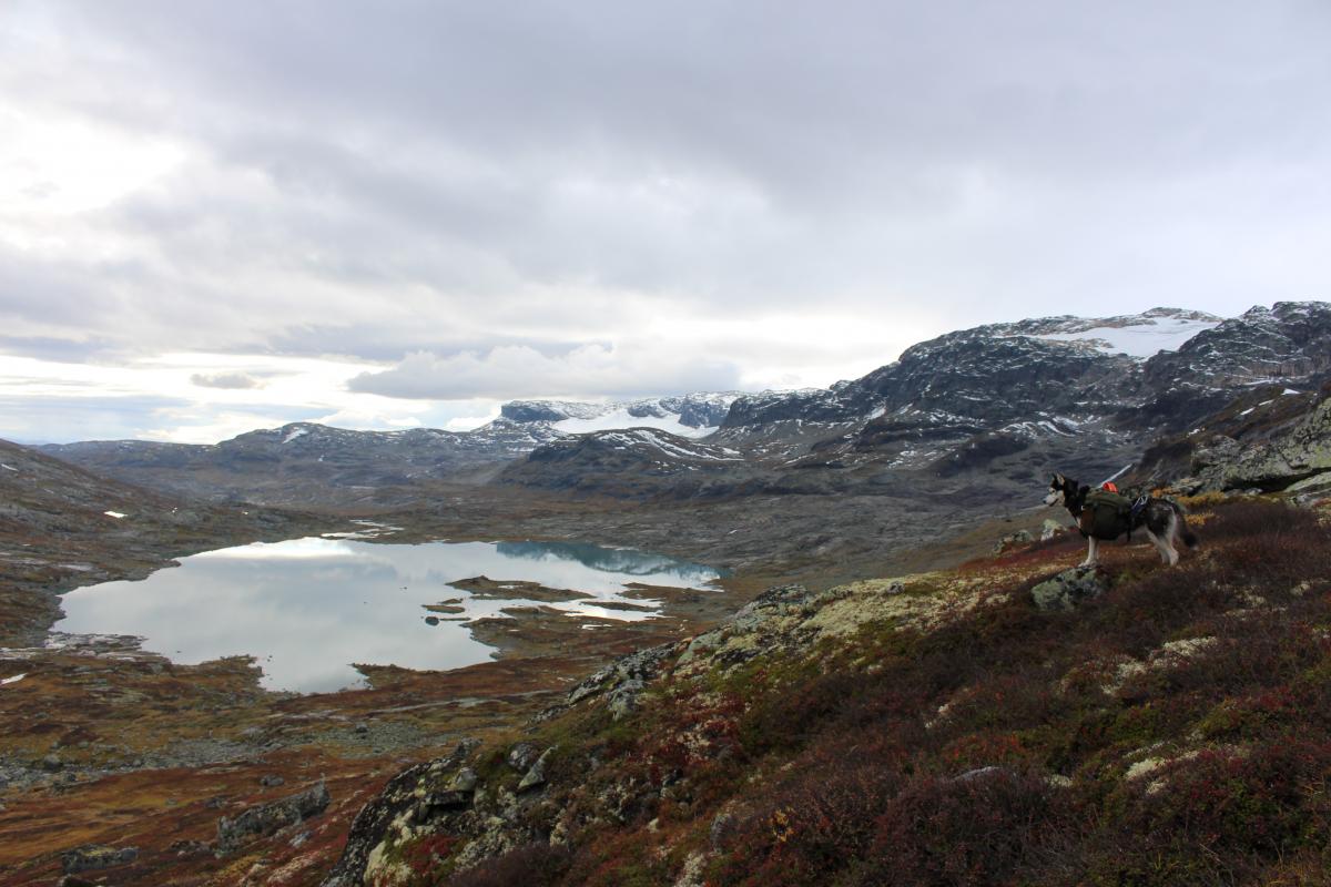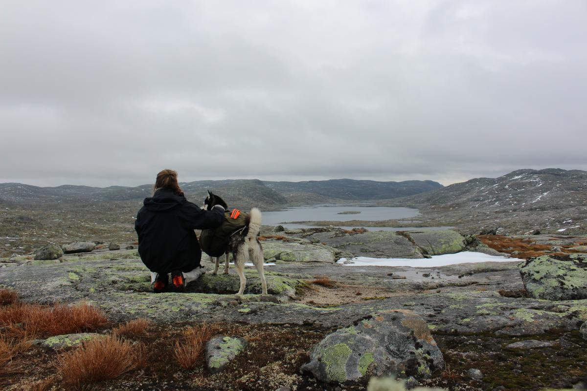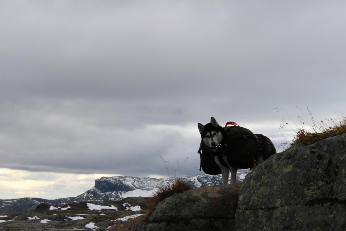 19. Hardangervidda september/oktober 2014 En erfaring rikere på det å ha respekt for fjellværet og årstider. Langtur på Hardangervidda. Lope og jeg drar avgårde med toget fra Oslo S 08.00 på morgenen etter avreise hjemmefra i en fantastisk rød soloppgang. På perrongen blir vi omringet av fotograferende turister som aldri har sett en hund med kløv før. Mye oppmerksomhet for morgentrøtte to-og firbeinte, hehe. Togturen til Finse er nydelig og Lope er som alltid veldig flink til å kjøre kollektivt. Vi ankommer Finse rundt 12.30 og begynner å gå. Det regner, blåser litt og er tåke oppe i fjellet, men vi smiler bredt begge to. Første utfordring blir brua fra Finse stasjon og over mot jøkulen... Der fossa nemlig vannet no salig og Lope fant det skummelt. Det gikk da til slutt for det. Neste utfordring er sommerbruer som er tatt inn. Dette var jeg forsåvidt forberedt på, men vi brukte fryktelig lang tid på å finne et sted å vade denne første elva da det var mye vannføring. Vi kom derfor ikke særlig langt denne første dagen, et stykke rundt jøkulen på østsiden. Men det gjør ingen verdens ting. Jeg bryr meg svært lite om hvor langt man kommer, hvor fort man har prestert å gå diverse distanser osv, jeg er ute for å være ute og kan like godt være innenfor samme kartrute i en uke. (Jeg synes for eksempel dette kappløpet som pågår hvor det er om å gjøre å gå Norge på langs på kortest mulig tid er helt meningsløst. Jeg har tenkt til å gjøre et prosjekt hvor jeg går Norge på langs på lengst mulig tid. Eller kanskje jeg ikke går Norge på langs i det hele tatt..) Det skal også sies at jeg egentlig hadde en alt for tung sekk, i forhold til at jeg er en ganske spinkel jente, og at det derfor ikke gikk særlig fort. Vi slår leir med utsikt opp mot den mektige jøkulen hvor det buldrer og braker. Herlig. Lope har aldri vært inne i teltet før og jeg hadde egentlig ingen planer om det denne gangen heller. Ikke fordi jeg egentlig har noe i mot det, men hun klarer seg godt ute, har større bevegelsesfrihet og jeg slipper all møkka som da blir dratt inn i teltet. Denne gangen tenkte jeg meg dermed litt om. Hadde det ikke egentlig vært veldig koselig om hun lå her inne med meg? Det er bare oss to, er det ikke hyggeligere om vi er sammen? Hun hadde tross alt vært utrolig flink til både å vade med kløven og til å drepe lemen... Jeg inviterte Lope inn og hun skjønte pent lite. Skal jeg inn der? Dette var jo nesten litt skummelt. Jeg måtte føre henne inn. Men så fort hun skjønte at hun skulle få lov til å ligge der inne i varmen var det gjort. Hun ble med ett et slakt over beina mine. Flink til å breie seg er ho og. (På den annen side har dette ført til at ho i ettertid selvfølgelig har begynt å forvente at hun alltid skal inn i teltet..) Turen videre går fint, dog er det mye krevende terreng i begynnelsen av dette området og det går treigt med oss. Vi er tross alt ute seint på året så mye vann i elvene og en del snø gjør framkomsten en del hardere enn sommerstid. Jeg prøver så langt det er mulig å la Lope klare seg selv, så hun ikke skal forvente min hjelp hele tiden. Et par steder må jeg likevel hjelpe henne da det rett og slett blir for krevende med 8 kilos kløv. Det blir en natt til i telt på veien nedover. Det er lov å være klisje på tur. Det er tross alt en grunn til at noe blir klisje.. Snøøøøøhh Jeg hadde egentlig ingen planer om å benytte meg av noen av hyttene på denne turen, men etter at det meste hadde blitt gjennomvått bestemte jeg at vi skulle unne oss en tørke/hviledag på Kjeldebu. Jeg møtte to mennesker på denne turen, en kar som var ute å lette etter de siste sauene, disse sauene tror jeg forøvrig jeg fant dagen etter jeg hadde møtt ham, og en kar som fiska i elva nedenfor Kjeldebu. Brua over til Kjeldebu er ikke akkurat hundevennlig så jeg gikk over og venta på at Lope skulle finne ut av dette selv. Tror jeg lå i lyngen i omtrent en halvtime og moret meg med å se henne tenke så det knakte i barken. Mye løping fram og tilbake, mye lyd, og testing av sikre veier over elva, før hun til slutt kastet seg i det og svømte over. Polarhunder er jo ikke akkurat kjent for å være glad i vann, så dette er noe vi trener på. Sprekkeferdig av stolthet kom hun opp på andre sida og tok noen rakkettrunder i lyngen. Hytta fikk vi for oss selv og jeg mesket meg på joikakaker og diverse etter å ha raidet matboden. Jeg bestemte at vi skulle ha en hel hviledag dagen etter, dermed to netter på hytta. Det skulle vise seg å bli tre. Her ble vi nemlig sittende værfast. Det var jo forsåvidt godt at vi satt værfaste her og ikke i teltet, men nå fikk jeg beskjed om at et skikkelig væromslag var på vei. Mobilen bruker jeg svært lite på tur, ikke hadde jeg dekning heller, men et siste krampetak fra batteriet etter oppvarming mellom hendene gjorde at jeg fikk mottatt denne værmeldingen før mobilen døde. Hadde forøvrig allerede kjempet en tapper kamp mot aggregatet jeg mot all forventning fant på utedassen, men den var tørst og jeg hadde intet å tilby.. Jaha, jeg hadde jo mye større planer for turen enn at jeg skulle gi meg nå, men sannheten var at vintern var rett rundt hjørnet og jeg risikerte å bli sittende fast for godt om jeg ikke kom meg ut av fjellet nå. Jeg hadde tydeligvis undervurdert avstandene i dette området, eller overvurdert min hurtighet/bærekapasitet. Jeg må si at når det er lagt opp til at avstanden Finse – Kjeldebu er en helt overkommelig dagsmarsj, er ikke det medberegnet tung sekk og dårlig vær. Jeg tør påstå at jeg er i temmelig god form. Jeg hadde jo egentlig planlagt å komme meg helt sør til Blåvarden hvor jeg så skulle vende nesen nordover igjen og ta sørsiden opp mot Ustaoset. Slik ble det altså ikke. I ettertid føler jeg at jeg egentlig fikk dekket en veldig liten del av vidda, men igjen, det er vel egentlig ikke så viktig. (det er desverre m
