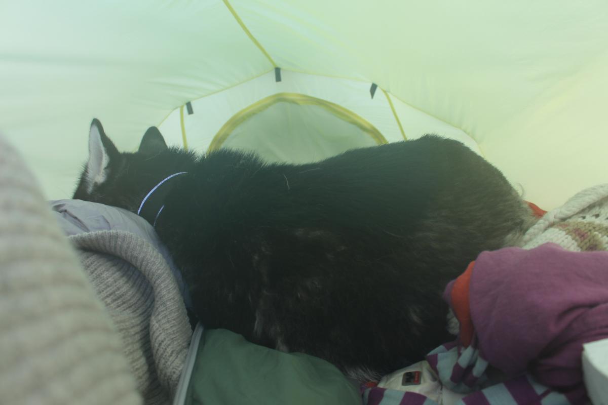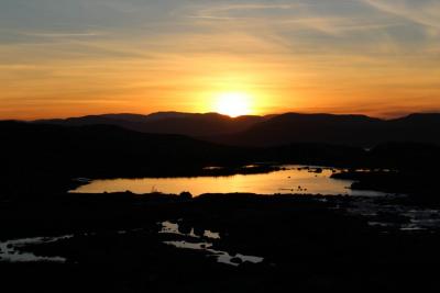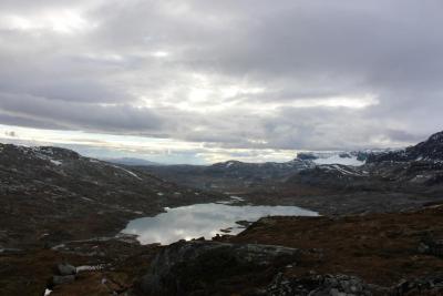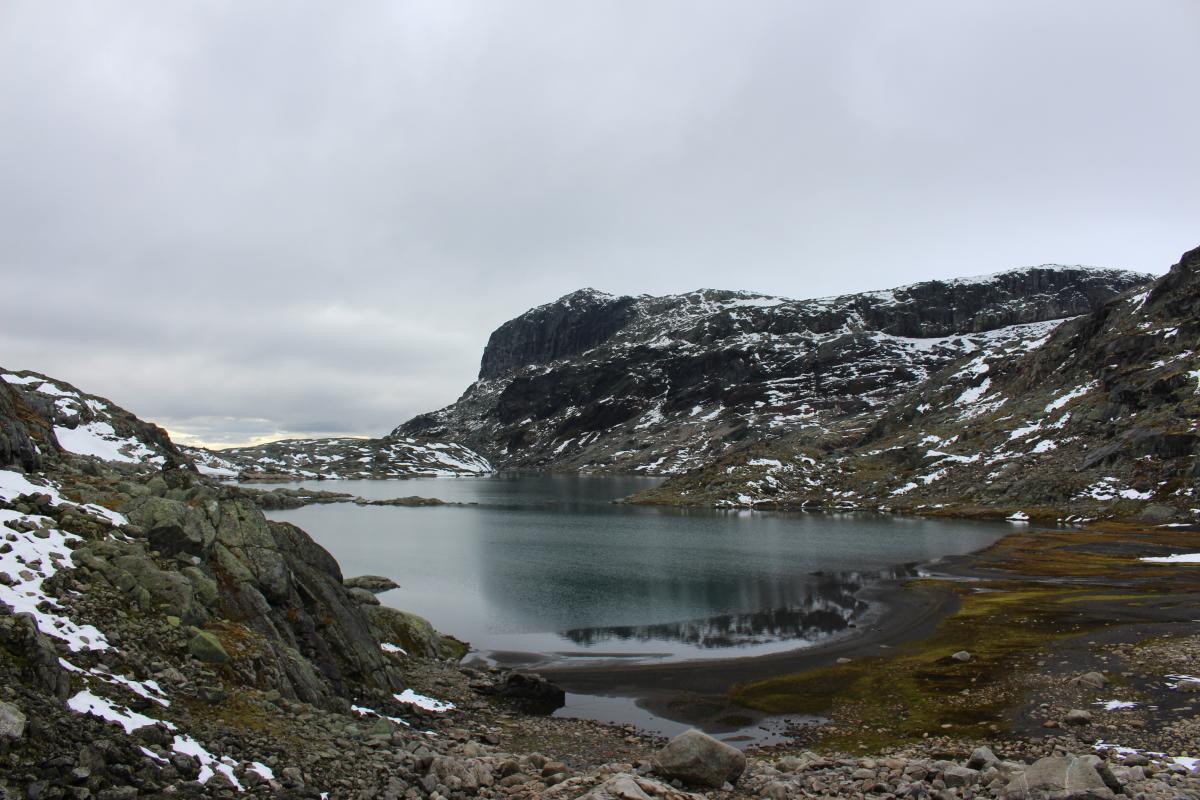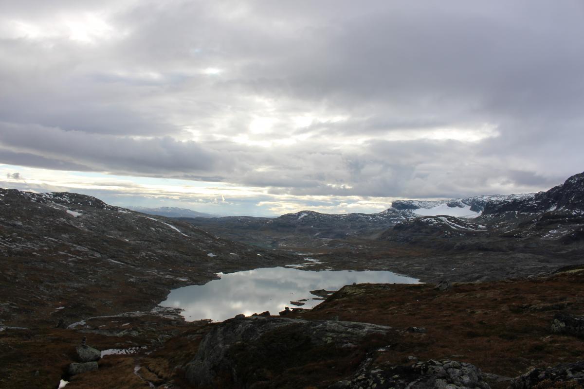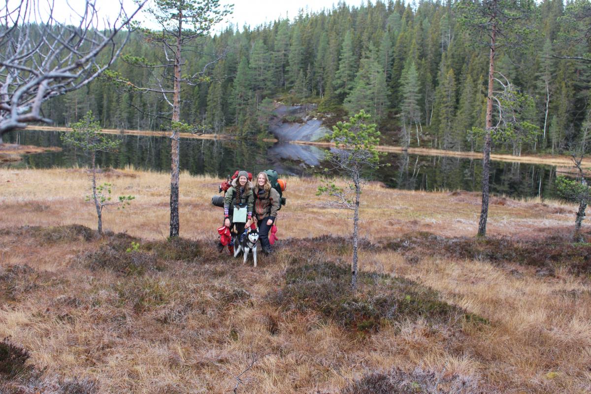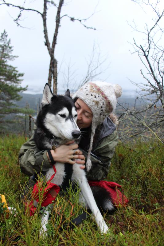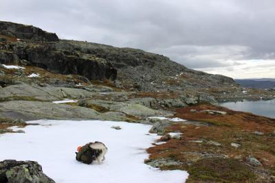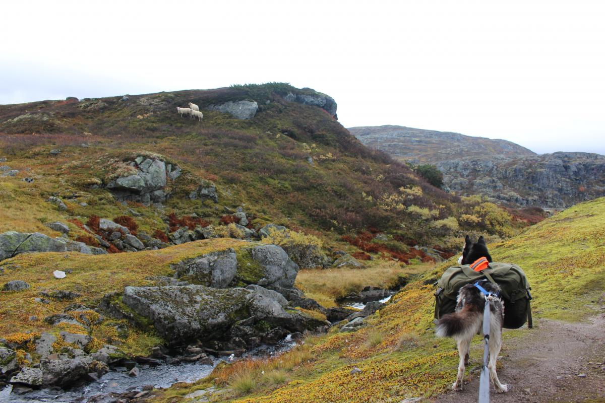19. Hardangervidda september/oktober 2014 En erfaring rikere på det å ha respekt for fjellværet og årstider. Langtur på Hardangervidda. Lope og jeg drar avgårde med toget fra Oslo S 08.00 på morgenen etter avreise hjemmefra i en fantastisk rød soloppgang. På perrongen blir vi omringet av fotograferende turister som aldri har sett en hund med kløv før. Mye oppmerksomhet for morgentrøtte to-og firbeinte, hehe. Togturen til Finse er nydelig og Lope er som alltid veldig flink til å kjøre kollektivt. Vi ankommer Finse rundt 12.30 og begynner å gå. Det regner, blåser litt og er tåke oppe i fjellet, men vi smiler bredt begge to. Første utfordring blir brua fra Finse stasjon og over mot jøkulen... Der fossa nemlig vannet no salig og Lope fant det skummelt. Det gikk da til slutt for det. Neste utfordring er sommerbruer som er tatt inn. Dette var jeg forsåvidt forberedt på, men vi brukte fryktelig lang tid på å finne et sted å vade denne første elva da det var mye vannføring. Vi kom derfor ikke særlig langt denne første dagen, et stykke rundt jøkulen på østsiden. Men det gjør ingen verdens ting. Jeg bryr meg svært lite om hvor langt man kommer, hvor fort man har prestert å gå diverse distanser osv, jeg er ute for å være ute og kan like godt være innenfor samme kartrute i en uke. (Jeg synes for eksempel dette kappløpet som pågår hvor det er om å gjøre å gå Norge på langs på kortest mulig tid er helt meningsløst. Jeg har tenkt til å gjøre et prosjekt hvor jeg går Norge på langs på lengst mulig tid. Eller kanskje jeg ikke går Norge på langs i det hele tatt..) Det skal også sies at jeg egentlig hadde en alt for tung sekk, i forhold til at jeg er en ganske spinkel jente, og at det derfor ikke gikk særlig fort. Vi slår leir med utsikt opp mot den mektige jøkulen hvor det buldrer og braker. Herlig. Lope har aldri vært inne i teltet før og jeg hadde egentlig ingen planer om det denne gangen heller. Ikke fordi jeg egentlig har noe i mot det, men hun klarer seg godt ute, har større bevegelsesfrihet og jeg slipper all møkka som da blir dratt inn i teltet. Denne gangen tenkte jeg meg dermed litt om. Hadde det ikke egentlig vært veldig koselig om hun lå her inne med meg? Det er bare oss to, er det ikke hyggeligere om vi er sammen? Hun hadde tross alt vært utrolig flink til både å vade med kløven og til å drepe lemen... Jeg inviterte Lope inn og hun skjønte pent lite. Skal jeg inn der? Dette var jo nesten litt skummelt. Jeg måtte føre henne inn. Men så fort hun skjønte at hun skulle få lov til å ligge der inne i varmen var det gjort. Hun ble med ett et slakt over beina mine. Flink til å breie seg er ho og. (På den annen side har dette ført til at ho i ettertid selvfølgelig har begynt å forvente at hun alltid skal inn i teltet..) Turen videre går fint, dog er det mye krevende terreng i begynnelsen av dette området og det går treigt med oss. Vi er tross alt ute seint på året så mye vann i elvene og en del snø gjør framkomsten en del hardere enn sommerstid. Jeg prøver så langt det er mulig å la Lope klare seg selv, så hun ikke skal forvente min hjelp hele tiden. Et par steder må jeg likevel hjelpe henne da det rett og slett blir for krevende med 8 kilos kløv. Det blir en natt til i telt på veien nedover. Det er lov å være klisje på tur. Det er tross alt en grunn til at noe blir klisje.. Snøøøøøhh Jeg hadde egentlig ingen planer om å benytte meg av noen av hyttene på denne turen, men etter at det meste hadde blitt gjennomvått bestemte jeg at vi skulle unne oss en tørke/hviledag på Kjeldebu. Jeg møtte to mennesker på denne turen, en kar som var ute å lette etter de siste sauene, disse sauene tror jeg forøvrig jeg fant dagen etter jeg hadde møtt ham, og en kar som fiska i elva nedenfor Kjeldebu. Brua over til Kjeldebu er ikke akkurat hundevennlig så jeg gikk over og venta på at Lope skulle finne ut av dette selv. Tror jeg lå i lyngen i omtrent en halvtime og moret meg med å se henne tenke så det knakte i barken. Mye løping fram og tilbake, mye lyd, og testing av sikre veier over elva, før hun til slutt kastet seg i det og svømte over. Polarhunder er jo ikke akkurat kjent for å være glad i vann, så dette er noe vi trener på. Sprekkeferdig av stolthet kom hun opp på andre sida og tok noen rakkettrunder i lyngen. Hytta fikk vi for oss selv og jeg mesket meg på joikakaker og diverse etter å ha raidet matboden. Jeg bestemte at vi skulle ha en hel hviledag dagen etter, dermed to netter på hytta. Det skulle vise seg å bli tre. Her ble vi nemlig sittende værfast. Det var jo forsåvidt godt at vi satt værfaste her og ikke i teltet, men nå fikk jeg beskjed om at et skikkelig væromslag var på vei. Mobilen bruker jeg svært lite på tur, ikke hadde jeg dekning heller, men et siste krampetak fra batteriet etter oppvarming mellom hendene gjorde at jeg fikk mottatt denne værmeldingen før mobilen døde. Hadde forøvrig allerede kjempet en tapper kamp mot aggregatet jeg mot all forventning fant på utedassen, men den var tørst og jeg hadde intet å tilby.. Jaha, jeg hadde jo mye større planer for turen enn at jeg skulle gi meg nå, men sannheten var at vintern var rett rundt hjørnet og jeg risikerte å bli sittende fast for godt om jeg ikke kom meg ut av fjellet nå. Jeg hadde tydeligvis undervurdert avstandene i dette området, eller overvurdert min hurtighet/bærekapasitet. Jeg må si at når det er lagt opp til at avstanden Finse – Kjeldebu er en helt overkommelig dagsmarsj, er ikke det medberegnet tung sekk og dårlig vær. Jeg tør påstå at jeg er i temmelig god form. Jeg hadde jo egentlig planlagt å komme meg helt sør til Blåvarden hvor jeg så skulle vende nesen nordover igjen og ta sørsiden opp mot Ustaoset. Slik ble det altså ikke. I ettertid føler jeg at jeg egentlig fikk dekket en veldig liten del av vidda, men igjen, det er vel egentlig ikke så viktig. (det er desverre m