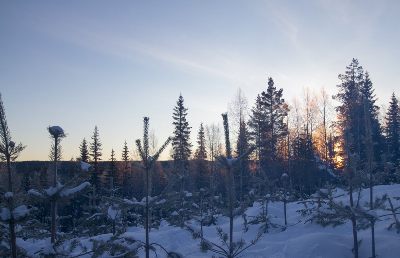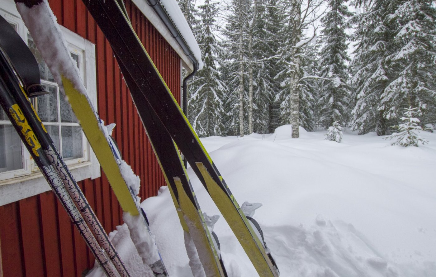 Alt begynner med en plan. Denne var enkel; starte fra Halsjøen i Våler/Hedmark, laste 2 pulker med mat og utstyr, og ta en dag av gangen med stø kurs mot sola ei ukes tid. Det ble seks dager hvor vi i hovedsak holdt oss i nabolandet, med en del mer snø enn vi hadde bedt om, 30 grader forskjell på dag og natt, åpne myrer i motlyset, åser kledd med barskog så langt vi kunne se, en studie i jakttårn og skogsbilveier, kontakt med velvoksne elger, overnatting i gamle skogsarbeiderkoier og stopp ved gjengrodde finnetorp, og til slutt en sjarmøretappe langs en velbrukt scooterled inn i gamlelandet. Her er en liten rapport i form av et "billedbrev". Haldammen, sør i Halsjøen. Her ble det fløtet tømmer frem til 1981, og tømmeret kom etter hvert ned i Glomma og videre til Borregaards anlegg. Bestefaren min jobbet 50 år som skogsarbeider, han fortalte at det lå så mye tømmer på Halsjøen vinterstid at isen bøyde seg. Årets høydepunkt var da dammen ble åpnet om våren og alt tømmeret skulle nedover elva. Vi skal imidlertid ikke dit, men oppover lia mot Juvberget, ikke helt til topps men opp mot finnetorpet med samme navn. Det er 6-7 km og tar 4 timer i bratt motbakke og med masse nysnø som har kommet i løpet av den siste tida.Vi følger den gamle kjerreveien opp Juvberget, og kjenner hvordan det må ha vært å være hest. Eller boende her oppe, for eksempel på plassen Gunnarshaug som det kun er tufter igjen av. Det er bratt og tungt, men vi finner en god rytme etter hvert. Ingen av oss har mye pulkerfaring, men det er som kjent bare én måte å få erfaring på. Dessuten vet vi at DNT-nøkkelen fungerer i Juvberget, og vi gleder oss til å nyte den første kvelden foran svartovnen på det gamle bruket. Det nærmer seg skumring når vi er framme på tunet på gården Juvberget, den ligger på norsk side av grensa. På Juvberget finner du Finnskogens bratteste partier, og en flott gård som ble ryddet av Liitiainen-slekta rundt 1670. Vi finner etter hvert nøkkelboksen og takker eierne for at de lar deler av huset du ser her, være tilgjengelig med DNT-nøkkel. Kvelden blir god med fyr i ovnen og velfortjent mat. Grensegata er et imponerende syn der den deler skogen i to mot sør. EU til venstre, moderlandet til høyre, ingen passkontroll. Under krigen kunne denne grensa bety liv eller død for nordmenn på flukt. For oss akkurat nå betyr den bedre muligheter for å finne scooterspor. Vi innser at det blir i overkant strabasiøst å dra pulkene i terrenget, så vi trekker over på svensk side. Scootersporet vi finner er langtfra ferskt, men ikke overraskende starter det akkurat ved grensegata. Jeg kjenner at motviljen mot oppmykning av scooterreglene blir en anelse mindre når fremdriften umiddelbart blir bedre. Gapahuker er det mange av på Finnskogen, og de er solid bygd av skogskarer, i kortreiste materialer. Når det er mye snø, er de ekstra gode å finne, ikke minst når det nærmer seg lunsjtid. Dette utmerkede eksemplaret befinner seg ved Hundbäcken på vei sørover mot bygda Järpliden, og passet perfekt for lunsj. Finnskogleden (merket sommerrute) passerer her, det er åpent og fint terreng gjennom furuskogen. Stemningen blir ikke dårligre av at bikkja får tiurer på vingene og at mattermosen er full av varme middagsrester fra gårsdagen. Kursen videre går mot den gamle skogsarbeiderkoia Nolbyholen. Koielivet. Hjemmekoselig inne på Nolbyholen, åpen koie som drives av såkalt Hembygdsförening. Godt med ved og i det hele tatt en fin plass å overnatte, når vi først fikk gravd frem inngangen. Tviler på at det hadde vært folk her på flere måneder. Jeg vekker Anne med Jularbo-vals neste morgen. Siden vi er på skauen har jeg byttet ut goretexjakka med ullgenser denne dagen. Det tar ikke så lang tid før det blir for varmt. Kursen settes mot Järpliden, bygda der Calle Jularbo skrev Livet på Finnskogane og Drømmen om Elin. Vi følger en skogsvei inn mot bygda, jeg liker det ikke helt, ser at det blir for fristende å gå der det er letttgått fremfor å følge myrer og høydedrag. To elger traver 150 meter foran oss på skogsbilveien, så vi får uansett valuta for veivalget. Bikkja bruker nesa mer enn øynene, og enser ikke elgene før han når frem til sporet. Det er mange år siden butikken i Järpliden stengte dørene for godt. Disken og vekta står igjen på innsiden, ellers er det stille i den gamle Jularbo-bygda. Noen har kjørt et ferskt scooterspor sørover langs Finnskogleden. Vi lar oss ikke be to ganger, og henger oss på. Gleden varer kun noen hundre meter, før sporet stopper. Det blir to km over myrene med snø til knes. En fin opplevelse, det går sakte, men kjennes godt. Vi bruker langfeller like så mye som kortfeller. Pulkene veier mellom 20 og 30 kg, i terrenget er det helt greit å ha skikkelig feste. Gapahuken ved Höcklingbäcken blir husvære på vei mot bygda Medskogen. Termometeret viser 18 minus, og det blir en kjapp skitur på morgenkvisten for å riste kulda ut av føttene. Neglespretten slipper taket etter hvert, og mens vi sitter der og koker morgenkaffe kommer endelig sola. Og den holder oss med selskap også de neste dagene. Lav morgensol ved Höcklingbäcken gapahuk. Med vårsola i fjeset og nydelige snødekte åser, blir det en flott dag. Vi finner et bra scooterspor som fører oss til Medskogen, på veien har vi rastet ved en ungfuruskog der en hel flokk elger må ha beitet de siste dagene. De er nok ikke langt unna når vi kommer. Skogsfugl ser vi ikke så mye av, antagelig ligger fugla i dokk etter at det kom 15 cm nysnø første natta. Godværet har satt inn, og vi har hele Finnskogen for oss selv. Det beste med pulk er at man kan ha med mye. Jeg har vært på et par "gramjegerturer", dette er i andre enden av skalaen, med mye god mat, sjokolade, kjeks, solide rasjoner, bacon til frokost hver dag osv. Isbor har vi også med, men det kommer aldri i bruk. Det er mye tømmerdrift på svensk side av Finnskogen, og vi