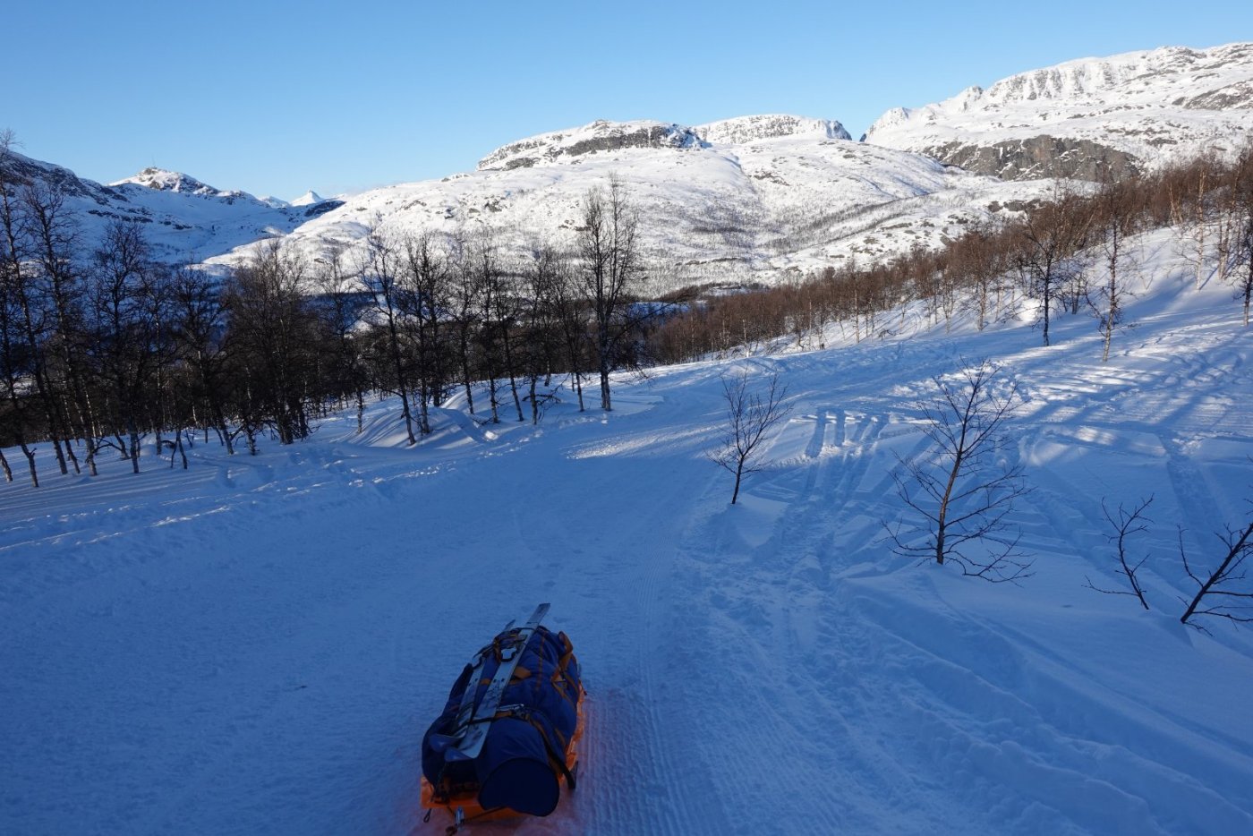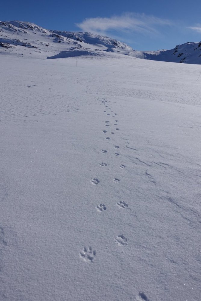 Advarsel: Rapporten vart lenger enn først tenkt, men les viss du orkar! Har i om lag eitt år hatt ein plan om å gå over Hardangervidda på ski. Lysta til å prøve seg på det i januar var større enn å gjere det på våren. Dette for å forhåpentligvis kjenne litt på kulda, samt å gjere det til ei litt større utfordring. Har heller aldri gått med pulk før og var gira på å teste denne typen vinterfriluftsliv. Det var også pirrande å ferdast i fjellet på ei tid då det ikkje er så mange andre til fjells. Etter å ha fått bytta vekk nokre vakter (turnuslivet er flott slik sett) falt datoen på 18.-26. januar. Ein kompis eg bur i kollektiv med ville også slenge seg på, då vart vi to mann som skulle bryne oss på Hardangervidda midtvinters. Vi berekna 8 dagar på heile turen og utgangspunktet for rute skulle vere frå hytte til hytte, men vi belaga oss på å sove i telt. Vi tenkte å gå ruta som ligg på ut.no, men vi var fleksible på endring undervegs. Vi er begge passelig gode skiløparar og har vore ute ei vinternatt før. Eg har likevel aldri sove så mange netter i telt vinterstid før, så dette skulle bli spennande. I følge veirmeldinga var det spådd -25C, knall sol og vindstille frå onsdag 18. Januar til søndag 22. Januar. Heilt nydelig! Eg hadde følgt med på veirmeldinga i om lag ein månad og sett at det hadde komt bra med snø og vore stabilt -10C. I tillegg hadde eg sjekka isforhold på iskart.no. 18. Januar, etter at Markus hadde vore på jobb til kl 13, var det duka for avreise frå Oslo til Finse var på toget som gjekk kl 16:40 frå Sandvika stasjon. Vi kjørte bil dit og fekk lessa av parispulkar og ski. Togturen gjekk fint med studering av kart, kaffidrikking og elgpåkjørsel som gjorde at vi vart forsinka med 1t til Finse. Vel framme kl 22 gjekk vi ut av toget til -25C og ein nydelig stjernehimmel. Vi gjekk om lag 500m over Finsevatnet og slo leir der. (Markus klar for avmarsj i 500m før første leirplass og leggetid.) Første kvelden smelta vi snø til dagen etter og hadde det over i ein 1L termos kvar og ei 1L Nalgeneflaske i hardplast. Vi tok oss også ein Monsen turmat til kvelds. Eg åt Tikka Masala, knallsterke greier som gjorde -25C til +30C i teltet. Sveitta som ein gris. God smak, men litt for sterk for mi gane. Etappe 1, Finse-Finnsbergskaret, ca 15km: Første morgonen, 19. januar, forsov vi oss litt. Vakna kl 08, trøytte som kyrkjerotter. Fekk i gong brennaren (MSR Whisperlite) og smelta snøv og kokt vatn til frukost. Hadde laga meg rasjonar på 155g med havregrynsblanding. Brukte Ousland si oppskrift med gryn, tørrmelk, brunt sukker, rosiner og rapsolje. Knallgod graut. Hadde det enkelt og greit over i termoskopp og varmt vatn oppi. Heilt genialt med termokopp frå Stanley. Vi fekk pakka ned teltet, rulla det sammen og lagt det i skiposen. Då er det enkelt å slå det opp på kvelden. Kl 10:15 var det avmarsj frå Finsevatnet. -25C, vindstille og lett overskya, men sola kom gradvis meir fram iløpet av morgonen. Over Finsefetene gjekk det fint. Uvant, men utruleg deilig å drage pulk istaden for å gå med tung ryggsekk. Stigninga opp frå Finse opp til Brattefonnvatnet var litt tyngre enn forventa, men føret var upåklagelig. Passelig hardt med eit tynt lag vindpåverka snø oppå, nokre tyngre parti i mellom. Kortfellane satt godt. Frå Brattefonnvatna gjekk vi vidare mot Midtnutevatnet der vi tok ei pause. Nøtter, sjokolade og bixitkjeks. Bixitkjeks er kjekt, 76kcal per kjeks. Nydelig turmat. Vi merka godt kuldeforskjellen oppe i høgdene og nede på vatna. Må ha vore -30C nede på vatna. Heldigvis var det vindstille, så det var berre å gå på utan å sveitte. Nede på Finnsbergvatnet såg vi første jervespora. I enden, før bakken opp til skaret, såg vi at det kom ein kar med pulk bak oss. Såg ut som han slo leir i nordenden av vatnet. Opp bakken, som eg meiner blir kalla Wieselbakken, gjekk det greit sidan vi var så heldige med føret. Det var hardt og fint, men kjente blodpumpa fekk trimma seg. I toppen av skaret slo vi leir for å sleppe verste kulda nede ved vatnet. Klokka var vel bikka 16. (Midtnutevatnet. Fin, vindpakka snø.) (Opp stigninga frå Finnsbergvatnet, Wieselbakken(?)) Kl 20:30 var det leggetid etter inntak av Monsens turmat, jegergryte. Ikkje så veldig god smak, og erteprotein istaden for kjøt. Einaste som forsvarer den turmaten er prisen. Det funkar likevel greit når ein sper på med smør og spekepølse oppi. Drakk rett i koppen suppe medan vi venta på drytechen, det er ein sikker vinnar som forrett! Med smør oppi blir den ekstra god. Til dessert vart det fortært løfse frå Vestlandslefsa og litt sjokolade. Etappe 2, Finnsbergskaret-Skaupsjøtunga: Vi vakna ganske utkvilt begge to kl 03, men vi drøyde an heilt til kl 06:30. Eg spurde om vi skulle drøye an til kl 07, men det vart nedstemt. På an igjen med snøsmelting, havregraut og kokekaffi. Vi unnar oss den ekstra luksusen med kokekaffi, då det er mykje betre smak på enn pulverkaffi. Litt kos må det vere på tur. Etter oppvåkninga merka eg at det hadde danna seg rim på innsida av soveposen (Dunpose med gåsedun frå Mountain Hardware, Komf -17C). Tips for å unngå dette blir mottatt med takknemmligheit. Var nok -25-30C på det kaldaste på natta. Teltet var totalt nedrima, så det var berre å få fram snøbørsta og børste i veg. Vart behagelig når vi fekk i gong brennaren. (Middagsmat etter 1. etappe. Termokopp med suppe og monsens jegergryte. Lagde ei plate til brennaren av kryssfinér frå botnen av ei gammal skuffe. Festa flaska med ei skistropp.) Det var ein nydelig soloppgong når vi pakka ned teltet og satte i marsj. Nede på Drageidfjorden var det kaldare igjen. Vi passerte Krækkja på avstand om lag kl 12 og kom oss over Halnebotnane mot Halne. På toppen av Halnebotnane varma sola såpass mykje at vi kunne ta av oss Gore-Tex jakka og gå berre i nettingen. Her la vi også soveposane på toppen av pulken for å 
