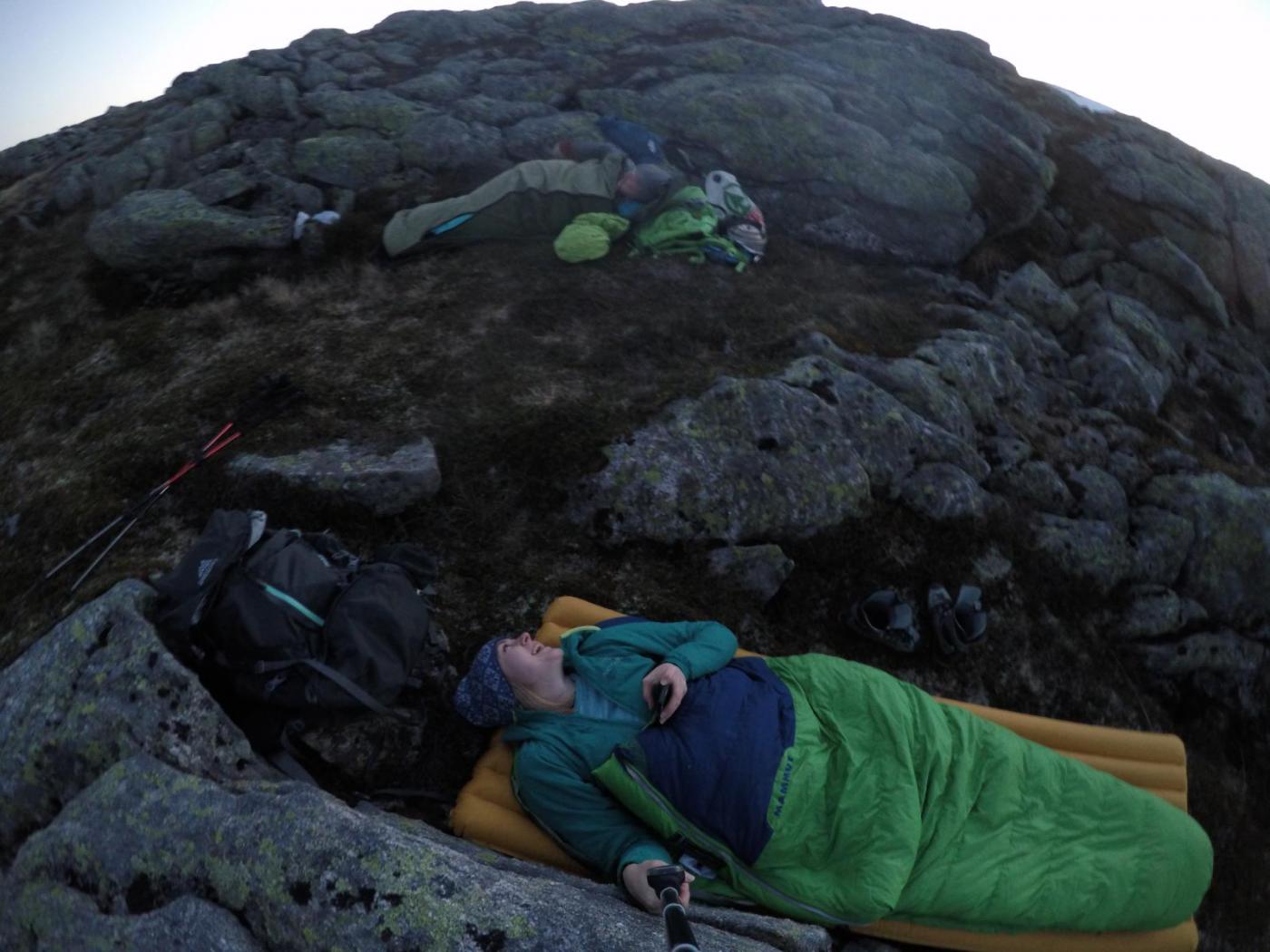 15. Overnatting under open himmel, take 2 Turen gjekk til Nivane i Ørsta i lag med ei venninne. Klok av skade frå fyrste under-open-himmel-tur i år så hadde eg overlatt ansvaret for kjøkken til henne, OG handla inn fancy-smæncy augebind (beste 50 kr eg har brukt på lenge!). Lite visste eg at problema skulle kome frå ein annan kant denne gong. Etter å ha lagt meg til for kvelden merka eg nemleg at eg etterkvart låg på bakkenivå. Det er ein vesentleg skilnad på dei 7 cm underlag synmaten gir når den funkar, og dei 7 cm som manglar når den IKKJE gjer det. Lite søvn på utenatt nummer 2 og, med andre ord. Med unntak av sterkt skrantande nattesøvn var det ein flott tur! Høg trivselsfaktor med mat, snacks og øl og god stemning. For ikkje å snakke om enorme mengder kaffi i solsteiken. Og møte med eit rypepar påsjekker'n og flott solnedgong. Så får det berre vere at ein er sånn omtrent 7 timar i minus på søvn og har fått tidenes raudfarge i sola.