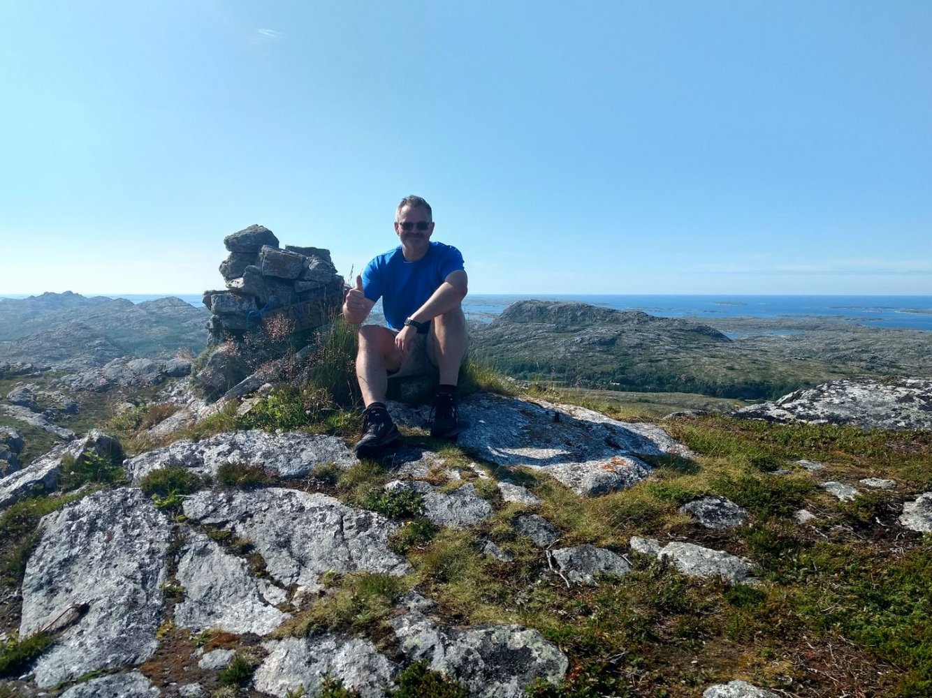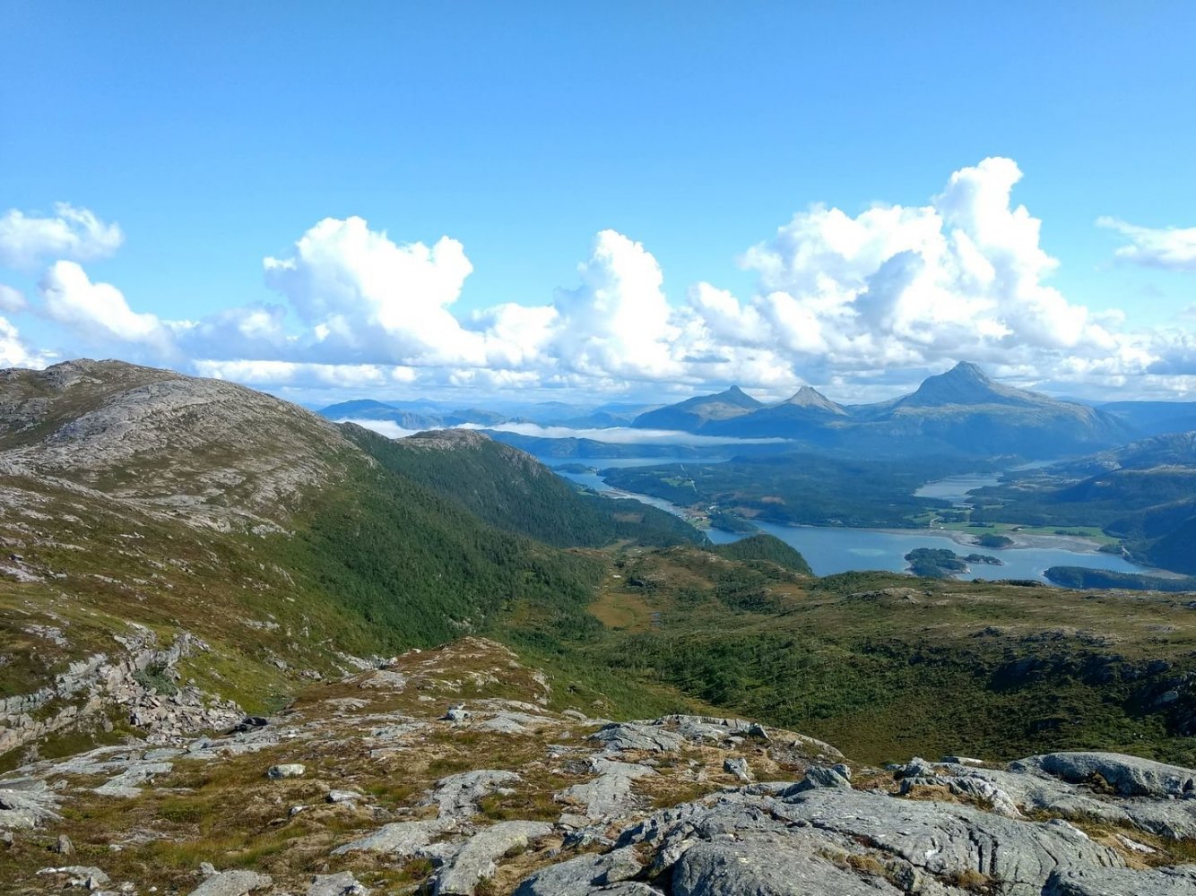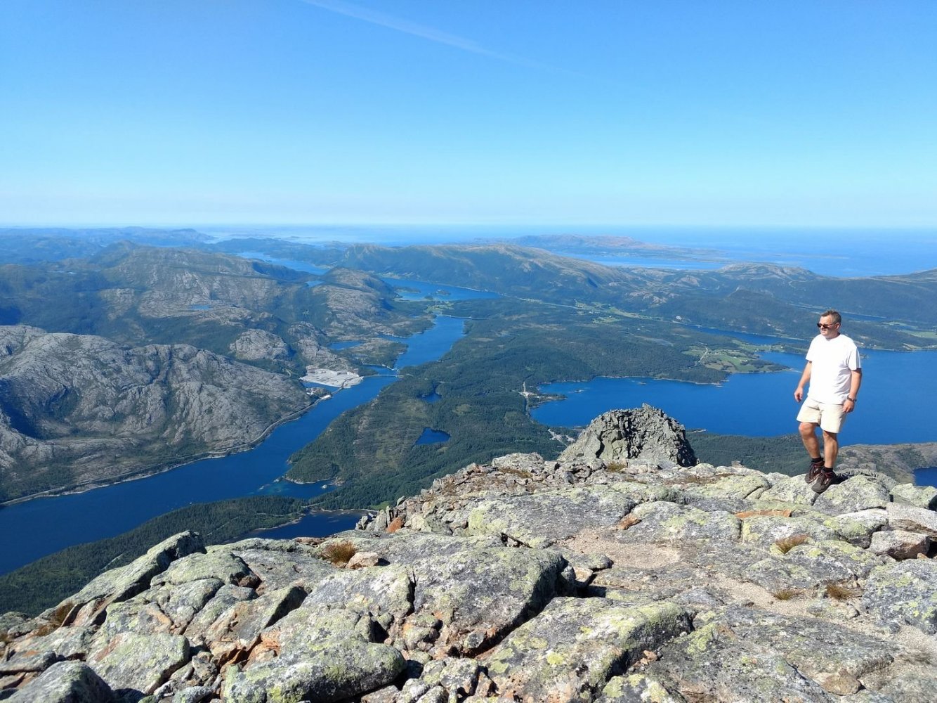 Etter en del om og men, ble det endelig en Fjelltrimtur i kveld - til Skiftingspynten (376 moh). Husket stemplingskortet, til og med Brukte 46 minutter på de 3,2 km opp fra havnivå, og som 50-åring med tresifret vekt er jeg fornøyd med det. I bakgrunnen, bak Leka, kunne jeg se at solen skinte på @Kjell Iver sin vakre Torghatt, mens skyene lå tungt over meg. En fin tur var det uansett, den sjuende Fjelltrim i år