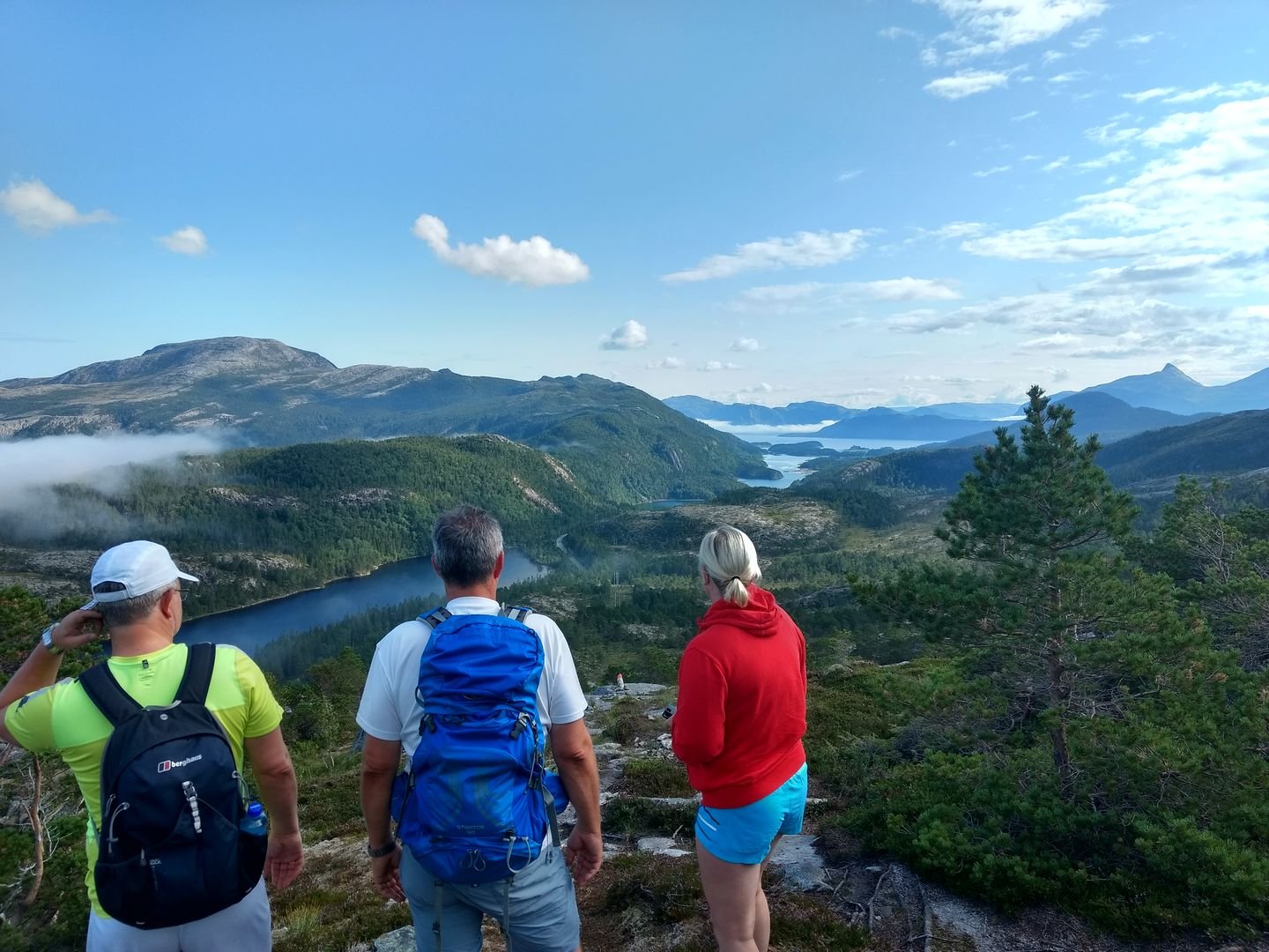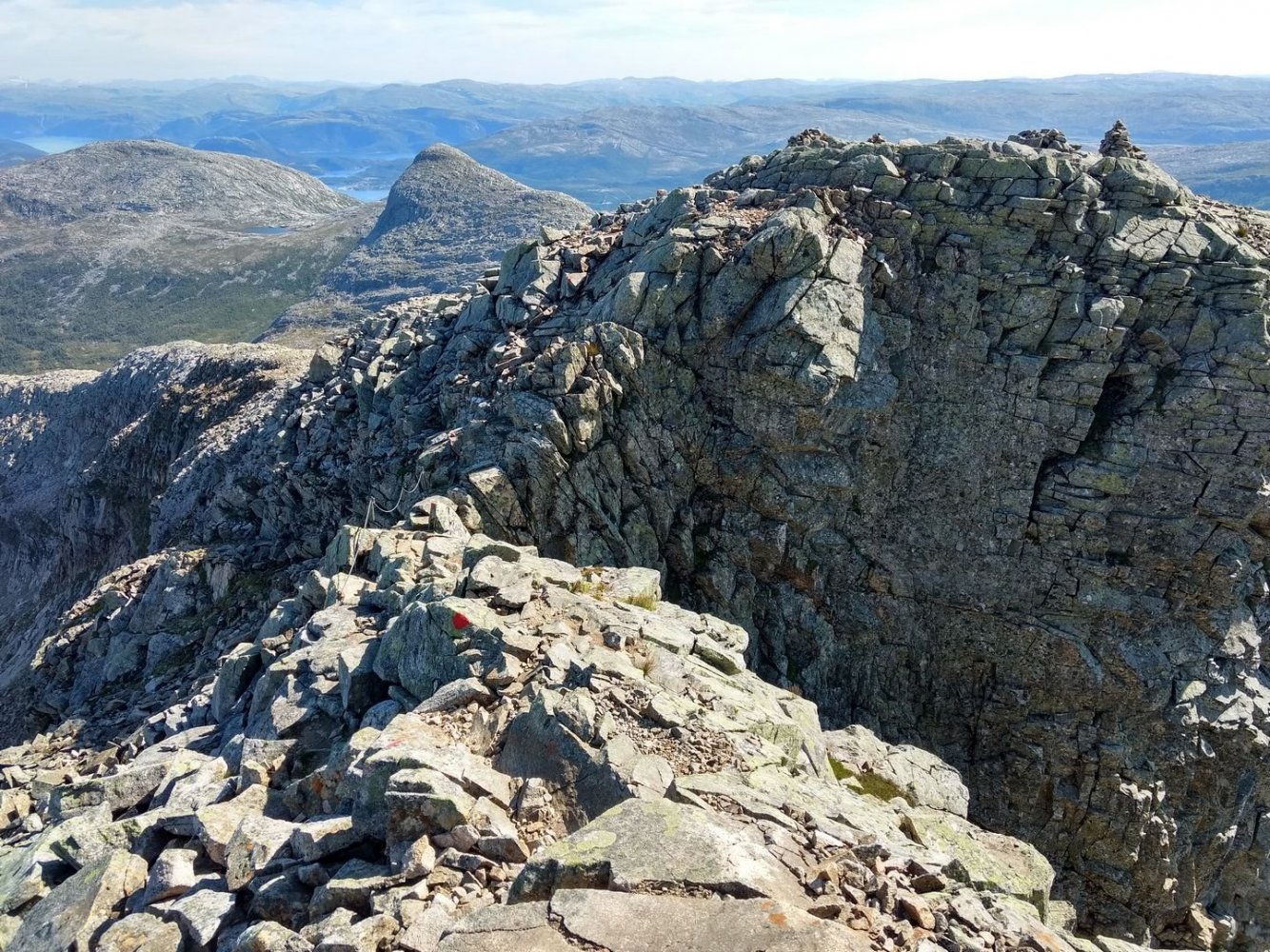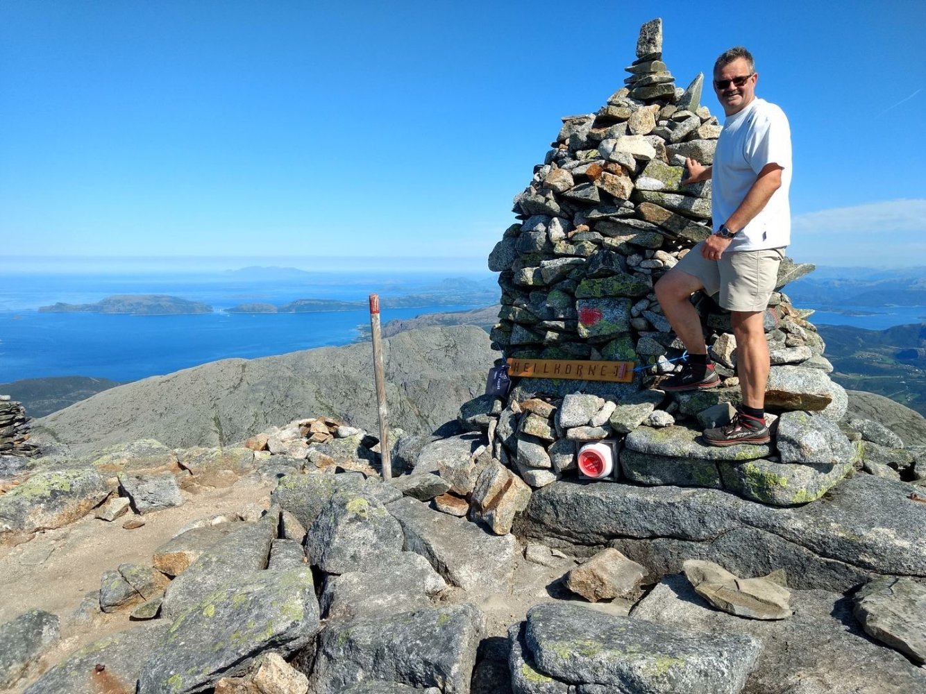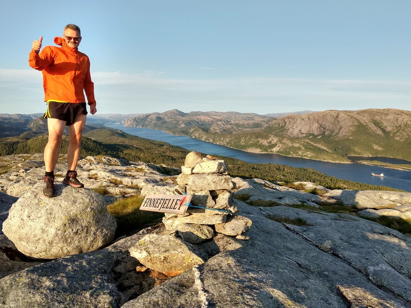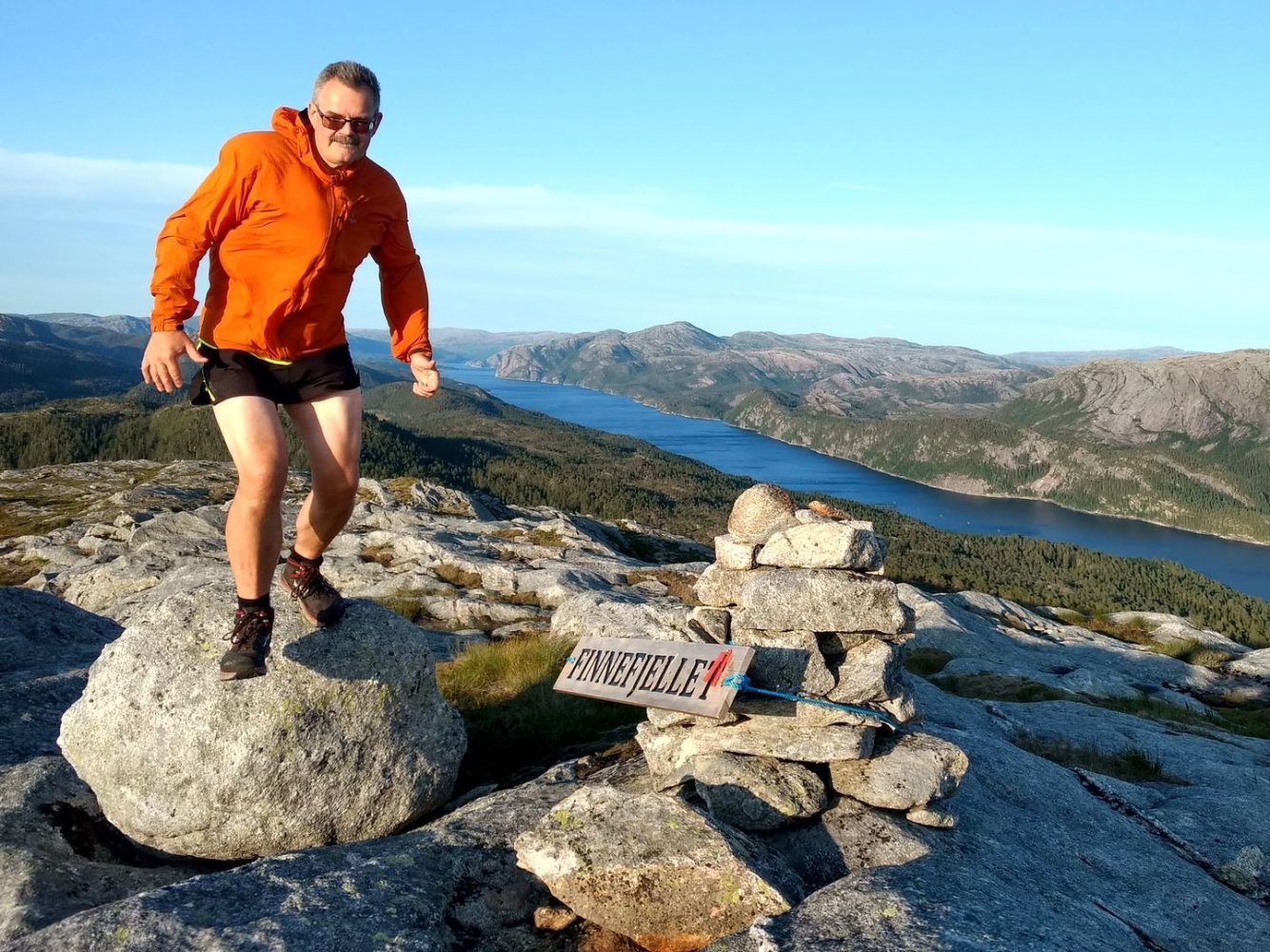 Det er to år siden jeg sist forsøkte meg på å gå opp Heilhornet i Bindal på under to timer - den gang gikk det på 1:47 (Link) I dag var det på tide å forsøke på nytt, etter at the big five-oh ble passert i januar. Så da gikk turen til RIL Fjelltrimmens juvel i kronen, Heilhornet (1058 moh). På bildet under er Heilhornet til høyre, Kula i midten og Lesshornet til venstre: Gikk uten ryggsekk, med en shorts med mange og store lommer. En halvlitersflaske i ene baklomma, solcap i den andre, fenalår mellom tykke osteskiver i Gladpack i ene framlomma, mobil i den andre, bilnøkler og fotoklips i lommer i skjorta og selvfølgelig den gamle trofaste fotostaven. Og til topps kom jeg : Her er Austra og Leka i bakgrunnen: Det er noen stykker med klyving og noen plasser som er småluftige - på en av de mest luftige plassen er det satt opp et kjettingrekkverk for å berolige de høydeskeptiske: Og tiden opp fra veien til toppen? Den ble 1:58, fortsatt under 2 timer, altså Men det er 11 minutter saktere enn da jeg var 48 år... Jeg tror delvis at det ikke skyldes alderes i seg selv, men at jeg jeg sparte krefter til stigningene ved å la være å jogge på noen transportetapper - jeg tok meg rett og slett mindre ut enn før. Bør nok kjenne blodsmaken om jeg skal ha en bedre tid enn det ble denne gang - får se om jeg greier å motivere meg selv til en bedre tid om et år eller to Uansett en flott tur og andreposten er oppdatert med enda en Fjelltrimtur