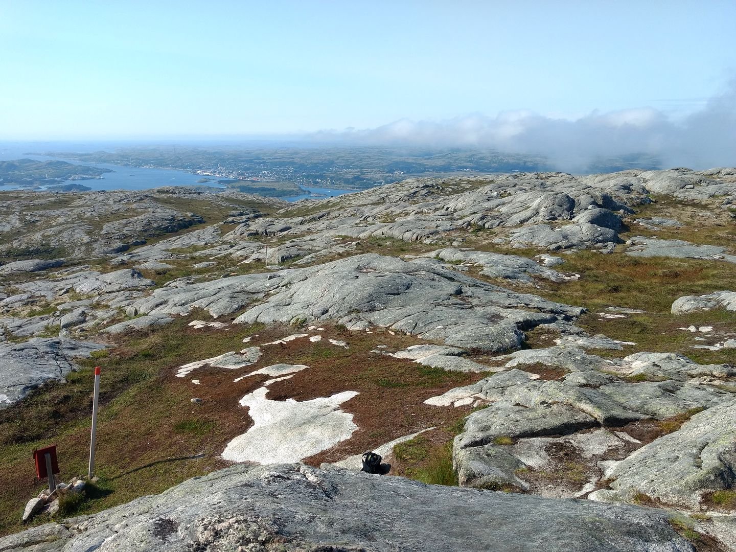 Da ble det både Fjelltrimtur nr 9 og endelig juledessertmulter i dag Dro med bror og svigerinne til toppen av Tyskenghatten (538 moh) på kanten av havskodda på en fin tur oppover. Forsøkte å få kontakt med en nevø som var på konfirmasjonssamling på en øy i Årsetfjorden nedenfor toppen, men det gikk ikke (det vise seg senere at de badet i sjøen ). I starten lå skodda ganske tett inntil stien: Men til topps kom vi, gitt : Tilbakeblikk etter at jeg la ut på tur vestover, mens turfølget dro ned til bilen igjen. Tyskenghatten til venstre, Heilhornet bak til høyre, og nevøen på øyen foran nedenfor Heilhornet: Og det ble ca 3 liter perfekt modne multer på turen nedover mot Hiller: Skikkelig fin sommerdag, med en givende tur i høyden Og andreposten er blitt oppdatert igjen.