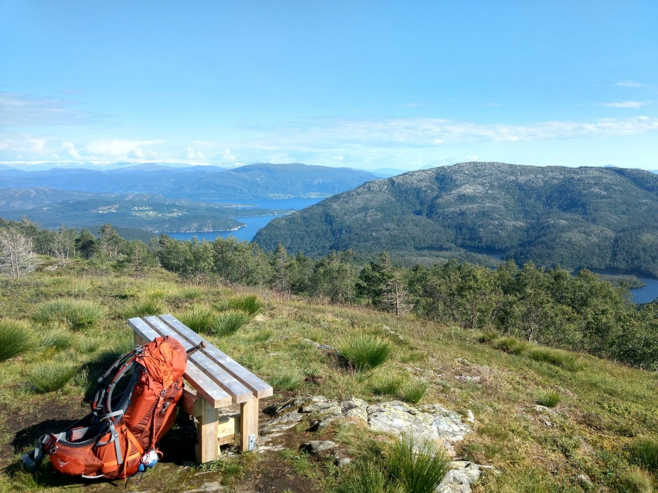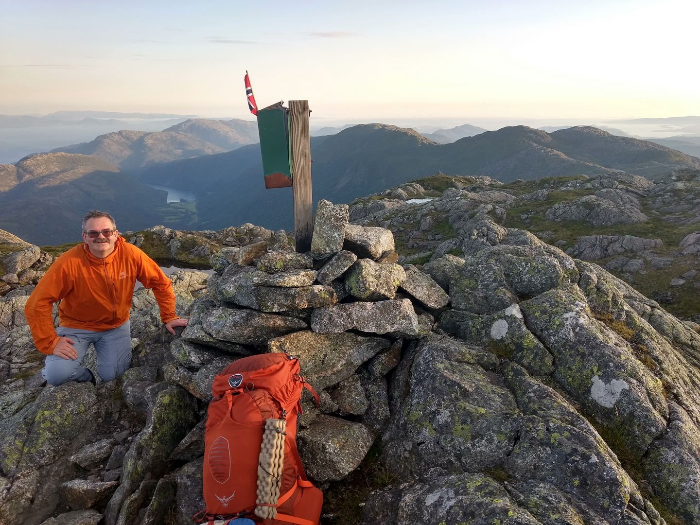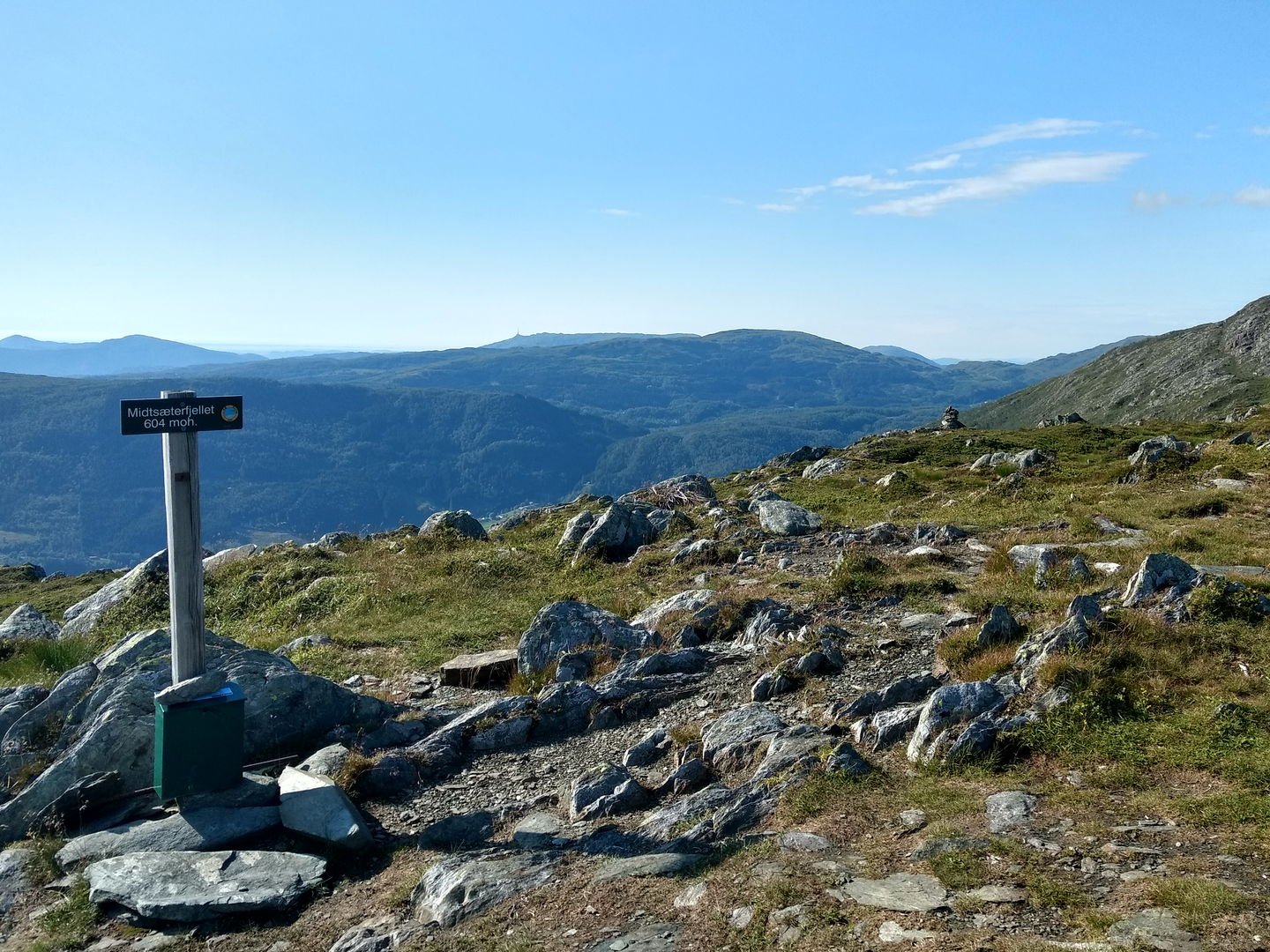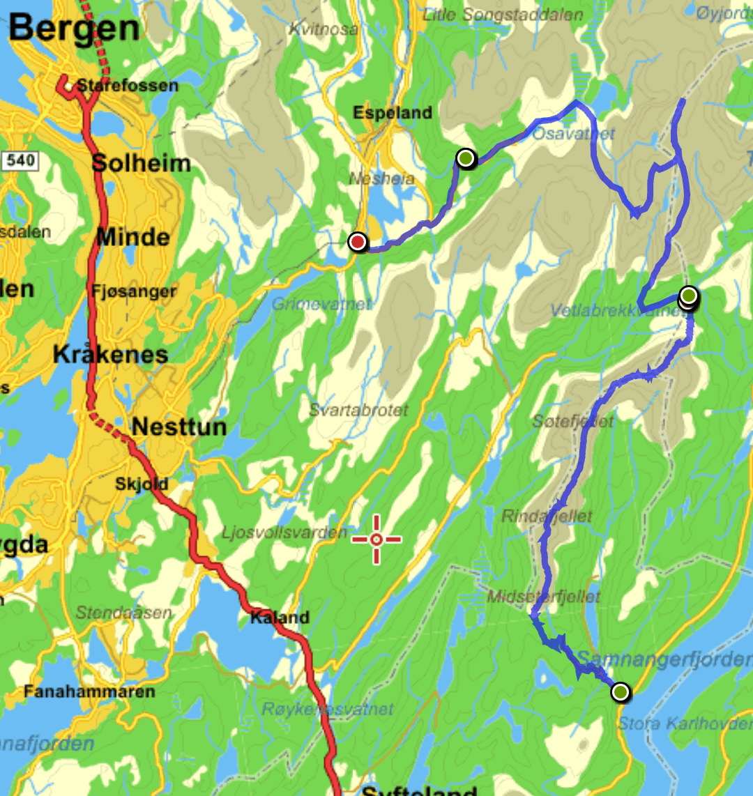 Torsdag avspaserte jeg de siste timene, og fikk aksept for å avspasere hele fredagen Jeg hadde ambisjon om å gjennomføre en litt redusert versjon av en tur jeg lenge hadde hatt lyst til å gå; fra Osøyro til Bergen via kommunetoppene Sveningen og Gullfjelltoppen. Planen var å forskyve starten fra Osøyro til Lønningdal, og gå derfra. Den ble faktisk ennå mer redusert, jeg kuttet litt på slutten også (kommer tilbake til dét), så GPS-sporingen (blå strek) over de vel 37 km ser slik ut: Ankom bussholdeplassen Lønningdal litt etter kl 16:00, innerst i en vik i Samnangerfjorden. I sekken lå det hengekøye, null telt - så her ble "walk high, sleep low" Veien gikk innover og oppover i et frodig landskap opp til en parkeringsplass ved Midtsæter, deretter traktorvei et lite stykke og så en sti med klopper opp til tregrensen: Bortimot kl 18:00 var jeg på første fjelltopp, og møtte en av få andre personer på min vei - en kort nikk og "Hei!", så dro han nedover og jeg videre oppover. Langt der bak i horisonten helt til venstre er Lyderhorn, nest "hump" er Løvstakken, i den lange dumpa befinner Bergen seg, før Ulriksmasten reiser seg nær midten av bildet: Et tilbakeblikk mot starten i Lønningdal fra Rindafjellet - en flott utsikt : Siste del av ryggen, stien sniker seg under toppen Søtefjellet og videre bortover mot kveldens mål til høyre. Bakenfor i midten ruver Søre Gullfjellstoppen/Sydpolen - dit skal jeg etter en natts søvn : Kommunetopp! Sveningen er 842 moh, og høyest i Os kommune. Ser ryggen jeg har gått fra venstre, bak postkassen og til høyre - flott tur! Men fyttirakkern det var tungt å slite med seg sekken opp de siste meterne, jeg tror jeg begynner å merke alderen (eller, det kan være en kjapp unnskyldning når man ikke har gått så mye i det siste?) : Fra Sveningen gikk turen ned til Litlebrekkvatnet, der det ble mat og hengekøyeoppsett. Etter å ha teltet der før en gang, hadde jeg sett for meg noen trær på en fin odde, men de sto akkurat 40-50 cm for langt fra hverandre. Fant et par andre bare 30-40m unna, fortsatt bare noen få meter fra vannkanten. Tåken kom som sluppet ut av en sekk bare minutter etter at jeg hadde fått alt på plass og skulle til å legge meg - tenkte ikke mer over det. Midt på natten våknet jeg av regn, uten at det regnet - skodda var så tykk at den mettet myggnettingen med vann, som slapp det ned på meg og soveposen. Ja, ja - nå vet jeg at dunsoveposen tåler mer fukt enn jeg fryktet Tåka lå der hele neste formiddag, og jeg kom ikke av gårde før rundt 12:30: Turen opp til Sydpolen var blytung, jeg brukte bortimot dobbel tid (2:15) ift når jeg har gått med friske bein og minimal pakking. Deilig å komme til topps, og få flott utsikt - blant annet over ryggen jeg hadde gått ila gårdagen. Ny kommunetopp! Gikk ryggen øst for Gullfjelltjørnane og dreide deretter inn på "standardstien", der jeg parkerte ryggsekken ved en varde og tok hoftesekken i avstikkeren opp til Gullfjelltoppen (988 moh). Møtte ikke en sjel på turen eller på toppen. Flott utsikt! Fulgte "standardstien" nedover, og tok en stopp ved vannet nedenfor Toro. Det hadde selvsagt vært passende med mat fra Toro der, men det ble en Summit to eat Beef stew. Med det kaloriunderskuddet jeg da hadde, smakte det fortreffelig Avsluttet med å forflytte 0,5 kg med IPA fra ryggsekk til innvortes last...: Fortsatte videre på stien, med en stopp på sanitærfasilitetene ved Redningshytten. Kom ned til sivilisasjonen, og mått knipse et bilde av grensene for nedbørsfeltet jeg gikk ut av: Fortsatte nedover Gullfjellveien til jeg ble lei, og begge føttene begynte å verke (pussig nok i lilletærne) - tok en avstikker opp fra veien mot Ramslandhovden, der jeg satte opp hengekøyen og forsøkte å holde meg våken for 23-nyhetene på radio. Det gikk så vidt, deretter knipset jeg et bilde og sov som en stein : På lørdags morgen var det på ny tåke. Mye fukt overalt - dog ikke så mye som ved Vetlebrekkvatnet, så ingen drypping fra oven, heldigvis. Planen var å komme seg ned til enten Haukeland eller Lone (dersom jeg trengte mer forsyninger), og så gå over Ulriken/Byfjellene til Bergen. Bel lei av asfaltgåingen, spesielt siden føttene fortsatt ikke var gode. Burde sikkert ha fortsatt fra Redningshytten til Livarden, og gått ned derfra til Unneland for å unngå mye asfalt - men, men. Uansett, da jeg nærmet meg Hardangerveien, lå skyene fortsatt lave rundt Byfjellene og lilletærne ga fortsatt smertelig uttrykk for mishag med siste dagers eventyr. Jeg måtte ta et valg, og det ble avlyst tur til tåkeheimen. Det ble istedet buss og bybane hjemover, gitt - kom hjem i lunstider: Til tross for en planlagt reduksjon i starten og en uplanlagt reduksjon i slutten, ble det en skikkelig flott tur! Og jeg fikk god uttelling på 2019-utfordringen mine; uteovernattinger økte fra 8 til 10, og kommunetopper doblet fra 2 til 4 Og når vi nå har passert midtveis av 2019, synes jeg at andreposten i denne tråden viser at jeg foreløpig er i rute