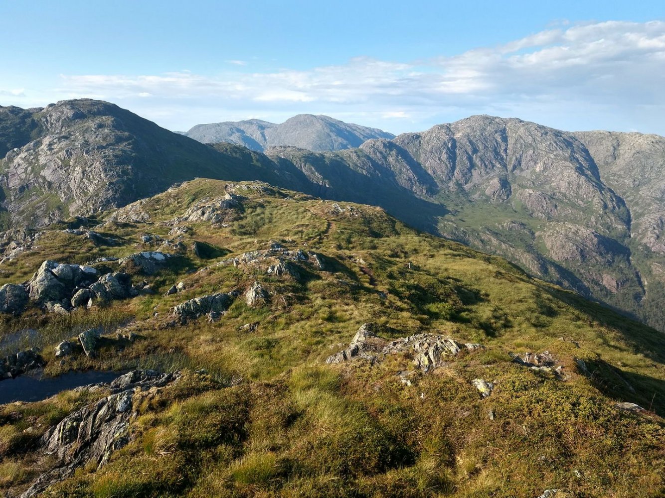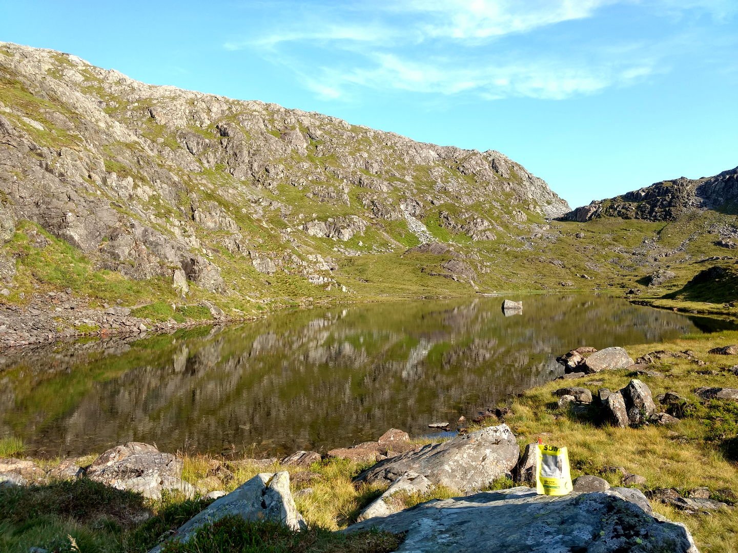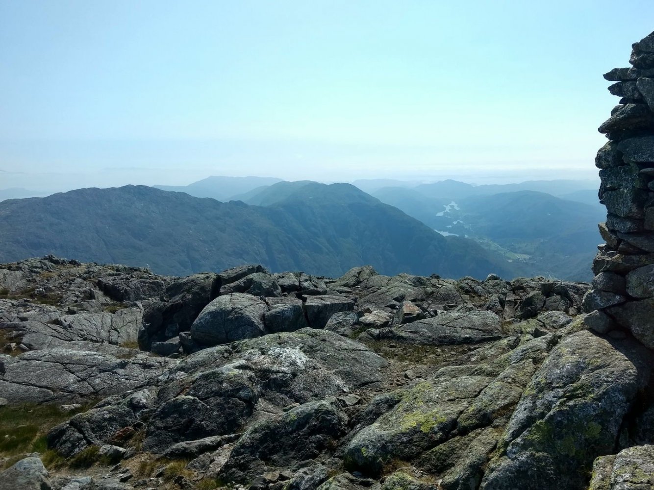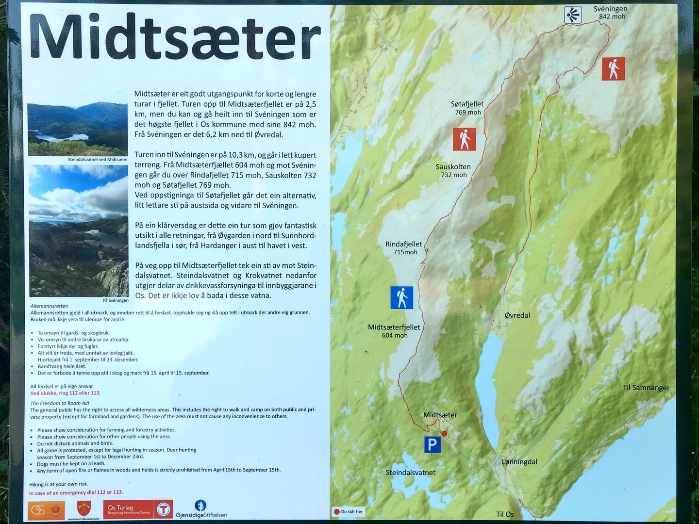 Torsdag avspaserte jeg de siste timene, og fikk aksept for å avspasere hele fredagen Jeg hadde ambisjon om å gjennomføre en litt redusert versjon av en tur jeg lenge hadde hatt lyst til å gå; fra Osøyro til Bergen via kommunetoppene Sveningen og Gullfjelltoppen. Planen var å forskyve starten fra Osøyro til Lønningdal, og gå derfra. Den ble faktisk ennå mer redusert, jeg kuttet litt på slutten også (kommer tilbake til dét), så GPS-sporingen (blå strek) over de vel 37 km ser slik ut: Ankom bussholdeplassen Lønningdal litt etter kl 16:00, innerst i en vik i Samnangerfjorden. I sekken lå det hengekøye, null telt - så her ble "walk high, sleep low" Veien gikk innover og oppover i et frodig landskap opp til en parkeringsplass ved Midtsæter, deretter traktorvei et lite stykke og så en sti med klopper opp til tregrensen: Bortimot kl 18:00 var jeg på første fjelltopp, og møtte en av få andre personer på min vei - en kort nikk og "Hei!", så dro han nedover og jeg videre oppover. Langt der bak i horisonten helt til venstre er Lyderhorn, nest "hump" er Løvstakken, i den lange dumpa befinner Bergen seg, før Ulriksmasten reiser seg nær midten av bildet: Et tilbakeblikk mot starten i Lønningdal fra Rindafjellet - en flott utsikt : Siste del av ryggen, stien sniker seg under toppen Søtefjellet og videre bortover mot kveldens mål til høyre. Bakenfor i midten ruver Søre Gullfjellstoppen/Sydpolen - dit skal jeg etter en natts søvn : Kommunetopp! Sveningen er 842 moh, og høyest i Os kommune. Ser ryggen jeg har gått fra venstre, bak postkassen og til høyre - flott tur! Men fyttirakkern det var tungt å slite med seg sekken opp de siste meterne, jeg tror jeg begynner å merke alderen (eller, det kan være en kjapp unnskyldning når man ikke har gått så mye i det siste?) : Fra Sveningen gikk turen ned til Litlebrekkvatnet, der det ble mat og hengekøyeoppsett. Etter å ha teltet der før en gang, hadde jeg sett for meg noen trær på en fin odde, men de sto akkurat 40-50 cm for langt fra hverandre. Fant et par andre bare 30-40m unna, fortsatt bare noen få meter fra vannkanten. Tåken kom som sluppet ut av en sekk bare minutter etter at jeg hadde fått alt på plass og skulle til å legge meg - tenkte ikke mer over det. Midt på natten våknet jeg av regn, uten at det regnet - skodda var så tykk at den mettet myggnettingen med vann, som slapp det ned på meg og soveposen. Ja, ja - nå vet jeg at dunsoveposen tåler mer fukt enn jeg fryktet Tåka lå der hele neste formiddag, og jeg kom ikke av gårde før rundt 12:30: Turen opp til Sydpolen var blytung, jeg brukte bortimot dobbel tid (2:15) ift når jeg har gått med friske bein og minimal pakking. Deilig å komme til topps, og få flott utsikt - blant annet over ryggen jeg hadde gått ila gårdagen. Ny kommunetopp! Gikk ryggen øst for Gullfjelltjørnane og dreide deretter inn på "standardstien", der jeg parkerte ryggsekken ved en varde og tok hoftesekken i avstikkeren opp til Gullfjelltoppen (988 moh). Møtte ikke en sjel på turen eller på toppen. Flott utsikt! Fulgte "standardstien" nedover, og tok en stopp ved vannet nedenfor Toro. Det hadde selvsagt vært passende med mat fra Toro der, men det ble en Summit to eat Beef stew. Med det kaloriunderskuddet jeg da hadde, smakte det fortreffelig Avsluttet med å forflytte 0,5 kg med IPA fra ryggsekk til innvortes last...: Fortsatte videre på stien, med en stopp på sanitærfasilitetene ved Redningshytten. Kom ned til sivilisasjonen, og mått knipse et bilde av grensene for nedbørsfeltet jeg gikk ut av: Fortsatte nedover Gullfjellveien til jeg ble lei, og begge føttene begynte å verke (pussig nok i lilletærne) - tok en avstikker opp fra veien mot Ramslandhovden, der jeg satte opp hengekøyen og forsøkte å holde meg våken for 23-nyhetene på radio. Det gikk så vidt, deretter knipset jeg et bilde og sov som en stein : På lørdags morgen var det på ny tåke. Mye fukt overalt - dog ikke så mye som ved Vetlebrekkvatnet, så ingen drypping fra oven, heldigvis. Planen var å komme seg ned til enten Haukeland eller Lone (dersom jeg trengte mer forsyninger), og så gå over Ulriken/Byfjellene til Bergen. Bel lei av asfaltgåingen, spesielt siden føttene fortsatt ikke var gode. Burde sikkert ha fortsatt fra Redningshytten til Livarden, og gått ned derfra til Unneland for å unngå mye asfalt - men, men. Uansett, da jeg nærmet meg Hardangerveien, lå skyene fortsatt lave rundt Byfjellene og lilletærne ga fortsatt smertelig uttrykk for mishag med siste dagers eventyr. Jeg måtte ta et valg, og det ble avlyst tur til tåkeheimen. Det ble istedet buss og bybane hjemover, gitt - kom hjem i lunstider: Til tross for en planlagt reduksjon i starten og en uplanlagt reduksjon i slutten, ble det en skikkelig flott tur! Og jeg fikk god uttelling på 2019-utfordringen mine; uteovernattinger økte fra 8 til 10, og kommunetopper doblet fra 2 til 4 Og når vi nå har passert midtveis av 2019, synes jeg at andreposten i denne tråden viser at jeg foreløpig er i rute