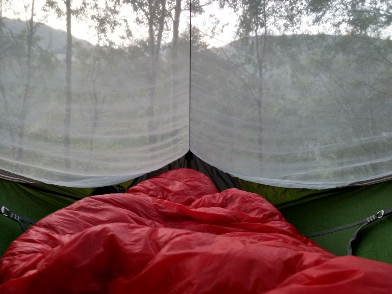 På Orion III UL 2017 er samtlige glidelåser to-veis med to dragere. På innerteltet åpnes glidelåsen ved å dra dragerne ut mot ende(r). Samme med panelene over myggnetting i innerdørene. På ytterteltet åpnes glidelåsen ved å dra drager inn fra ende(r). Det er en begrensning dersom du åpner ved å dra øvre drager ned - da får du ikke delt glidelåsen helt nederst, og kan ikke folde døren til side slik du kan når du åpner ved å dra nederste drager opp. Det er imidlertid enkelt å kikke ut, ventilere og om teltet ikke er superstramt satt opp bør det også gå greit å smyge seg ut gjennom glipen. Her er glip med øvre drager dratt noe ned markert med blå pil: På Orion III UL 2017 er samtlige strammere plassert nær teltveggen. Jeg synes de er svært enkle å bruke, men har fått med meg at det kan lønne seg å slå et halvstikk med tampen for å sikre strammingen dersom det blir mye vind. Siden dette er UL, er bardunlinen bare 2mm tykk og blir da kresen på strammere - til gjengjeld er den reflekterende og med kjerne av Dyneema. Jeg ønsker at linene hadde vært litt lengre. Linker til strammere hos Dutchwaregear: https://dutchwaregear.com/product/slide-lock/ og https://dutchwaregear.com/product/line-lock-light/ Ytterst på "Slide Lock"-linene har Exped det de kaller en "Claw Hook" (Link), som jeg vel egentlig kan styre min begeistring for. Sparer noen sekunder om man skal belegge i et tre, muligens en stein, men er ikke særlig hjelp ved bruk av plugger. Har ikke giddet å fjerne dem ennå, så de er vel ikke så mye i veien heller- 19 svar