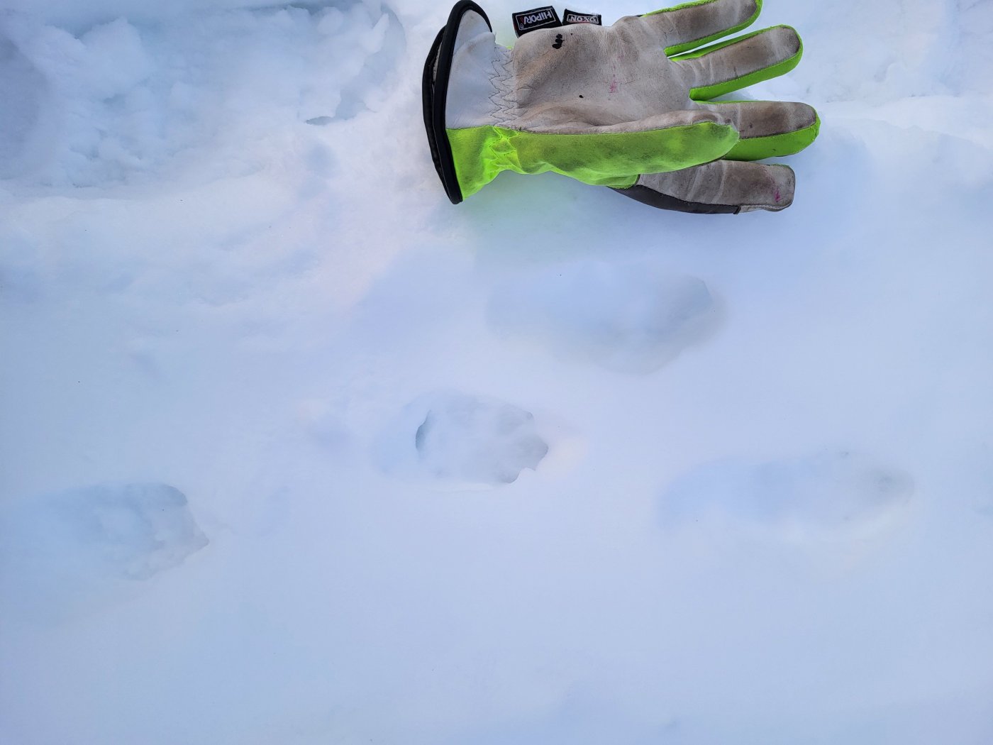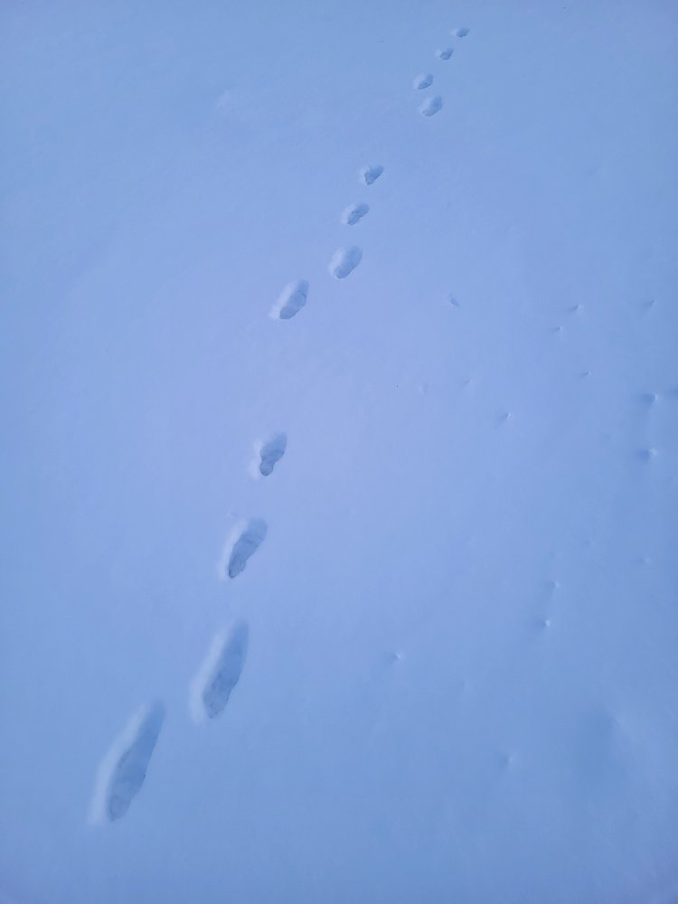 Ett par spor fulgte en sti ned mot hytta. Gikk rundt hytta og ut i hagen. Potene er "store" har klør. Tross at det ikke er klassiske harespor mistenker jeg den svære haren som kvilte bak garasjen i forrige uke.