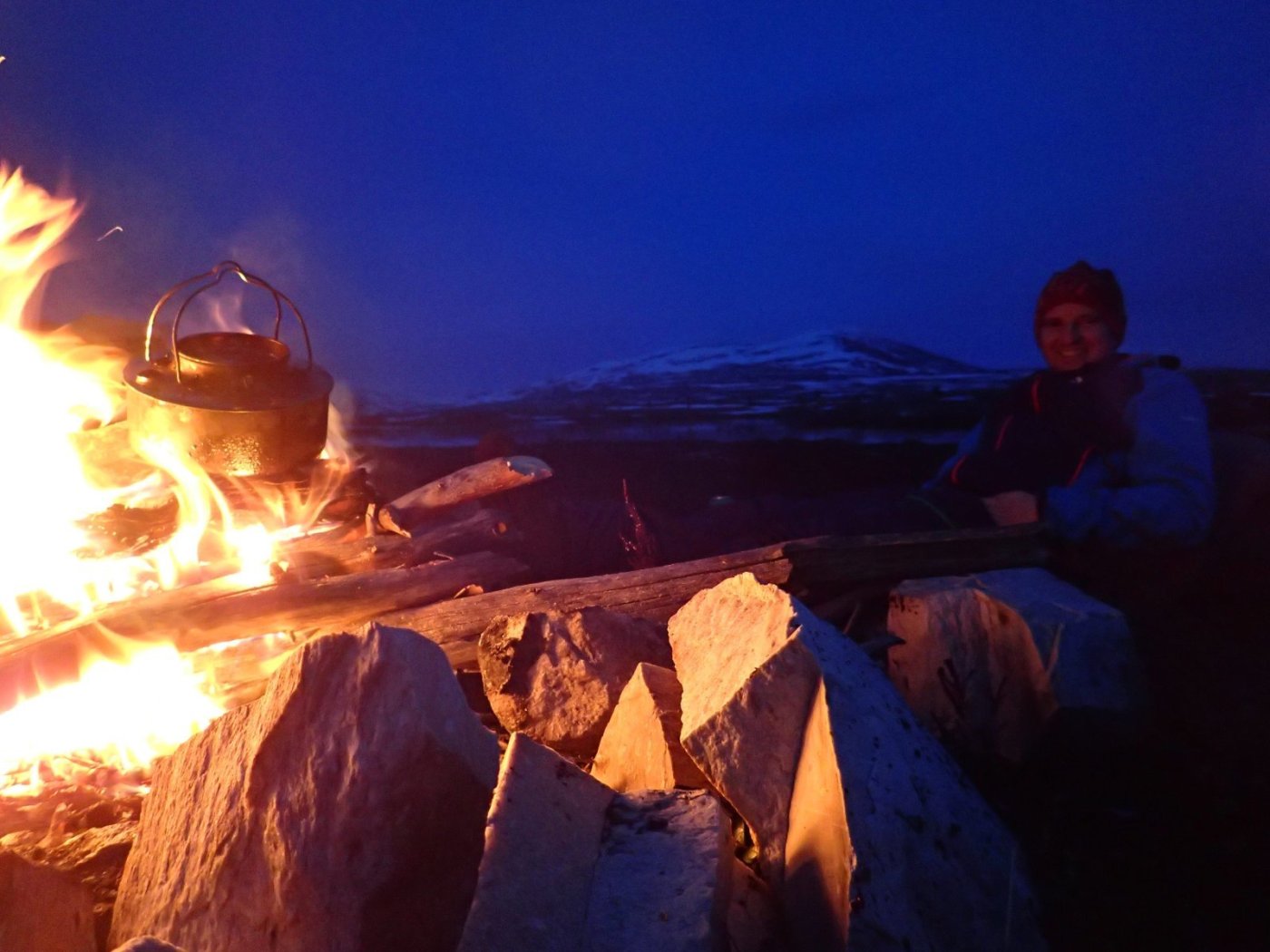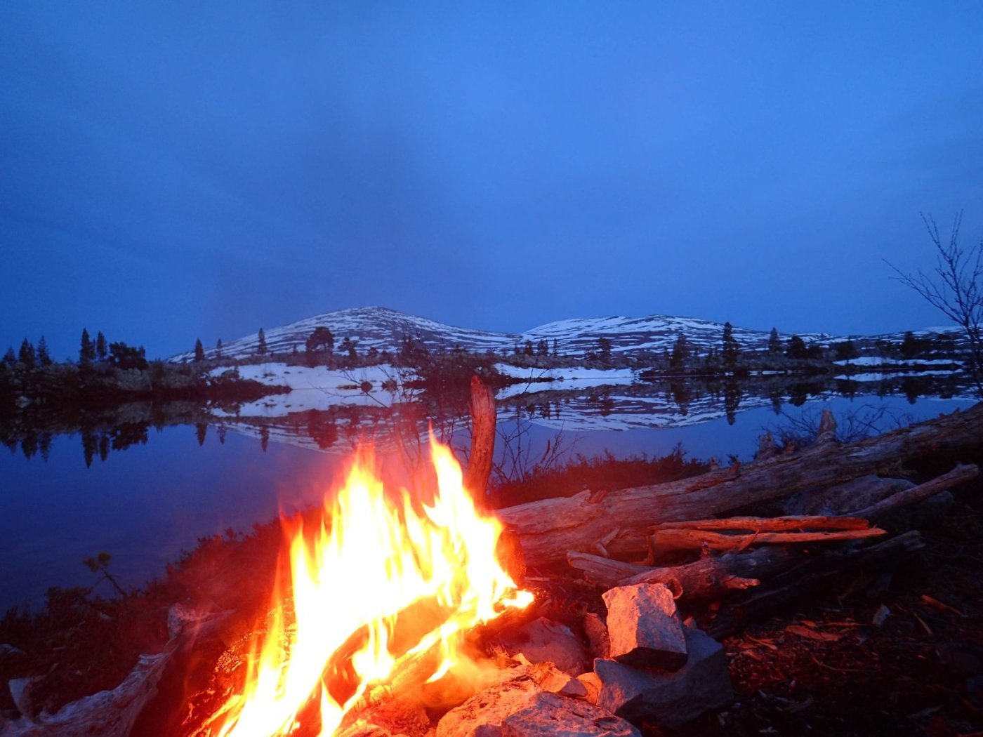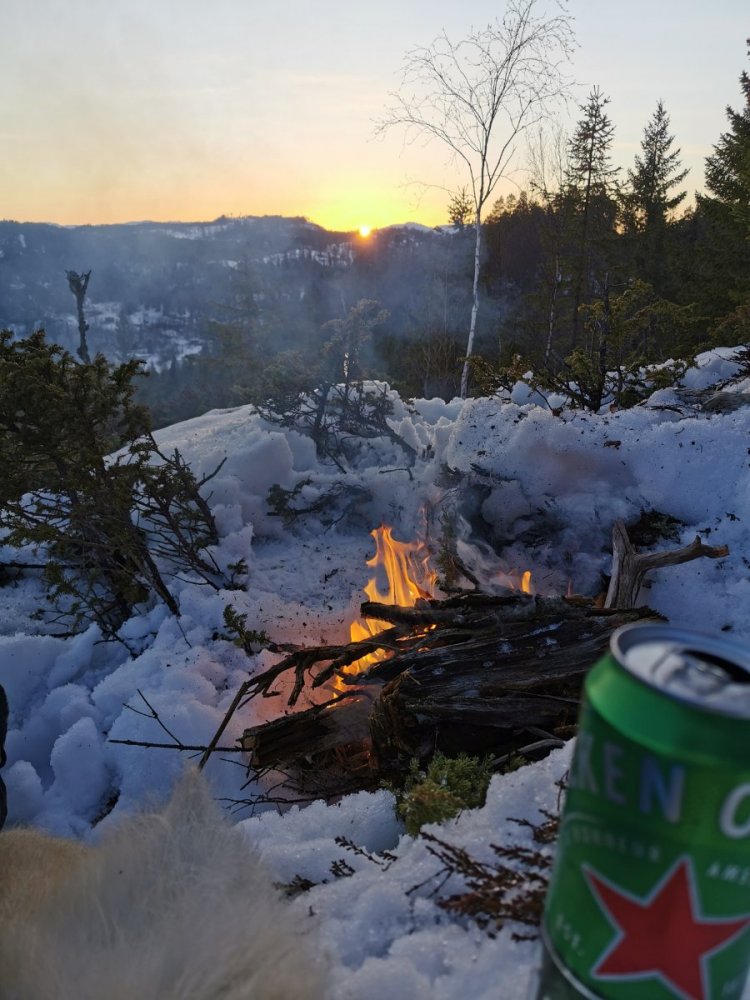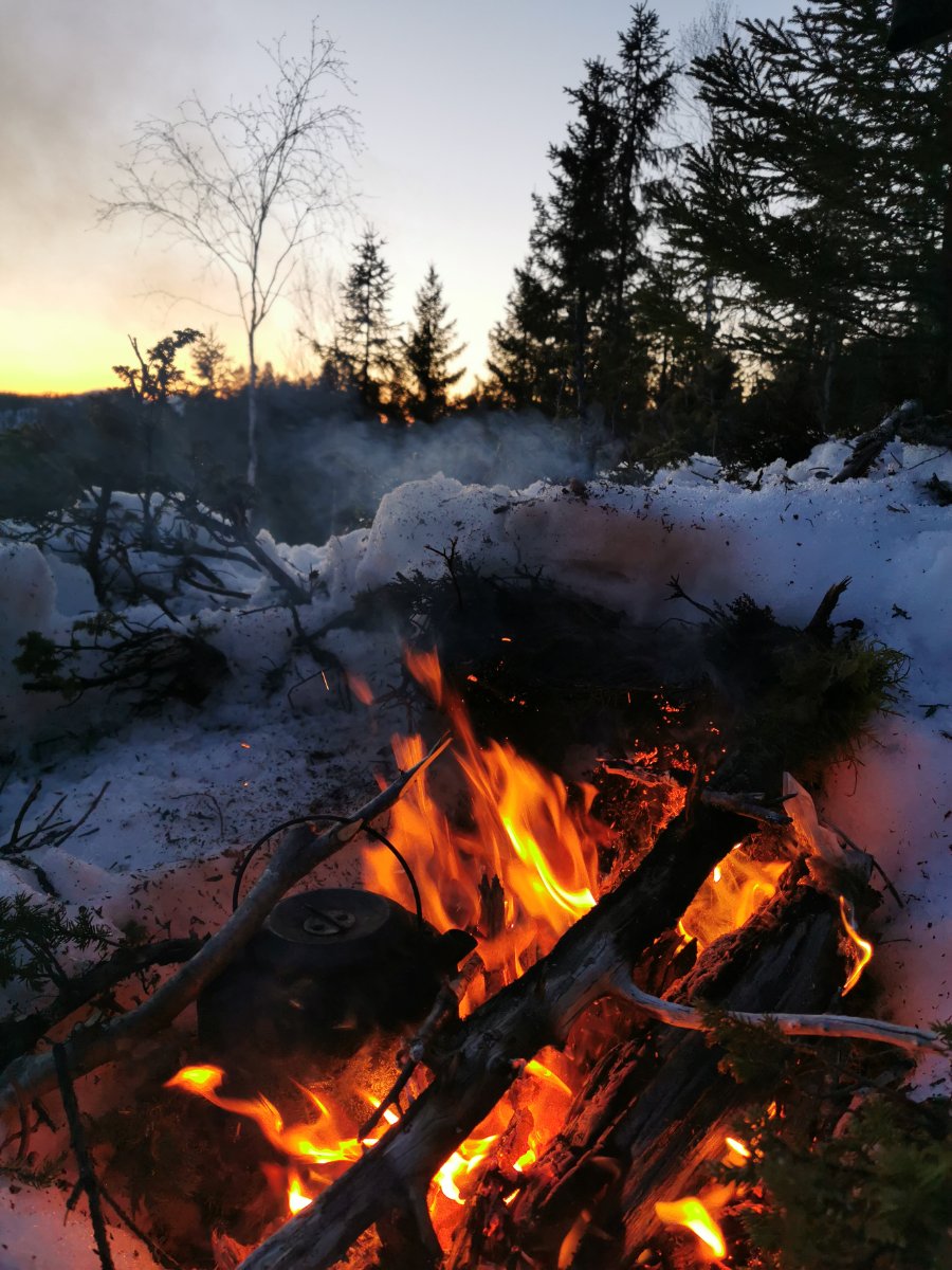 Man kan drømme om Norge på langs og Canada på tvers, men i noen perioder av livet må man bare akseptere at noen timer ved bålet i marka bak huset er det man får. Denne fredagskvelden trosser jeg dørstokkmila etter at avkommet har sovnet, og sykler et stykke opp i bakkene mot markaområdene vi har bak huset. Godværet og den første våryrheten har meldt sin ankomst. Jeg har tenkt meg opp til den faste bålplassen min, som ligger høyt opp og fint til for solnedgangen. Jeg parkerer sykkelen og smetter på trugene, og legger i vei inn i skogen. Det er et kappløp mellom meg og de siste solstrålene. Jeg kjenner fort at jeg rett og slett ikke orker hele turen opp til plassen min i dag. Jeg er helt kake. Jeg finner i stedet en nokså fin kolle med litt utsyn, langt nok bort fra vei og sti til at jeg føler meg helt alene. Ikke det at det kommer folk innover her i kveld uansett, men allikevel. Jeg finner nok brukbar ved til bålet, fyrer opp, finner godstillingen på reinskinnet akkurat i tid til å få med meg solnedgangen. Jeg ser at bålet blir bra. Alle vet at det er forskjell på et godt og et dårlig bål. For en gangs skyld går røyken rett vekk fra meg. Det er fredag, så jeg unner meg en øl. Roen kommer sigende, med tyngde. Det er alt for lenge siden sist. I det skumringen tar over for dagslyset begynner en kattugle å tute et stykke lenger inn i marka, men ikke lenger unna enn at det føles nært. Kattuglas spøkelsesaktige lyd minner meg om ulvehyl. Ulveuglas spill gjør at jeg et øyeblikk føler meg hensatt til dypere ødemarker. Håmmårbekken nede i dalen under meg høres unektelig ut som Thelon river. Her hvor jeg sitter har ingen sittet før, det er jeg sikker på. Denne marka står akkurat nå ingenting tilbake for Nordvestterritoriene. Jeg sender noen snapper til noen jeg vet setter pris på slike snapper, og tar noen bilder, før jeg legger vekk telefonen og suger inn øyeblikket til det fulle. Når ølen er tom blir det et par brødskiver med ost på bålet. Ulven og Thelon bråker ufortrødent videre. Jeg legger meg tilbake på reinskinnet og kikker opp på den kveldsblå himmelen og de karakteristiske pistrete grantoppene man finner her øst for Store Slavesjø. I det mørket begynner å få fullstendig overtaket, og den siste veden er brent opp, slutter ugla å tute, og jeg pakker sammen og trasker ned igjen. Mens jeg triller ned bakkene på sykkelen, tenker jeg hvor heldig vi er som har marka så nært. Den er ikke urørt og utilgjengelig, men den er stor nok og vakker nok på sin måte. Jeg håper det blir mulighet for flere slike kvelder. Og drømmen om Norge på langs og Canada på tvers kommer nok til å leve videre.