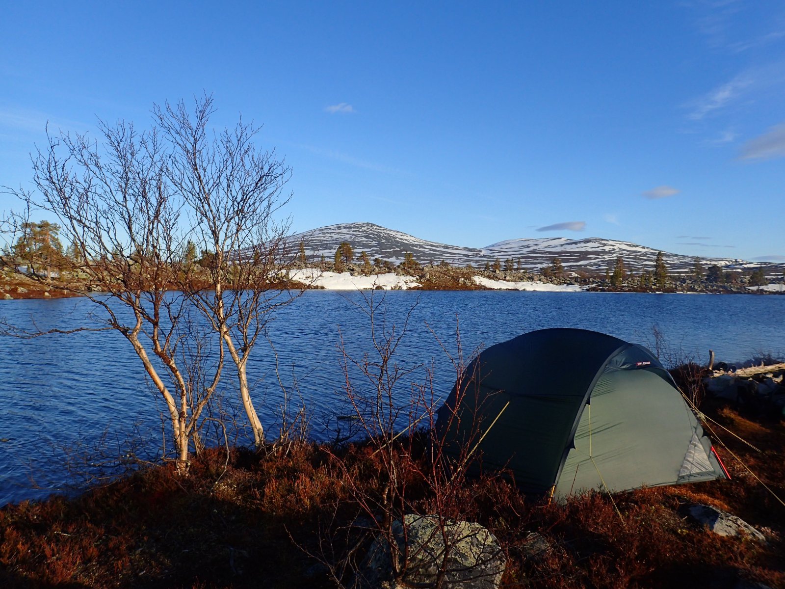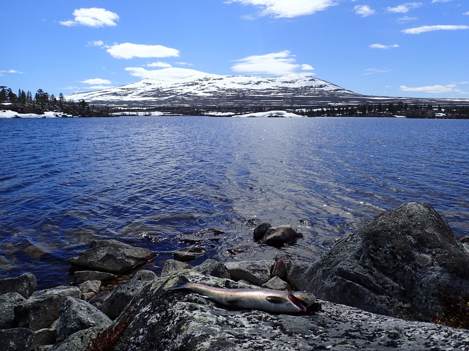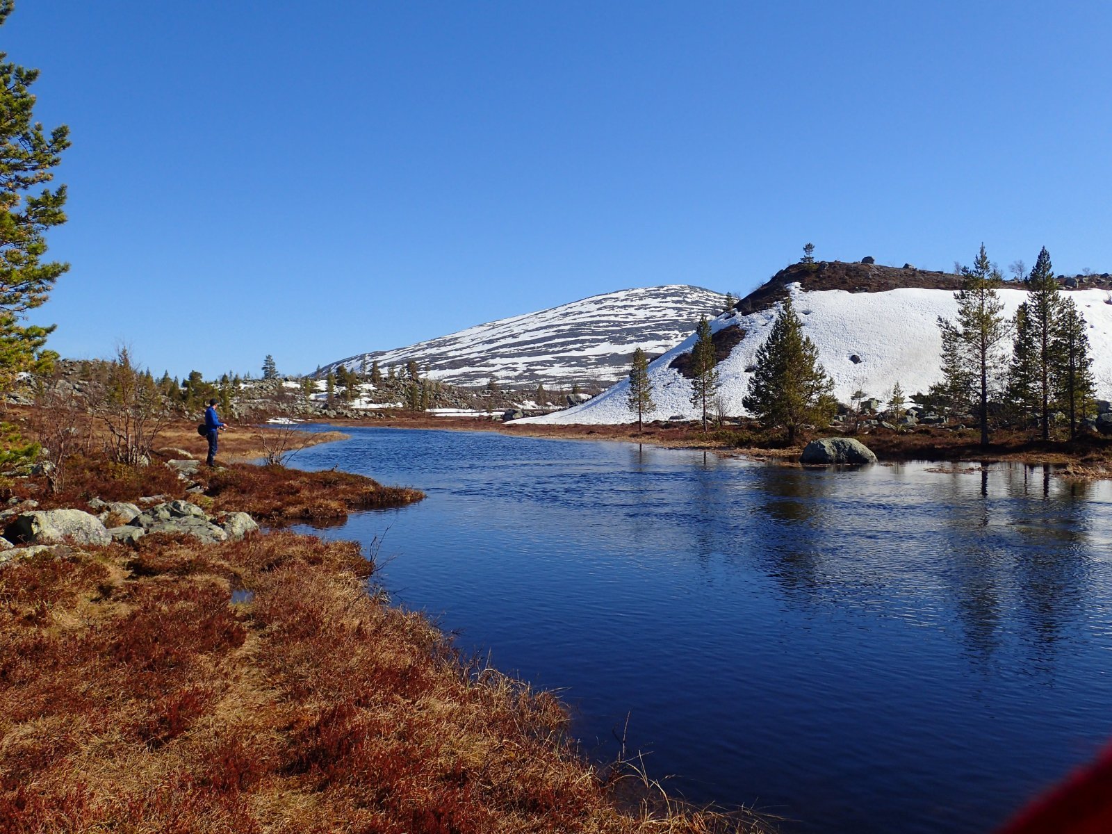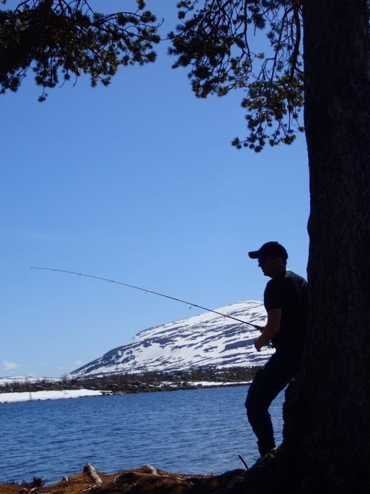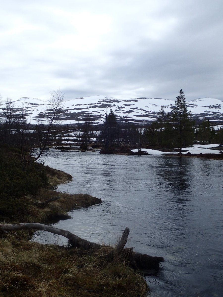 Nå som vi er inne i den mørkeste tida av året passer det kanskje med noen bilder fra vår og tidligsommer i Femundsmarka. Turen i månedsskiftet mai/juni 2021 var min 9. og foreløpig siste tur innover i Femundsmarka. Som alltid er man litt usikker på vær og føre når man drar så tidlig, men vi fikk marka helt for oss selv, og virkelig noe i nærheten av en drømmetur. I hvert fall huskes det sånn når man ser på bildene såpass lenge etterpå. Her følger en bildetung og for øvrig kortfattet rapport fra turen. Avreise fra Jonasvollen sent på kvelden 28. mai. Over Femunden, opp på Røvolfjellet, og videre ned mot Røa. Trekvart kilo harr på første kast. Oppover langs Røa første dag, etter en kald natt og en lang morgen med mange kopper kaffe. Andre kveld og natt tilbringes ved Midtrøsta, ved foten av Kratlvola. Henning drar opp indrefilet av hjort, bearnaisesaus og øl fra sekken. Du verden som vi koste oss. Langt nede mellom noen store steiner finner jeg tilfeldigvis noe som ser ut som et gammelt syltetøyglass med små fisk inni. Vi spekulerer lenge og vel på hva dette kan være, men finner ikke noe svar. Fisken er rimelig godt bevart. Etter hjemkomst er jeg i kontakt med fjellstyret, men de er også blanke. Noen som vet? Videre i kronglete terreng over mot Kratlan, via Voltjønnan. Fra disse høydene får man et nytt perspektiv på marka. Favorittutsikten min, østover fra Kratlvoltangen. Fremdeles noe is på Vonsjøen. Neste natt tilbringes ved Halvkoitjønna. Ved ankomst er jeg så varm at jeg rett og slett må ta et bad. Temperaturen er slett ikke ille med tanke på at vi fremdeles skriver mai. I en bålgrue ved tjønna er det lagt igjen masse senerester. Der har en rype viklet seg inn og endt sine dager. Hva skal man si om slikt? Ubetenksomhet, dumskap, vond vilje? Jeg snakker da naturligvis ikke om rypa, men om mennesket som ikke brant opp eller tok med seg sena si. Særdeles unødvendig. Jeg sender bildet til fjellstyret og de lager en liten sak på det på nettsida for å vise hva som kan være konsekvensen av å bruke bålgrua som søppelplass. Nydelig vårkveld i Grøtådalen. Hoggorm har jeg aldri sett i Femundsmarka før. Ved Stortjønna biter omsider fisken. Det har vært steindødt hele veien opp langs Røa, i Kratlan og ved Halvkoitjønna. Så er tiden omsider kommet for min første virkelig store fiskeopplevelse i Femundsmarka, etter 8 år. Når vi kommer ned fra Grantjønna til Grøtåa bytter jeg til mark og dupp. Vi skal fiske oss nedover mot Krokethåen. Det første jeg gjør er å slenge duppen opp i nærmeste furu, slik at jeg må slite den bort. I middels stor frustrasjon hiver jeg på noe metall på sena og begynner å slenge litt umotivert mens vi beveger oss nedover. I et av de «kjedelige» partiene av elva hogger det til. Jeg kjenner fort at det ikke er snakk om den vanlige to-hektosfisken. Etter en bortimot fem minutter lang kamp med hjertet i halsen kan jeg endelig triumfere. Nokså akkurat kiloen, i hvert fall så nært at jeg kan si at jeg har bikket kilosgrensa. Kilosfisk er nokså dagligdags i marka, men å ta den såpass langt opp i Grøtåa så tidlig i sesongen synes jeg er veldig gøy. Jeg snur meg og takker Grøtåa og Kratlvola for opplevelsen og fortsetter på lette bein nedover. Siste natt tar vi ved Korstjønna. Få steder på jorda har vakrere solnedganger enn Korstjønna. Kjøring av fisk med samtidig tannpuss. Også siste dag byr på knall sommervær. Snakk om full klaff. Ned mot Haugen hvor vi skal bli hentet. Takk for nå!