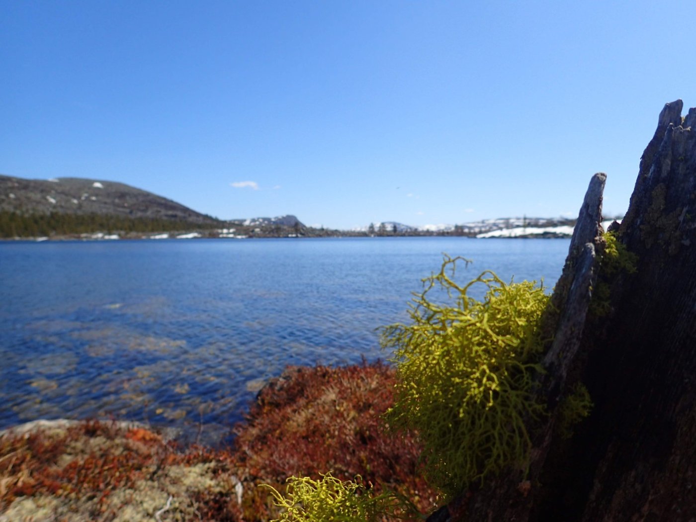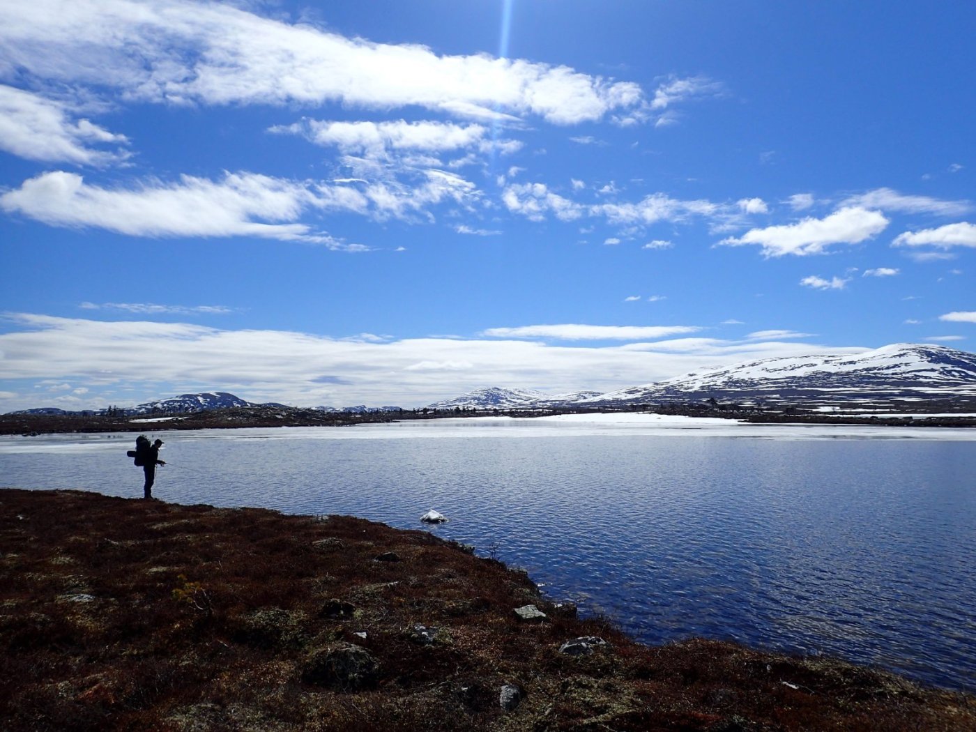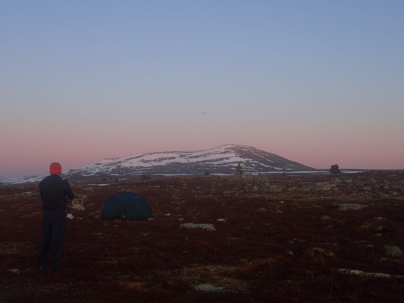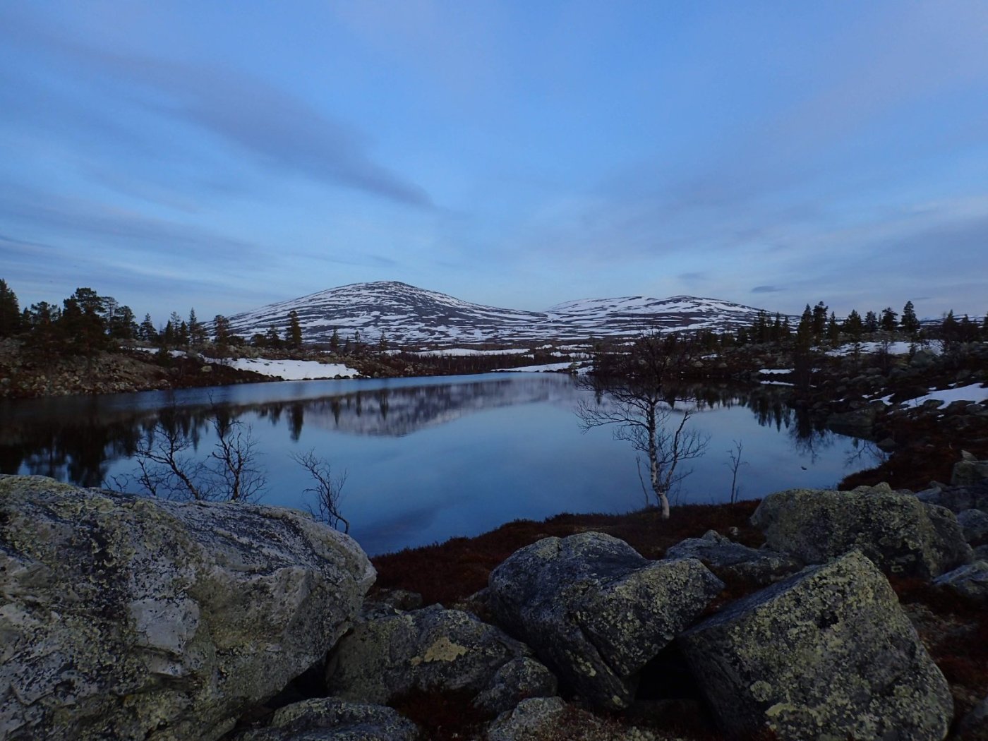 Nå som vi er inne i den mørkeste tida av året passer det kanskje med noen bilder fra vår og tidligsommer i Femundsmarka. Turen i månedsskiftet mai/juni 2021 var min 9. og foreløpig siste tur innover i Femundsmarka. Som alltid er man litt usikker på vær og føre når man drar så tidlig, men vi fikk marka helt for oss selv, og virkelig noe i nærheten av en drømmetur. I hvert fall huskes det sånn når man ser på bildene såpass lenge etterpå. Her følger en bildetung og for øvrig kortfattet rapport fra turen. Avreise fra Jonasvollen sent på kvelden 28. mai. Over Femunden, opp på Røvolfjellet, og videre ned mot Røa. Trekvart kilo harr på første kast. Oppover langs Røa første dag, etter en kald natt og en lang morgen med mange kopper kaffe. Andre kveld og natt tilbringes ved Midtrøsta, ved foten av Kratlvola. Henning drar opp indrefilet av hjort, bearnaisesaus og øl fra sekken. Du verden som vi koste oss. Langt nede mellom noen store steiner finner jeg tilfeldigvis noe som ser ut som et gammelt syltetøyglass med små fisk inni. Vi spekulerer lenge og vel på hva dette kan være, men finner ikke noe svar. Fisken er rimelig godt bevart. Etter hjemkomst er jeg i kontakt med fjellstyret, men de er også blanke. Noen som vet? Videre i kronglete terreng over mot Kratlan, via Voltjønnan. Fra disse høydene får man et nytt perspektiv på marka. Favorittutsikten min, østover fra Kratlvoltangen. Fremdeles noe is på Vonsjøen. Neste natt tilbringes ved Halvkoitjønna. Ved ankomst er jeg så varm at jeg rett og slett må ta et bad. Temperaturen er slett ikke ille med tanke på at vi fremdeles skriver mai. I en bålgrue ved tjønna er det lagt igjen masse senerester. Der har en rype viklet seg inn og endt sine dager. Hva skal man si om slikt? Ubetenksomhet, dumskap, vond vilje? Jeg snakker da naturligvis ikke om rypa, men om mennesket som ikke brant opp eller tok med seg sena si. Særdeles unødvendig. Jeg sender bildet til fjellstyret og de lager en liten sak på det på nettsida for å vise hva som kan være konsekvensen av å bruke bålgrua som søppelplass. Nydelig vårkveld i Grøtådalen. Hoggorm har jeg aldri sett i Femundsmarka før. Ved Stortjønna biter omsider fisken. Det har vært steindødt hele veien opp langs Røa, i Kratlan og ved Halvkoitjønna. Så er tiden omsider kommet for min første virkelig store fiskeopplevelse i Femundsmarka, etter 8 år. Når vi kommer ned fra Grantjønna til Grøtåa bytter jeg til mark og dupp. Vi skal fiske oss nedover mot Krokethåen. Det første jeg gjør er å slenge duppen opp i nærmeste furu, slik at jeg må slite den bort. I middels stor frustrasjon hiver jeg på noe metall på sena og begynner å slenge litt umotivert mens vi beveger oss nedover. I et av de «kjedelige» partiene av elva hogger det til. Jeg kjenner fort at det ikke er snakk om den vanlige to-hektosfisken. Etter en bortimot fem minutter lang kamp med hjertet i halsen kan jeg endelig triumfere. Nokså akkurat kiloen, i hvert fall så nært at jeg kan si at jeg har bikket kilosgrensa. Kilosfisk er nokså dagligdags i marka, men å ta den såpass langt opp i Grøtåa så tidlig i sesongen synes jeg er veldig gøy. Jeg snur meg og takker Grøtåa og Kratlvola for opplevelsen og fortsetter på lette bein nedover. Siste natt tar vi ved Korstjønna. Få steder på jorda har vakrere solnedganger enn Korstjønna. Kjøring av fisk med samtidig tannpuss. Også siste dag byr på knall sommervær. Snakk om full klaff. Ned mot Haugen hvor vi skal bli hentet. Takk for nå!