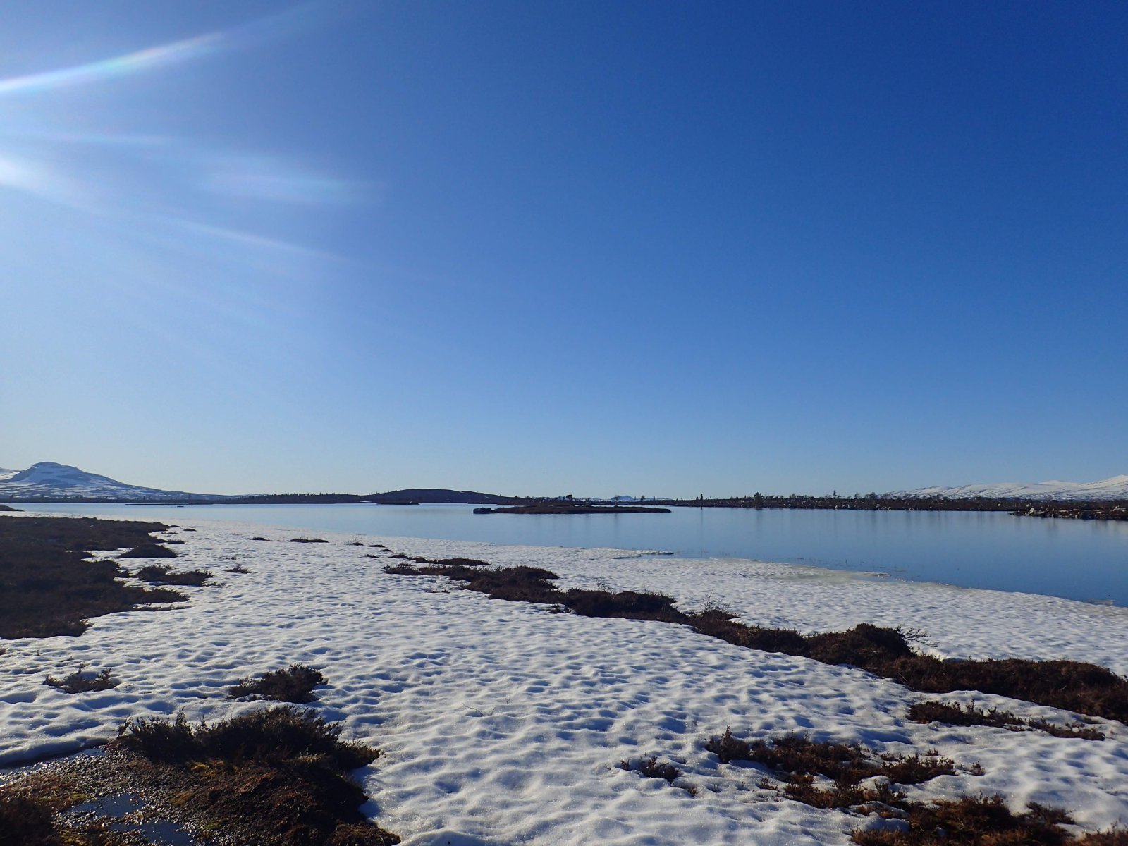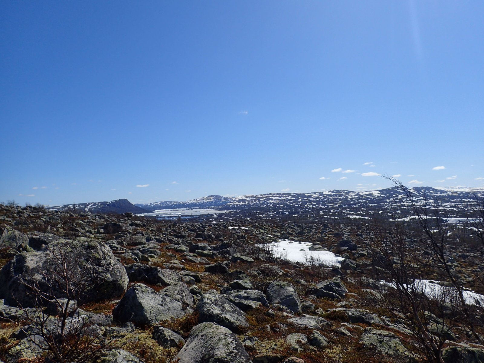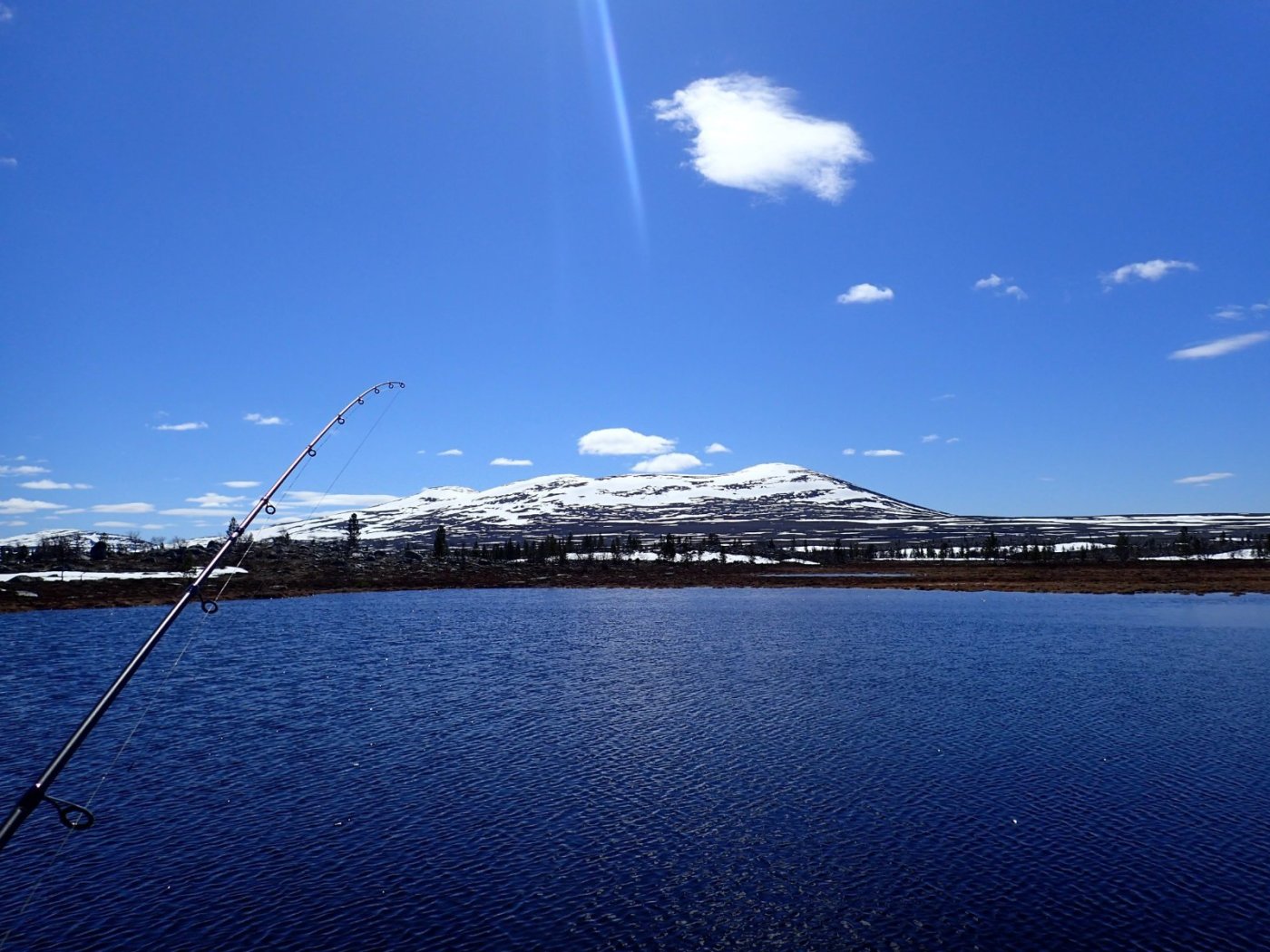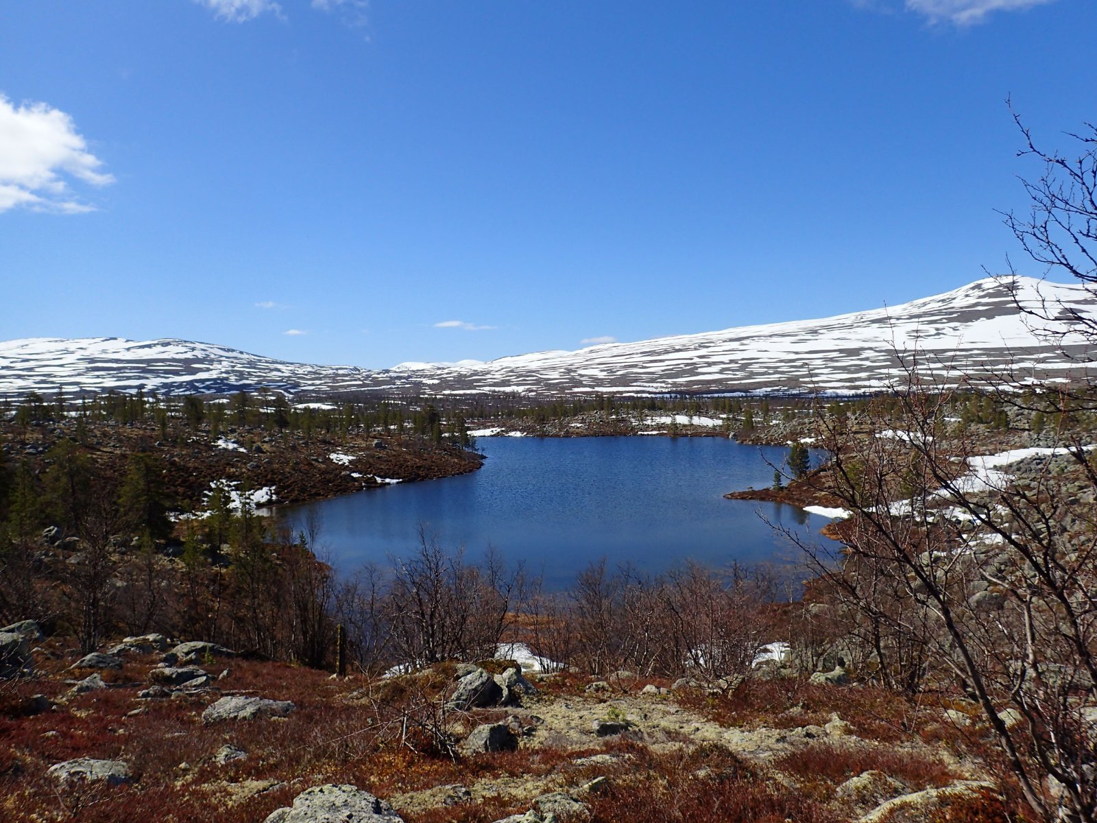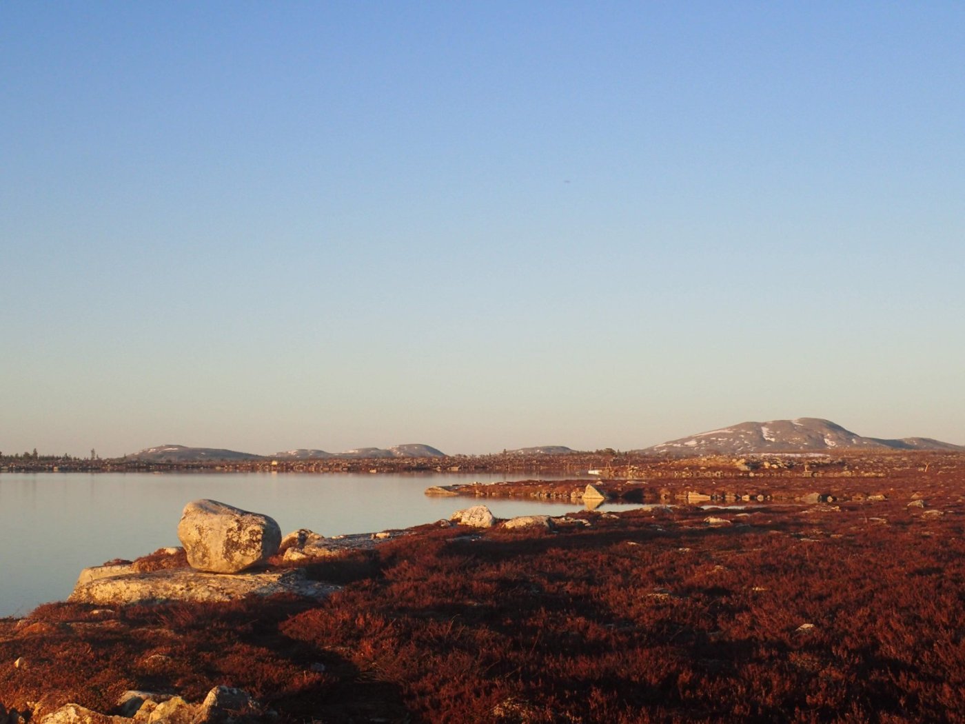 Nå som vi er inne i den mørkeste tida av året passer det kanskje med noen bilder fra vår og tidligsommer i Femundsmarka. Turen i månedsskiftet mai/juni 2021 var min 9. og foreløpig siste tur innover i Femundsmarka. Som alltid er man litt usikker på vær og føre når man drar så tidlig, men vi fikk marka helt for oss selv, og virkelig noe i nærheten av en drømmetur. I hvert fall huskes det sånn når man ser på bildene såpass lenge etterpå. Her følger en bildetung og for øvrig kortfattet rapport fra turen. Avreise fra Jonasvollen sent på kvelden 28. mai. Over Femunden, opp på Røvolfjellet, og videre ned mot Røa. Trekvart kilo harr på første kast. Oppover langs Røa første dag, etter en kald natt og en lang morgen med mange kopper kaffe. Andre kveld og natt tilbringes ved Midtrøsta, ved foten av Kratlvola. Henning drar opp indrefilet av hjort, bearnaisesaus og øl fra sekken. Du verden som vi koste oss. Langt nede mellom noen store steiner finner jeg tilfeldigvis noe som ser ut som et gammelt syltetøyglass med små fisk inni. Vi spekulerer lenge og vel på hva dette kan være, men finner ikke noe svar. Fisken er rimelig godt bevart. Etter hjemkomst er jeg i kontakt med fjellstyret, men de er også blanke. Noen som vet? Videre i kronglete terreng over mot Kratlan, via Voltjønnan. Fra disse høydene får man et nytt perspektiv på marka. Favorittutsikten min, østover fra Kratlvoltangen. Fremdeles noe is på Vonsjøen. Neste natt tilbringes ved Halvkoitjønna. Ved ankomst er jeg så varm at jeg rett og slett må ta et bad. Temperaturen er slett ikke ille med tanke på at vi fremdeles skriver mai. I en bålgrue ved tjønna er det lagt igjen masse senerester. Der har en rype viklet seg inn og endt sine dager. Hva skal man si om slikt? Ubetenksomhet, dumskap, vond vilje? Jeg snakker da naturligvis ikke om rypa, men om mennesket som ikke brant opp eller tok med seg sena si. Særdeles unødvendig. Jeg sender bildet til fjellstyret og de lager en liten sak på det på nettsida for å vise hva som kan være konsekvensen av å bruke bålgrua som søppelplass. Nydelig vårkveld i Grøtådalen. Hoggorm har jeg aldri sett i Femundsmarka før. Ved Stortjønna biter omsider fisken. Det har vært steindødt hele veien opp langs Røa, i Kratlan og ved Halvkoitjønna. Så er tiden omsider kommet for min første virkelig store fiskeopplevelse i Femundsmarka, etter 8 år. Når vi kommer ned fra Grantjønna til Grøtåa bytter jeg til mark og dupp. Vi skal fiske oss nedover mot Krokethåen. Det første jeg gjør er å slenge duppen opp i nærmeste furu, slik at jeg må slite den bort. I middels stor frustrasjon hiver jeg på noe metall på sena og begynner å slenge litt umotivert mens vi beveger oss nedover. I et av de «kjedelige» partiene av elva hogger det til. Jeg kjenner fort at det ikke er snakk om den vanlige to-hektosfisken. Etter en bortimot fem minutter lang kamp med hjertet i halsen kan jeg endelig triumfere. Nokså akkurat kiloen, i hvert fall så nært at jeg kan si at jeg har bikket kilosgrensa. Kilosfisk er nokså dagligdags i marka, men å ta den såpass langt opp i Grøtåa så tidlig i sesongen synes jeg er veldig gøy. Jeg snur meg og takker Grøtåa og Kratlvola for opplevelsen og fortsetter på lette bein nedover. Siste natt tar vi ved Korstjønna. Få steder på jorda har vakrere solnedganger enn Korstjønna. Kjøring av fisk med samtidig tannpuss. Også siste dag byr på knall sommervær. Snakk om full klaff. Ned mot Haugen hvor vi skal bli hentet. Takk for nå!