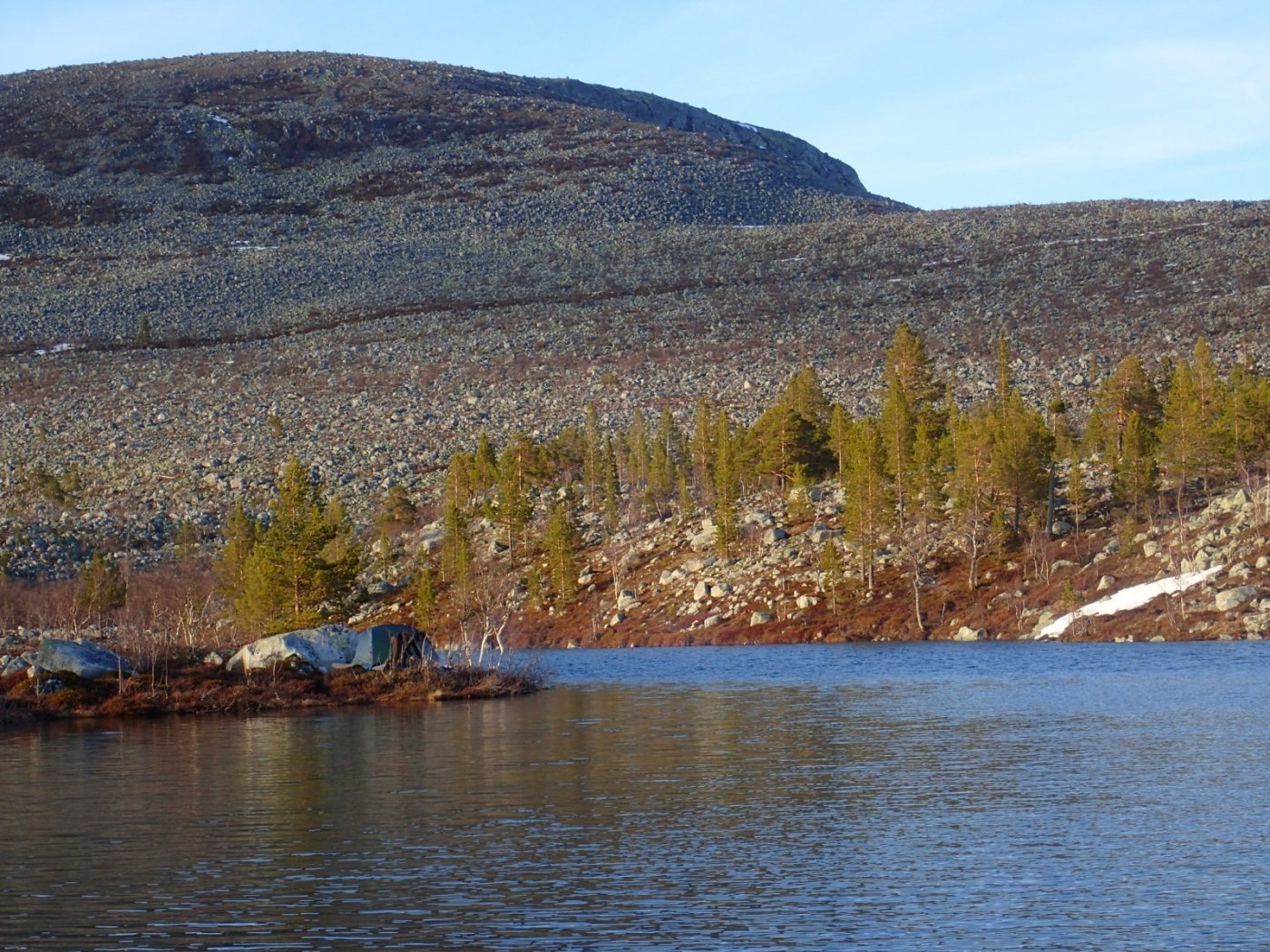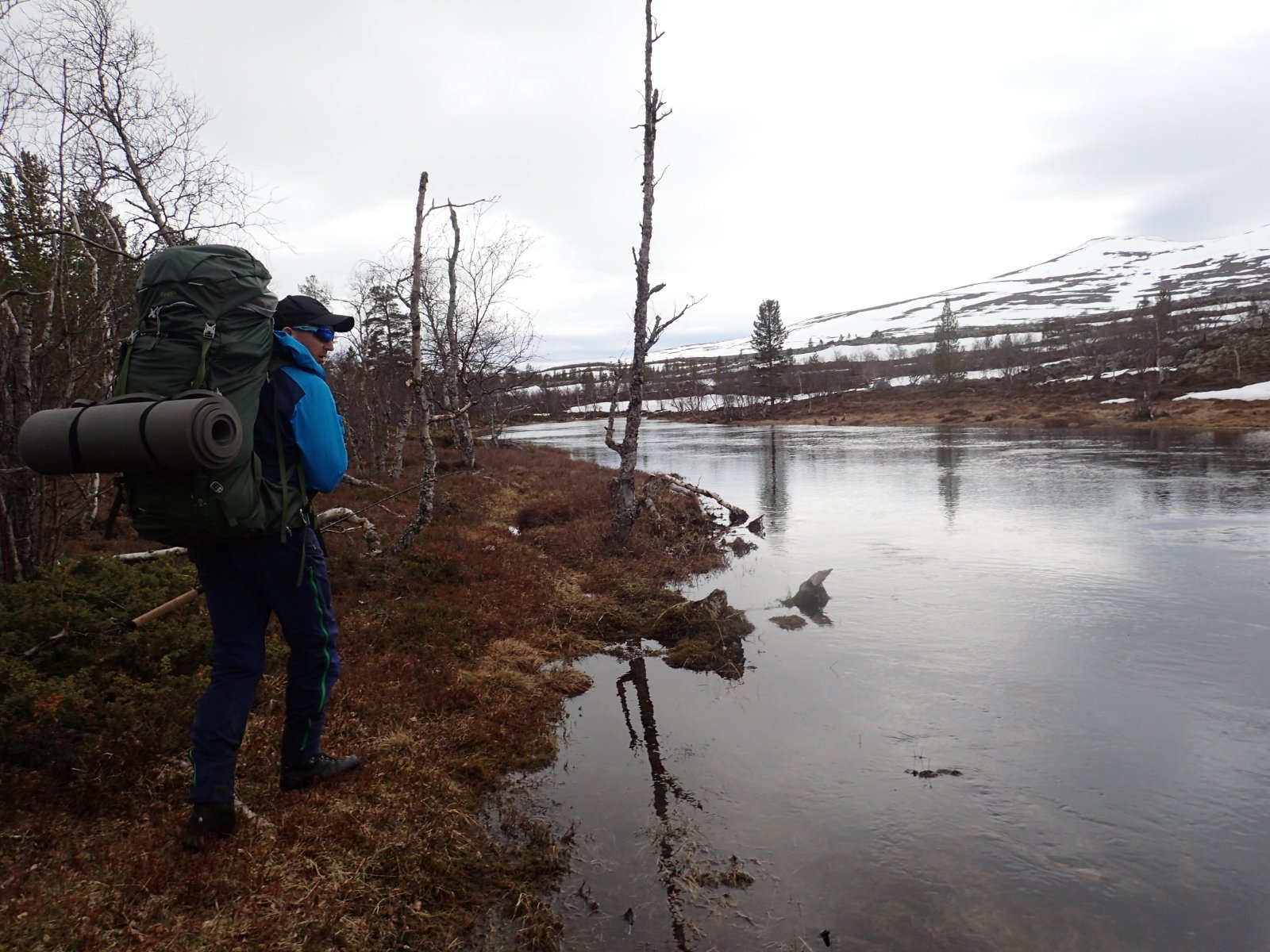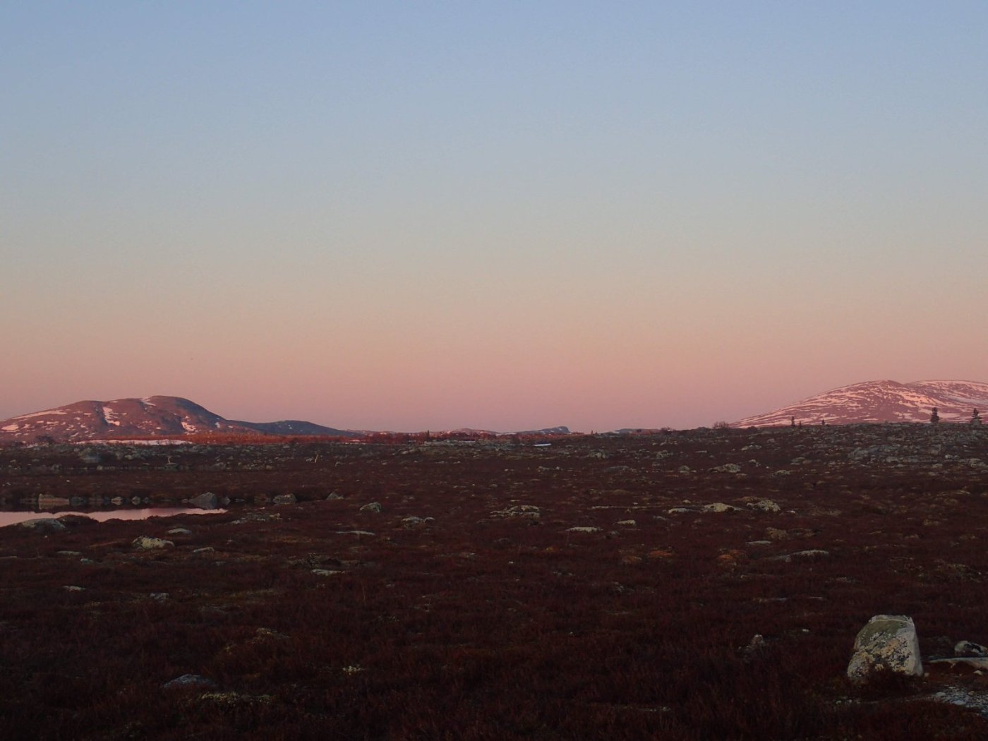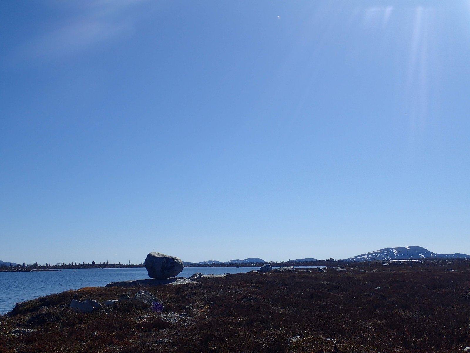 Nå som vi er inne i den mørkeste tida av året passer det kanskje med noen bilder fra vår og tidligsommer i Femundsmarka. Turen i månedsskiftet mai/juni 2021 var min 9. og foreløpig siste tur innover i Femundsmarka. Som alltid er man litt usikker på vær og føre når man drar så tidlig, men vi fikk marka helt for oss selv, og virkelig noe i nærheten av en drømmetur. I hvert fall huskes det sånn når man ser på bildene såpass lenge etterpå. Her følger en bildetung og for øvrig kortfattet rapport fra turen. Avreise fra Jonasvollen sent på kvelden 28. mai. Over Femunden, opp på Røvolfjellet, og videre ned mot Røa. Trekvart kilo harr på første kast. Oppover langs Røa første dag, etter en kald natt og en lang morgen med mange kopper kaffe. Andre kveld og natt tilbringes ved Midtrøsta, ved foten av Kratlvola. Henning drar opp indrefilet av hjort, bearnaisesaus og øl fra sekken. Du verden som vi koste oss. Langt nede mellom noen store steiner finner jeg tilfeldigvis noe som ser ut som et gammelt syltetøyglass med små fisk inni. Vi spekulerer lenge og vel på hva dette kan være, men finner ikke noe svar. Fisken er rimelig godt bevart. Etter hjemkomst er jeg i kontakt med fjellstyret, men de er også blanke. Noen som vet? Videre i kronglete terreng over mot Kratlan, via Voltjønnan. Fra disse høydene får man et nytt perspektiv på marka. Favorittutsikten min, østover fra Kratlvoltangen. Fremdeles noe is på Vonsjøen. Neste natt tilbringes ved Halvkoitjønna. Ved ankomst er jeg så varm at jeg rett og slett må ta et bad. Temperaturen er slett ikke ille med tanke på at vi fremdeles skriver mai. I en bålgrue ved tjønna er det lagt igjen masse senerester. Der har en rype viklet seg inn og endt sine dager. Hva skal man si om slikt? Ubetenksomhet, dumskap, vond vilje? Jeg snakker da naturligvis ikke om rypa, men om mennesket som ikke brant opp eller tok med seg sena si. Særdeles unødvendig. Jeg sender bildet til fjellstyret og de lager en liten sak på det på nettsida for å vise hva som kan være konsekvensen av å bruke bålgrua som søppelplass. Nydelig vårkveld i Grøtådalen. Hoggorm har jeg aldri sett i Femundsmarka før. Ved Stortjønna biter omsider fisken. Det har vært steindødt hele veien opp langs Røa, i Kratlan og ved Halvkoitjønna. Så er tiden omsider kommet for min første virkelig store fiskeopplevelse i Femundsmarka, etter 8 år. Når vi kommer ned fra Grantjønna til Grøtåa bytter jeg til mark og dupp. Vi skal fiske oss nedover mot Krokethåen. Det første jeg gjør er å slenge duppen opp i nærmeste furu, slik at jeg må slite den bort. I middels stor frustrasjon hiver jeg på noe metall på sena og begynner å slenge litt umotivert mens vi beveger oss nedover. I et av de «kjedelige» partiene av elva hogger det til. Jeg kjenner fort at det ikke er snakk om den vanlige to-hektosfisken. Etter en bortimot fem minutter lang kamp med hjertet i halsen kan jeg endelig triumfere. Nokså akkurat kiloen, i hvert fall så nært at jeg kan si at jeg har bikket kilosgrensa. Kilosfisk er nokså dagligdags i marka, men å ta den såpass langt opp i Grøtåa så tidlig i sesongen synes jeg er veldig gøy. Jeg snur meg og takker Grøtåa og Kratlvola for opplevelsen og fortsetter på lette bein nedover. Siste natt tar vi ved Korstjønna. Få steder på jorda har vakrere solnedganger enn Korstjønna. Kjøring av fisk med samtidig tannpuss. Også siste dag byr på knall sommervær. Snakk om full klaff. Ned mot Haugen hvor vi skal bli hentet. Takk for nå!