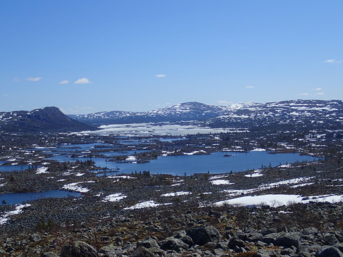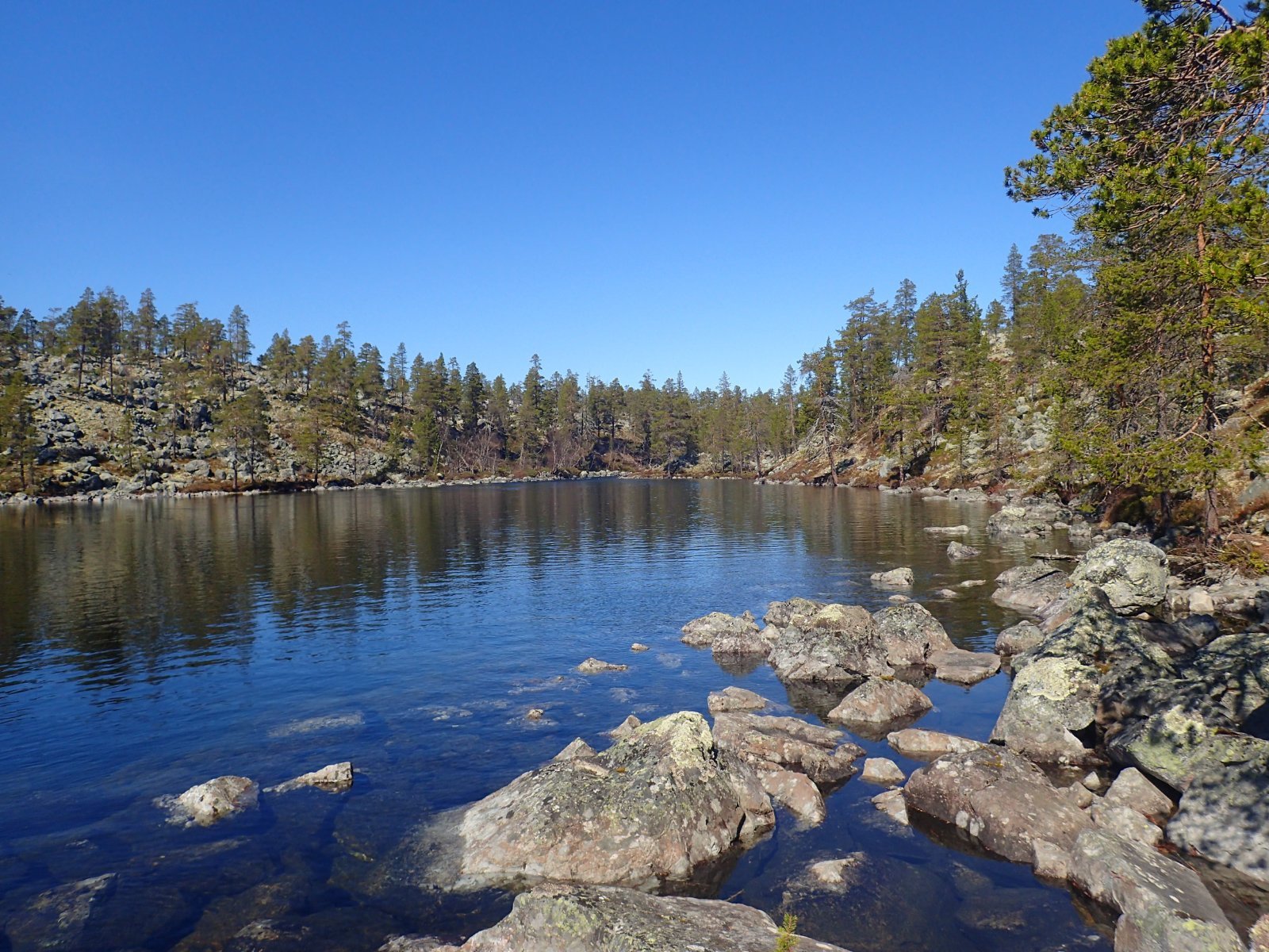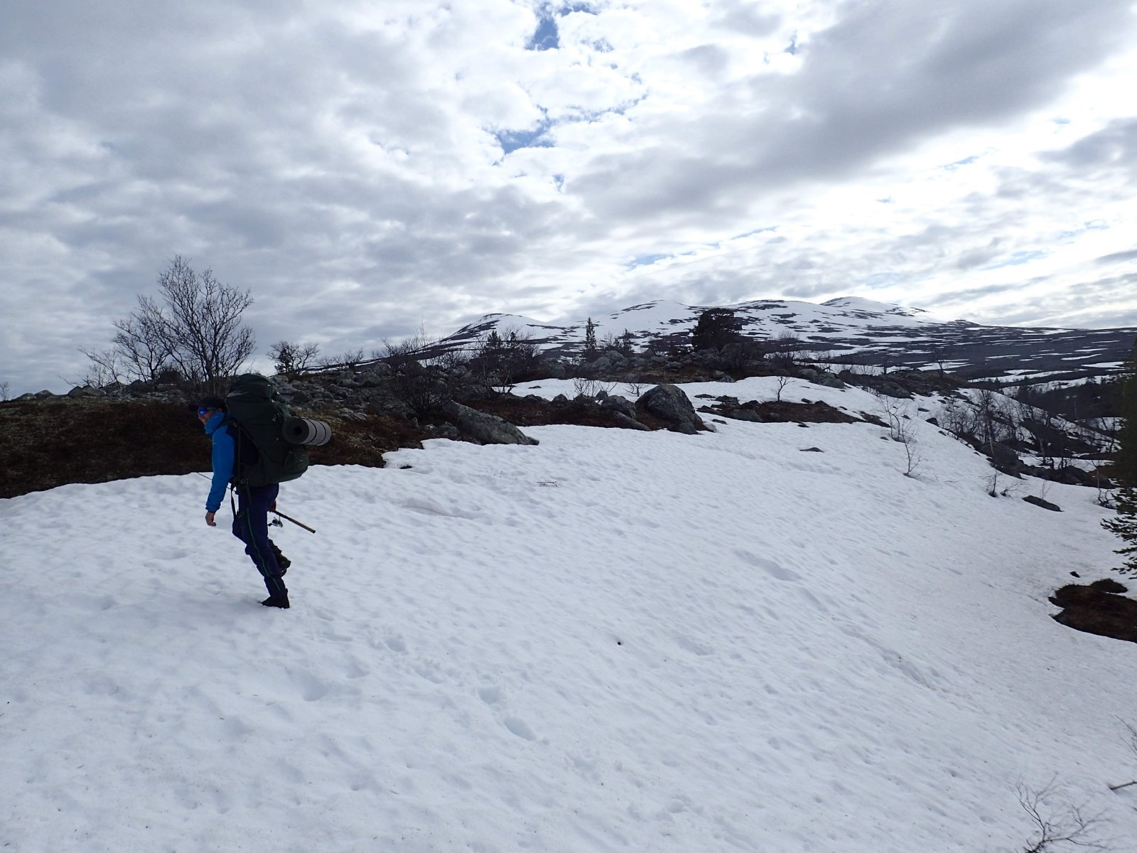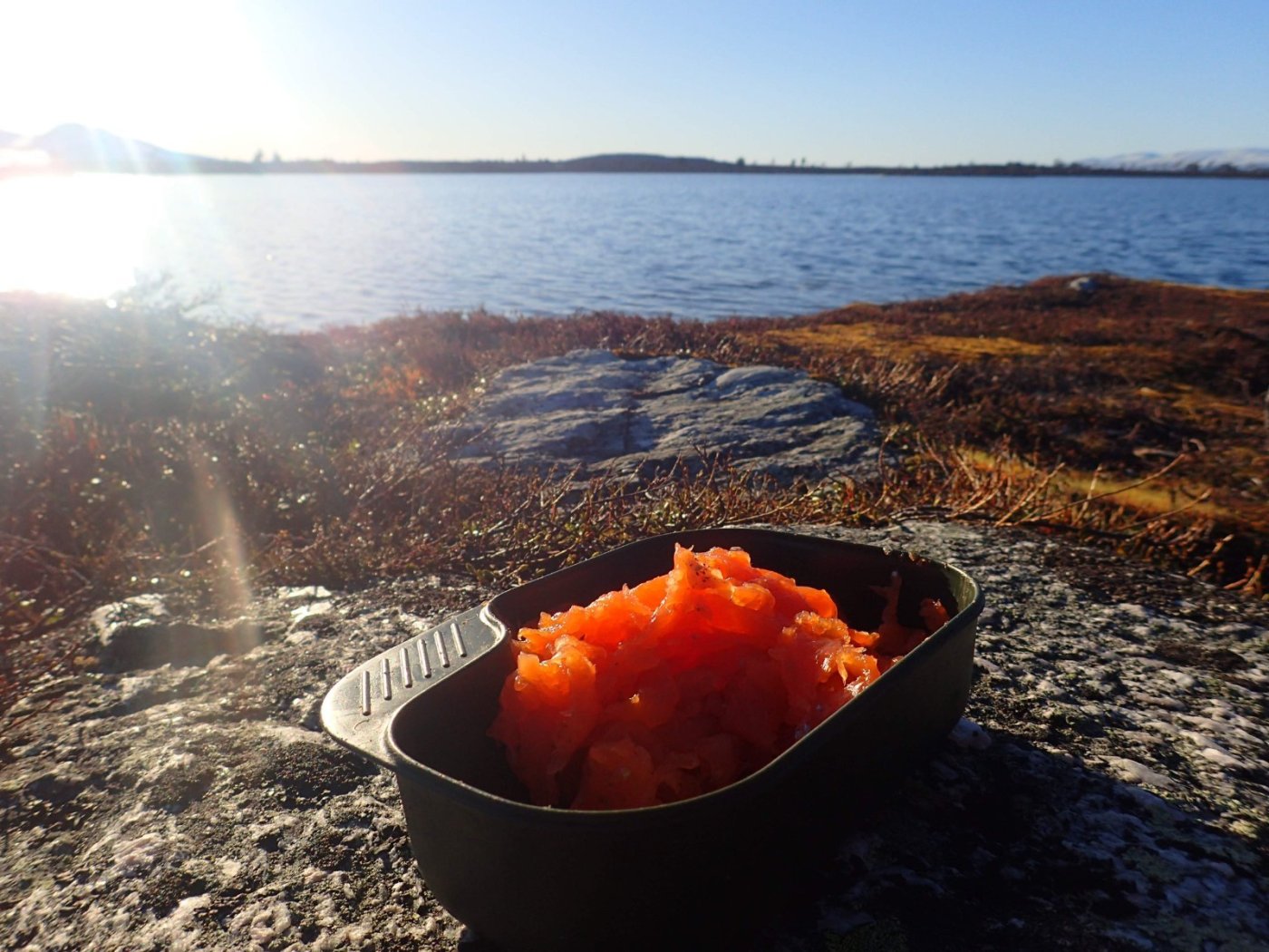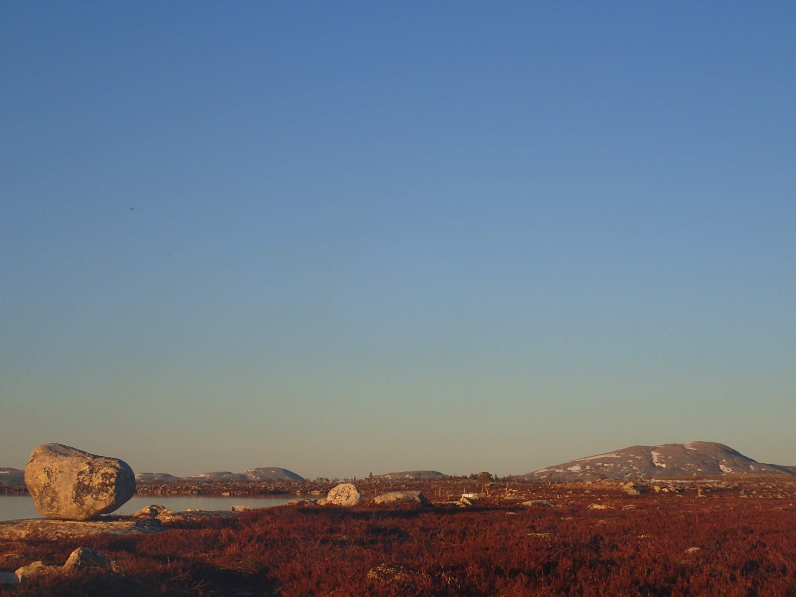 Nå som vi er inne i den mørkeste tida av året passer det kanskje med noen bilder fra vår og tidligsommer i Femundsmarka. Turen i månedsskiftet mai/juni 2021 var min 9. og foreløpig siste tur innover i Femundsmarka. Som alltid er man litt usikker på vær og føre når man drar så tidlig, men vi fikk marka helt for oss selv, og virkelig noe i nærheten av en drømmetur. I hvert fall huskes det sånn når man ser på bildene såpass lenge etterpå. Her følger en bildetung og for øvrig kortfattet rapport fra turen. Avreise fra Jonasvollen sent på kvelden 28. mai. Over Femunden, opp på Røvolfjellet, og videre ned mot Røa. Trekvart kilo harr på første kast. Oppover langs Røa første dag, etter en kald natt og en lang morgen med mange kopper kaffe. Andre kveld og natt tilbringes ved Midtrøsta, ved foten av Kratlvola. Henning drar opp indrefilet av hjort, bearnaisesaus og øl fra sekken. Du verden som vi koste oss. Langt nede mellom noen store steiner finner jeg tilfeldigvis noe som ser ut som et gammelt syltetøyglass med små fisk inni. Vi spekulerer lenge og vel på hva dette kan være, men finner ikke noe svar. Fisken er rimelig godt bevart. Etter hjemkomst er jeg i kontakt med fjellstyret, men de er også blanke. Noen som vet? Videre i kronglete terreng over mot Kratlan, via Voltjønnan. Fra disse høydene får man et nytt perspektiv på marka. Favorittutsikten min, østover fra Kratlvoltangen. Fremdeles noe is på Vonsjøen. Neste natt tilbringes ved Halvkoitjønna. Ved ankomst er jeg så varm at jeg rett og slett må ta et bad. Temperaturen er slett ikke ille med tanke på at vi fremdeles skriver mai. I en bålgrue ved tjønna er det lagt igjen masse senerester. Der har en rype viklet seg inn og endt sine dager. Hva skal man si om slikt? Ubetenksomhet, dumskap, vond vilje? Jeg snakker da naturligvis ikke om rypa, men om mennesket som ikke brant opp eller tok med seg sena si. Særdeles unødvendig. Jeg sender bildet til fjellstyret og de lager en liten sak på det på nettsida for å vise hva som kan være konsekvensen av å bruke bålgrua som søppelplass. Nydelig vårkveld i Grøtådalen. Hoggorm har jeg aldri sett i Femundsmarka før. Ved Stortjønna biter omsider fisken. Det har vært steindødt hele veien opp langs Røa, i Kratlan og ved Halvkoitjønna. Så er tiden omsider kommet for min første virkelig store fiskeopplevelse i Femundsmarka, etter 8 år. Når vi kommer ned fra Grantjønna til Grøtåa bytter jeg til mark og dupp. Vi skal fiske oss nedover mot Krokethåen. Det første jeg gjør er å slenge duppen opp i nærmeste furu, slik at jeg må slite den bort. I middels stor frustrasjon hiver jeg på noe metall på sena og begynner å slenge litt umotivert mens vi beveger oss nedover. I et av de «kjedelige» partiene av elva hogger det til. Jeg kjenner fort at det ikke er snakk om den vanlige to-hektosfisken. Etter en bortimot fem minutter lang kamp med hjertet i halsen kan jeg endelig triumfere. Nokså akkurat kiloen, i hvert fall så nært at jeg kan si at jeg har bikket kilosgrensa. Kilosfisk er nokså dagligdags i marka, men å ta den såpass langt opp i Grøtåa så tidlig i sesongen synes jeg er veldig gøy. Jeg snur meg og takker Grøtåa og Kratlvola for opplevelsen og fortsetter på lette bein nedover. Siste natt tar vi ved Korstjønna. Få steder på jorda har vakrere solnedganger enn Korstjønna. Kjøring av fisk med samtidig tannpuss. Også siste dag byr på knall sommervær. Snakk om full klaff. Ned mot Haugen hvor vi skal bli hentet. Takk for nå!